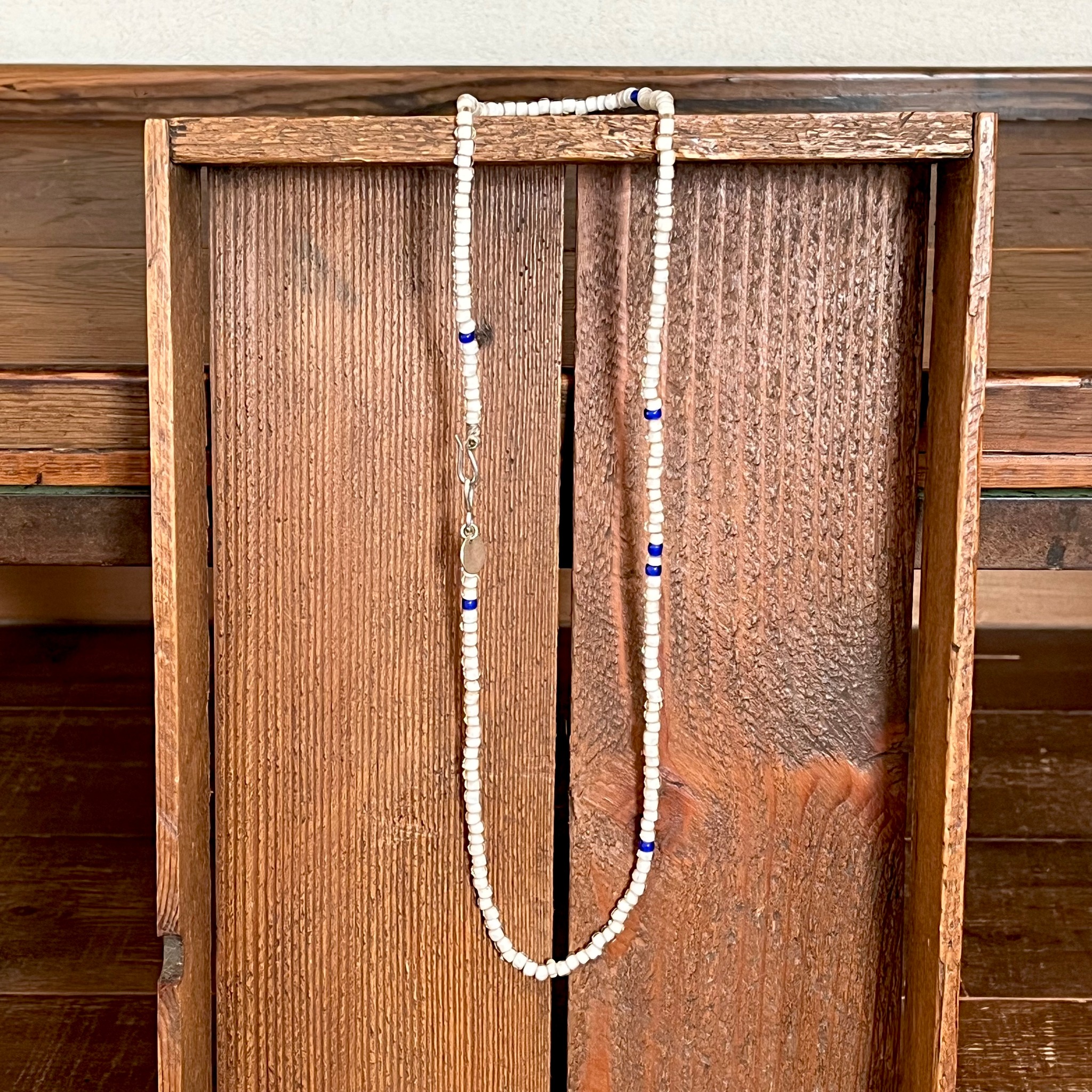大まかにですが、2タイプあって、普通に着けて頂くと見た目シンプルと言いますか、下の方にあまり色飛びしていない、ほぼ白いビーズのネックレスに見えるタイプ。このタイプは、極力洋服を邪魔しないと言ったら変な感じかもしれませんが、兎に角シンプル重視。
