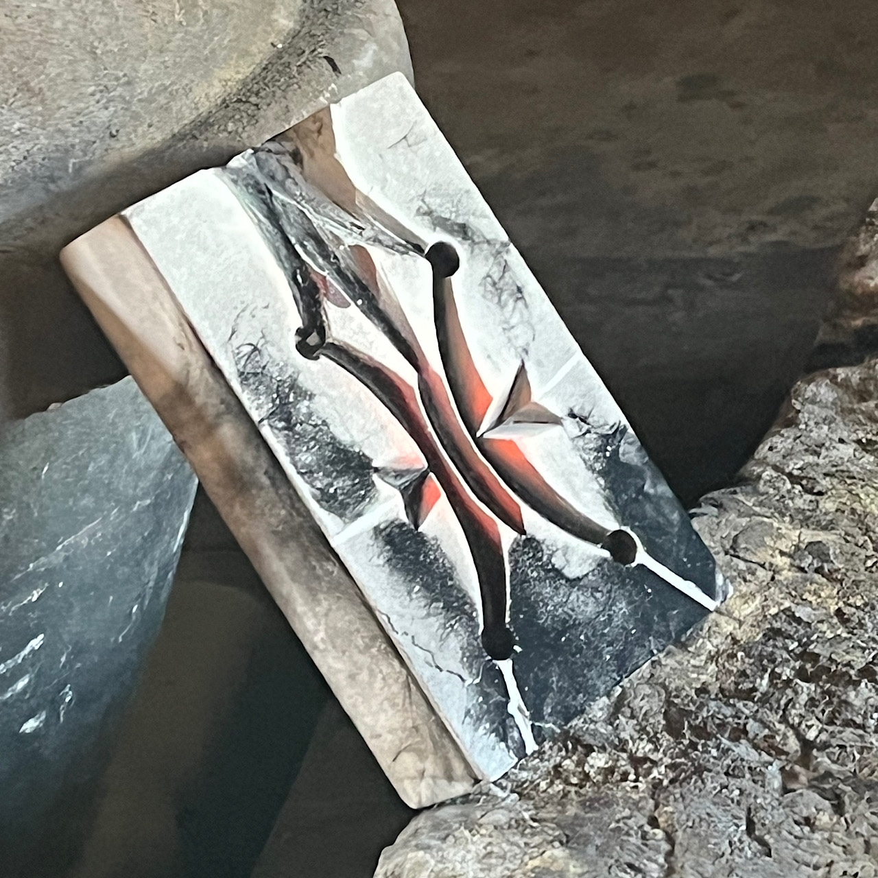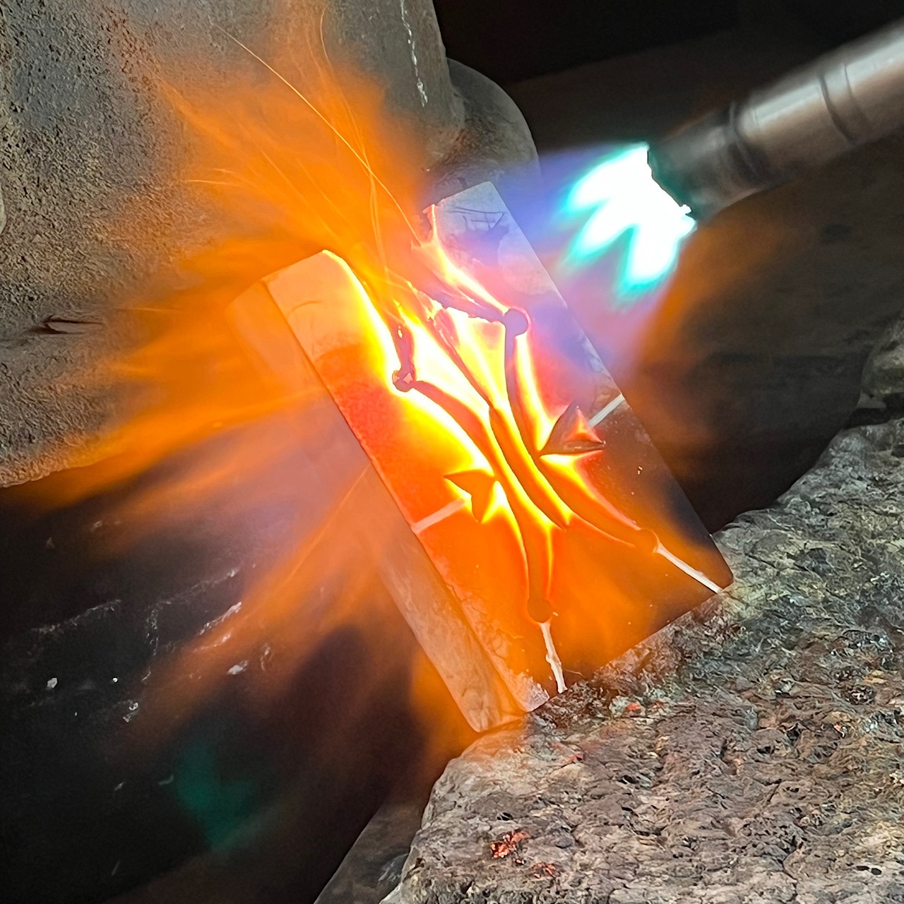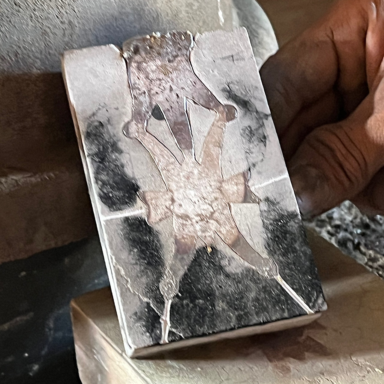 自分が見せて頂いたのは、1点のトップ部分のここまで、あとはブレスレット部分もトゥファストーンを削って頂き、最終的にロウ付けして出来上がります。