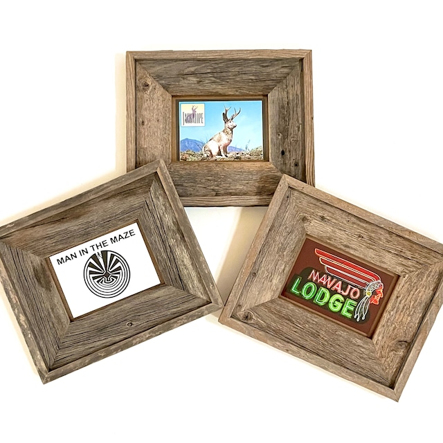 -     【Barn Wood Frame (5×7inch)】+【Postcard】+【Glass】Set ¥7,920 【Barn Wood Frame (5×7inch)】+【Postcard】+【Glass】Set バーンウッドフレーム(5×7inch)、ポストカード、5×7inchサイズ対応のガラスがセットになった商品です。 ★ウサギの体に鹿の角が生えた伝説の未確認動物、ジャッカロープ(Jackalope)のポストカード、今から20年ほど前に作られたポストカードかと思われます。 ★アメリカ・アリゾナ州プレスコットにあるアンティークショップにドーンと飾られているインディアンのネオンサイン(NAVAJO LODGE)、そのアンティークショップのオリジナルのポストカード ★ホピのデザインでお馴染みのマンインザメイズ(MAN IN THE MAZE)、迷路や人生と言った意味合いがあり、デザイン的にもカッコよくホピのインディアンジュエリーで見た事のある方も多いのではないでしょうか。今から20年ほど前に作られたポストカードかと思われます。 ガラスは、バーンウッドフレーム5×7inchサイズ対応のガラスです。 セット内容 ★Barn Wood Frame (5×7inch) ★ Postcard 1枚 ★Glass(5×7inch) フレームサイズ ★外寸 : 約 幅 25.8cm 高さ 30.9cm 厚み 2.5cm ★裏面収納約 : 幅 13.0cm 高さ 18.1cm 深さ 0.9cm ★正面の窓 : 約 幅 11.2cm 高さ 16.3cm ★背板の厚み : 約 0.3cm MADE IN U.S.A. Postcard 縦 10.4cm 横 14.9cm ●壁掛けフック、壁掛けハンガーが付属しますが、元々バーンウッドフレーム専用の物ではなく、当店でサービスでお付けしている物になりますので、お好みでご使用ください。 ※素材に、100年近く~100年以上建っていた納屋の古材(バーンウッド)を使用している為、一点一点の表情や色合いが異なります。 実際にお届けするフレームは画像の物と異なりますので、風合い、色味等含め、予めご了承ください。また、キズやスレ、木の凹凸、穴や節などバーンウッドならではの良さとご理解いただき、ご検討いただきますようお願い致します。背板も一点一点色味、質感が異なり、キズや汚れのある物もございますので合わせてお了承ください。 ポストカードにもスレや黄ばみなどあります。