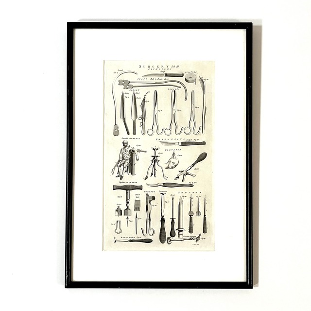 アメリカで買い付けた古い年代のSurgery Toolが描かれた額装になります。 作られた年代は不明となりますが、そこまで古い時代の物ではないと思もわれます。 中には、おそらく1900年代初め頃のだと思われる手術に使われる手術道具が描かれ、アメリカでは、こう言った医療系のアンティーク物も人気があり、また洋服などと同じように年代が新しくなるにつれディテールや機能も進化し、古い時代の道具の美しさを描いたものは貴重でアートとして飾ったりしています。 また、古い年代のツールと名称が共にセンス良く描かれています。 フレームもこのサイズに合わせて特注された木製のフレームを使用していると思われ、ガラスが入ります。 フレームもそこまで古いものではありませんが、存在感も抜群の一品です! サイズ 縦 36.6cm 横 52.2cm 奥行1.6cm 多少の誤差はご了承ください。(USTF001) ※大きなダメージはありませんが、USDE商品の為、キズや擦れ、汚れ、木の欠けなどがあります。古いUSED品ですのでビンテージの経年変化をご理解頂ける方のご購入をお願い致します。 ※尚、見つけた時の状態そのままの雰囲気で販売する為、水拭き程度しか施していませんので、予めご了承ください。