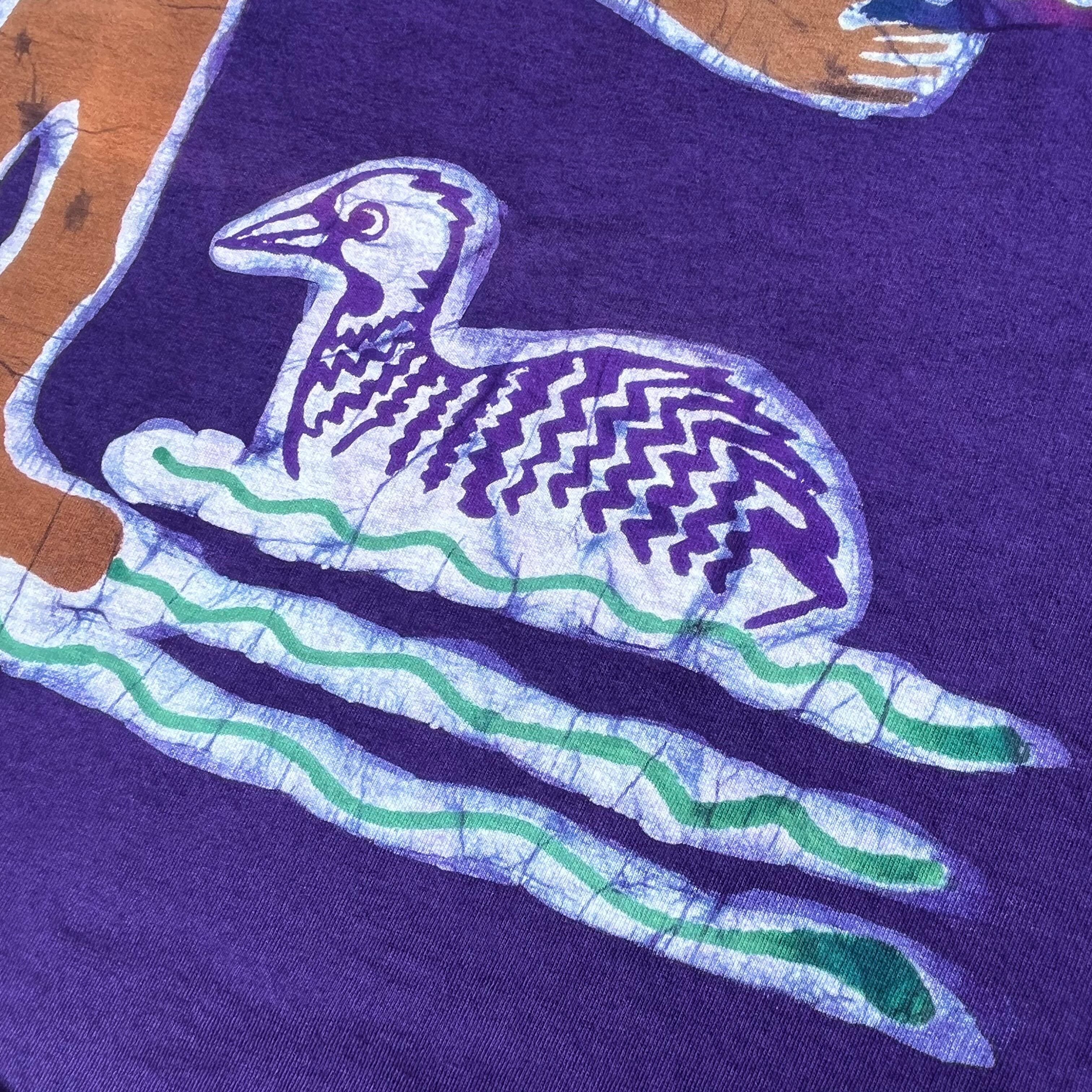 当時アメリカ・ニューメキシコ州在住の女性アーティスト、マリーさんがハンドメイドでプリント、ろうけつ染めを施したTシャツです。
