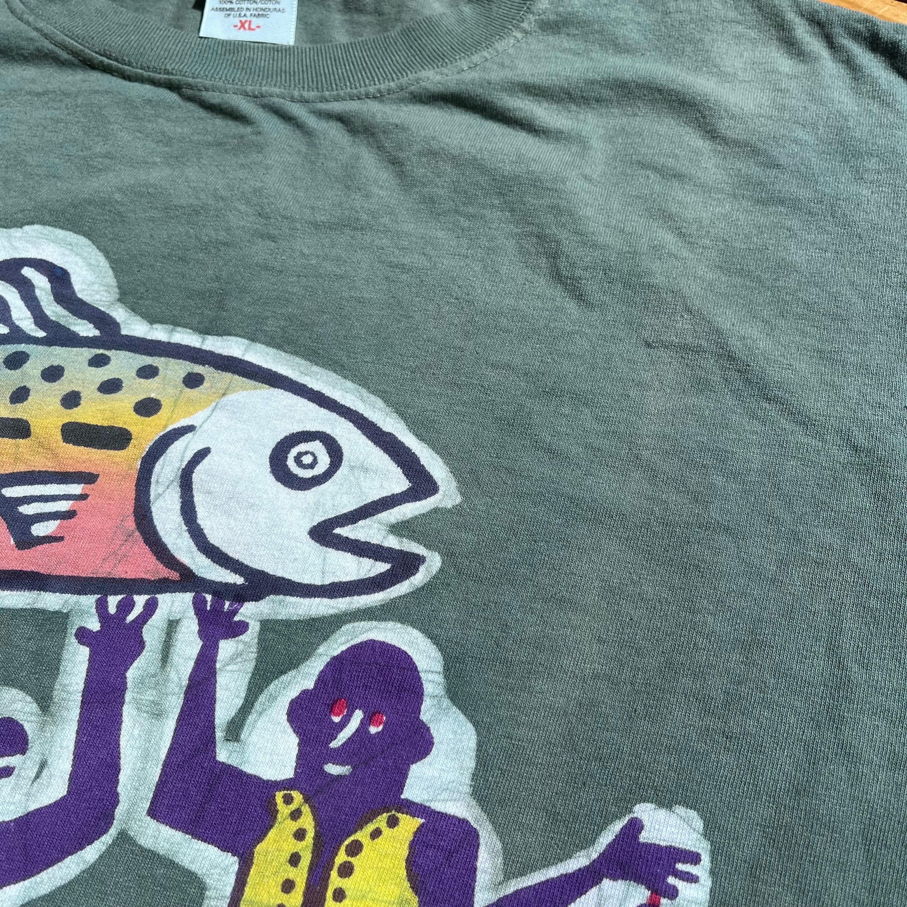 ブリント部分が、“Batik”(ろうけつ染め)のTシャツになり、全てホワイトボディーのTシャツにプリントを施し、その後にプリントの一部に色を入れたり、プリントに合わせ手書きで星や雲、地面などを入れ(雲や魚の吹く泡などは、ロウを塗り、ボディーを後染めした際に色が染まらないように白く残す事で雲や泡を表現しています)、更に全てのプリント部分が仕上がった後にそのプリント部分に対しプリント部分よりもはみ出るようにロウを塗りボディー全体を様々なカラーに後染め、最後にロウを剥がします。
