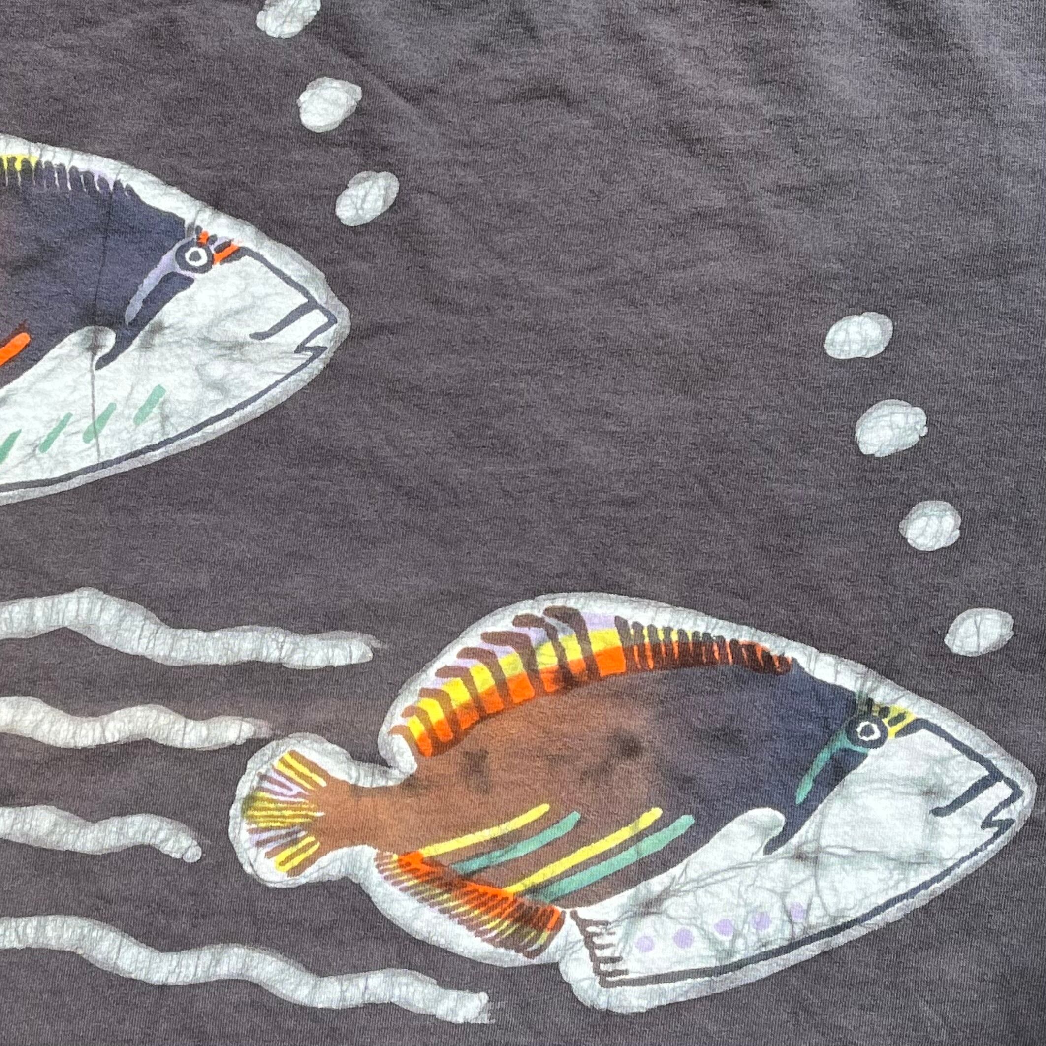 ブリント部分が、“Batik”(ろうけつ染め)のTシャツになり、全てホワイトボディーのTシャツにプリントを施し、その後にプリントの一部に色を入れたり、プリントに合わせ手書きで星や雲、地面などを入れ(雲や魚の吹く泡などは、ロウを塗り、ボディーを後染めした際に色が染まらないように白く残す事で雲や泡を表現しています)、更に全てのプリント部分が仕上がった後にそのプリント部分に対しプリント部分よりもはみ出るようにロウを塗りボディー全体を様々なカラーに後染め、最後にロウを剥がします。