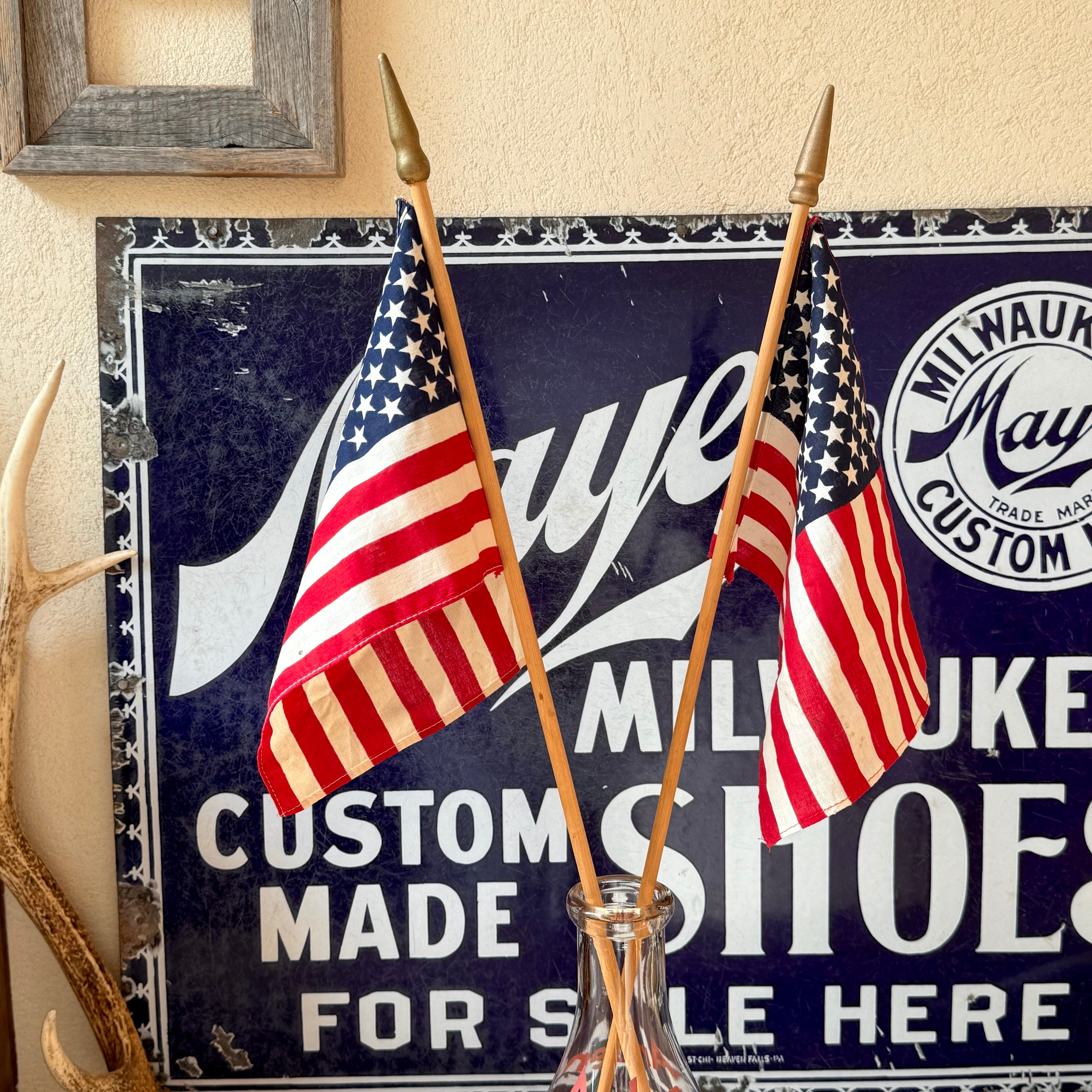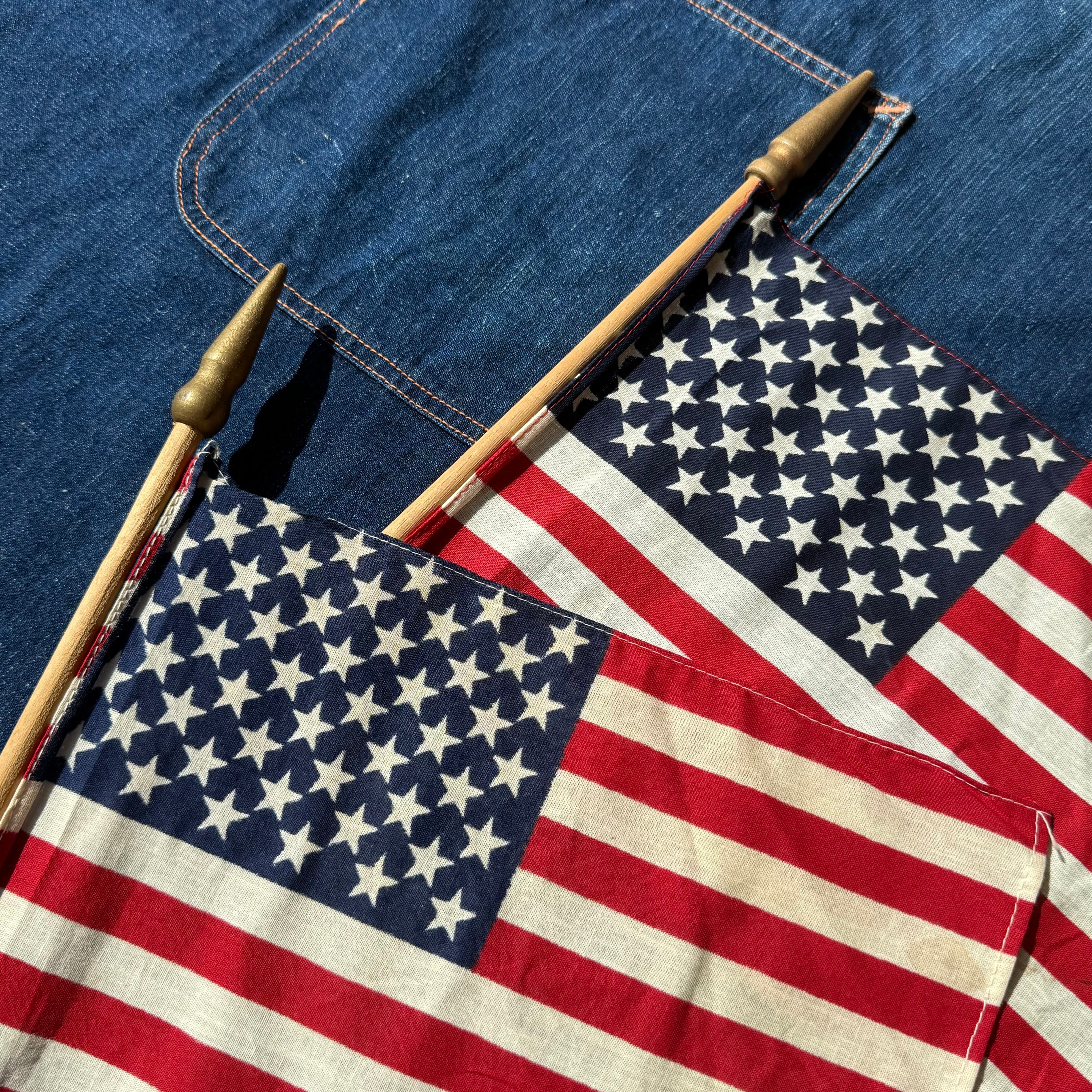 星条旗は、50 STAR フラッグとなり、そこまで古い星条旗ではありませんが、コットン素材にウッドスティックのビンテージのフラッグになります。