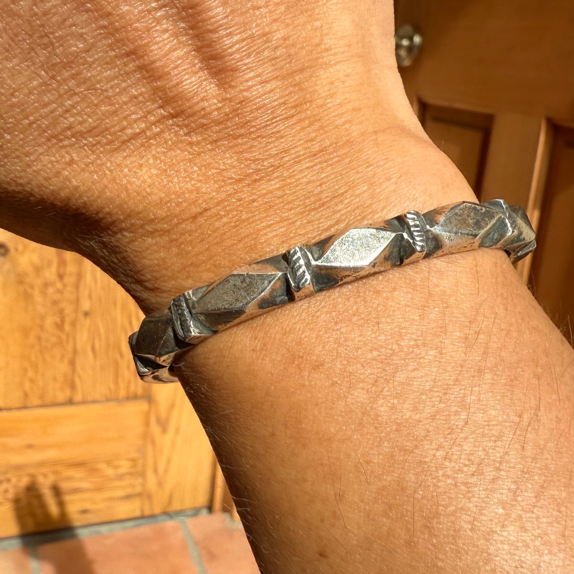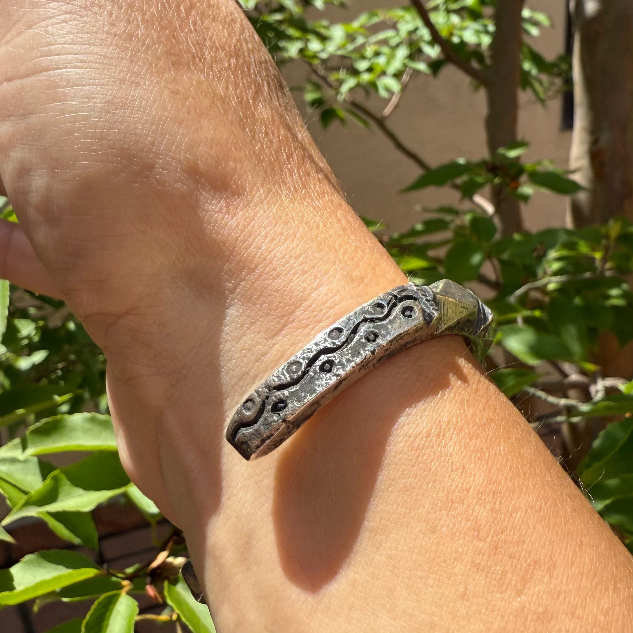厚みのある地金にスタンプを施し、時間をかけて鑢がけし立体感ある造形に仕上げた素晴らしいブレスレットです。