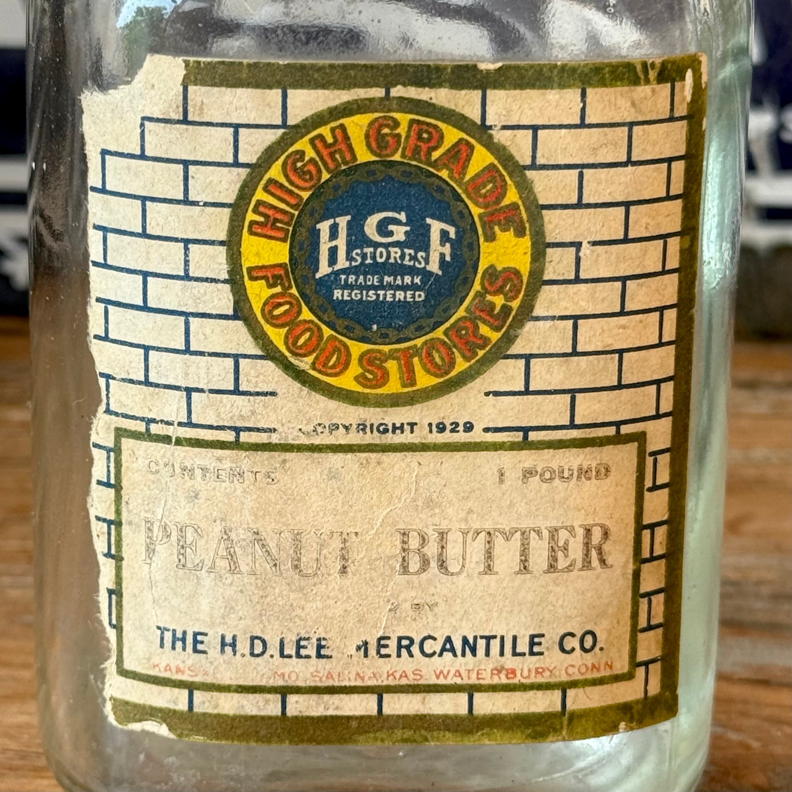 ジーンズメーカーでお馴染みのリーが食品を扱っていた頃の【THE H.D.LEE MERCANTILE CO.】 “HGF” のピーナッツバターが入っていたガラスの容器になります。