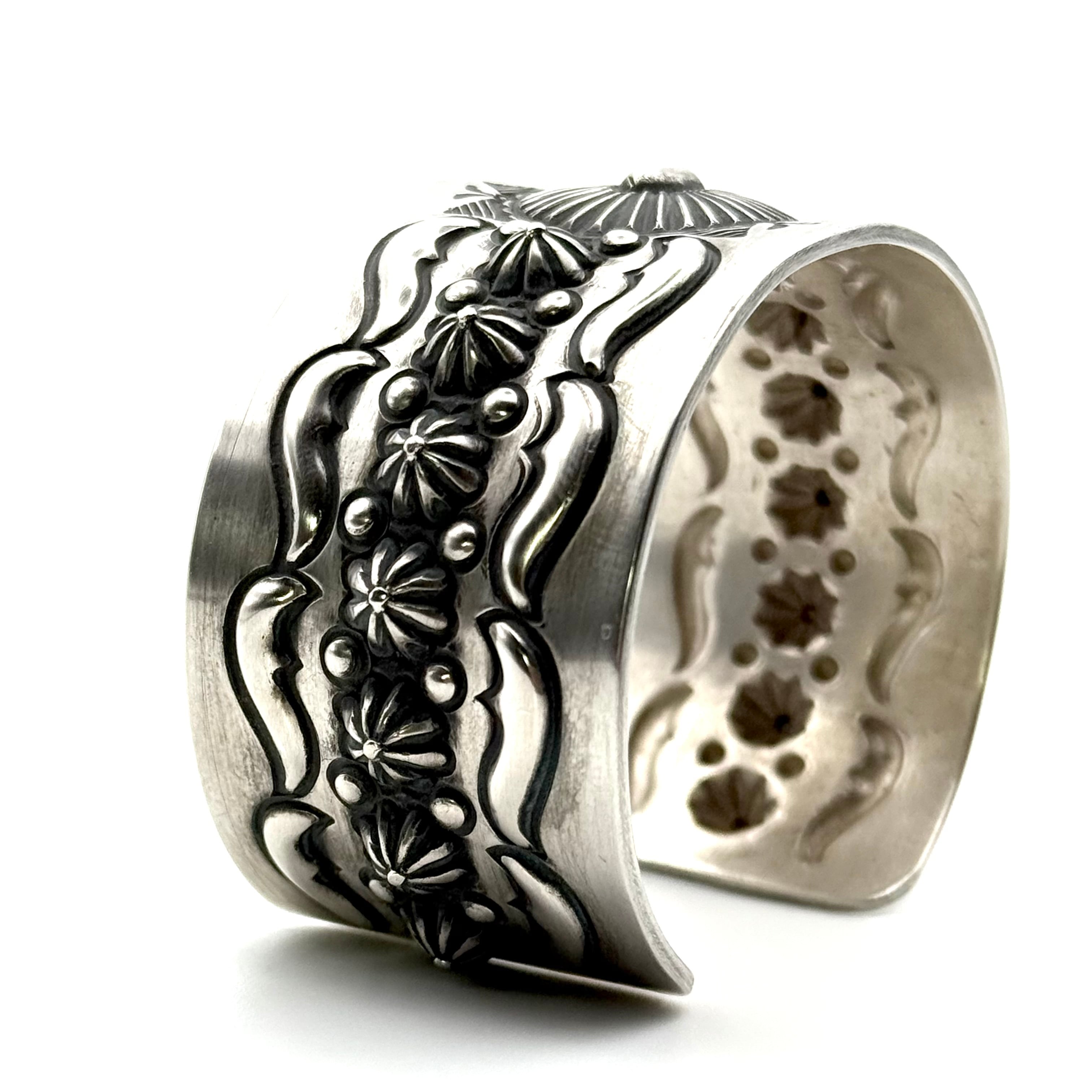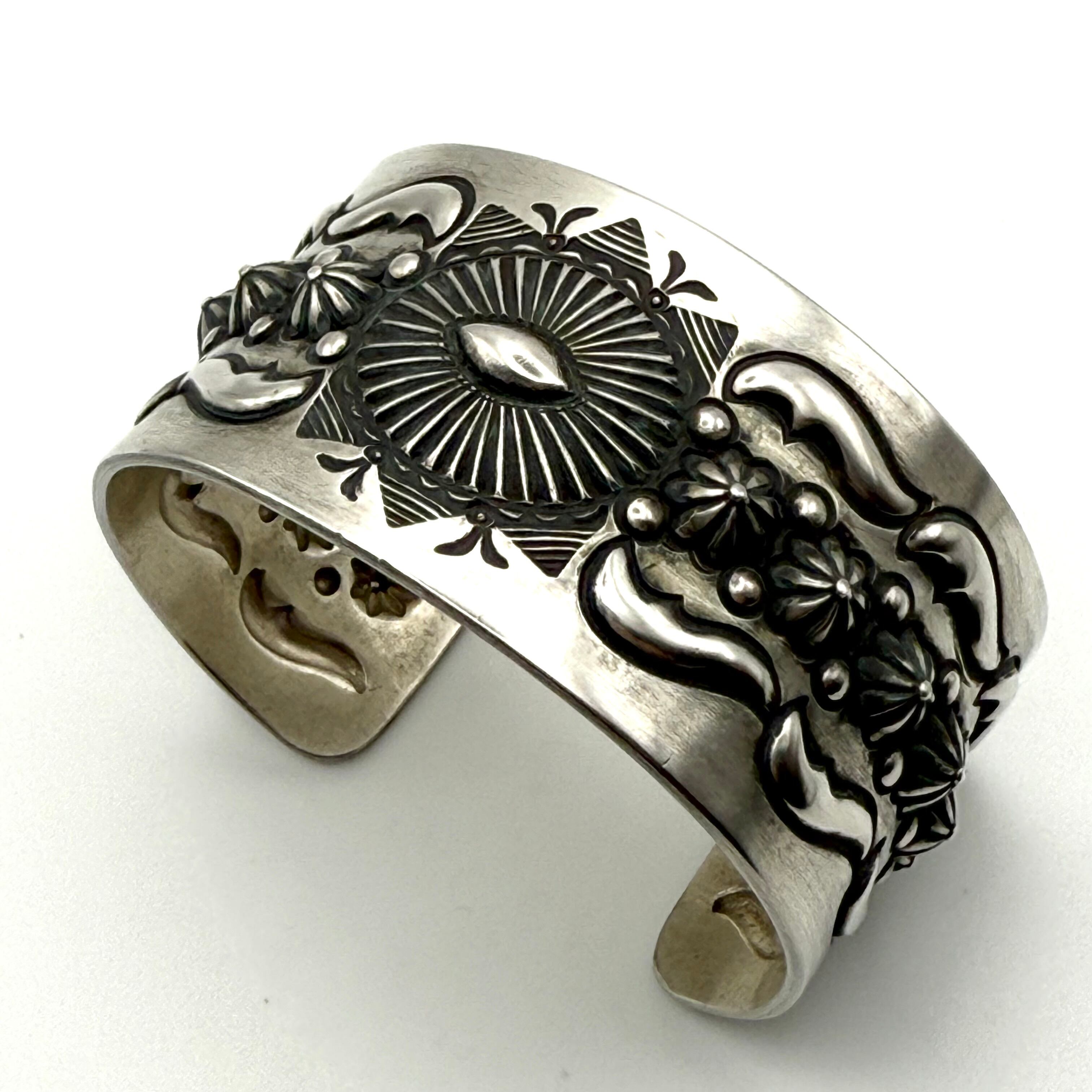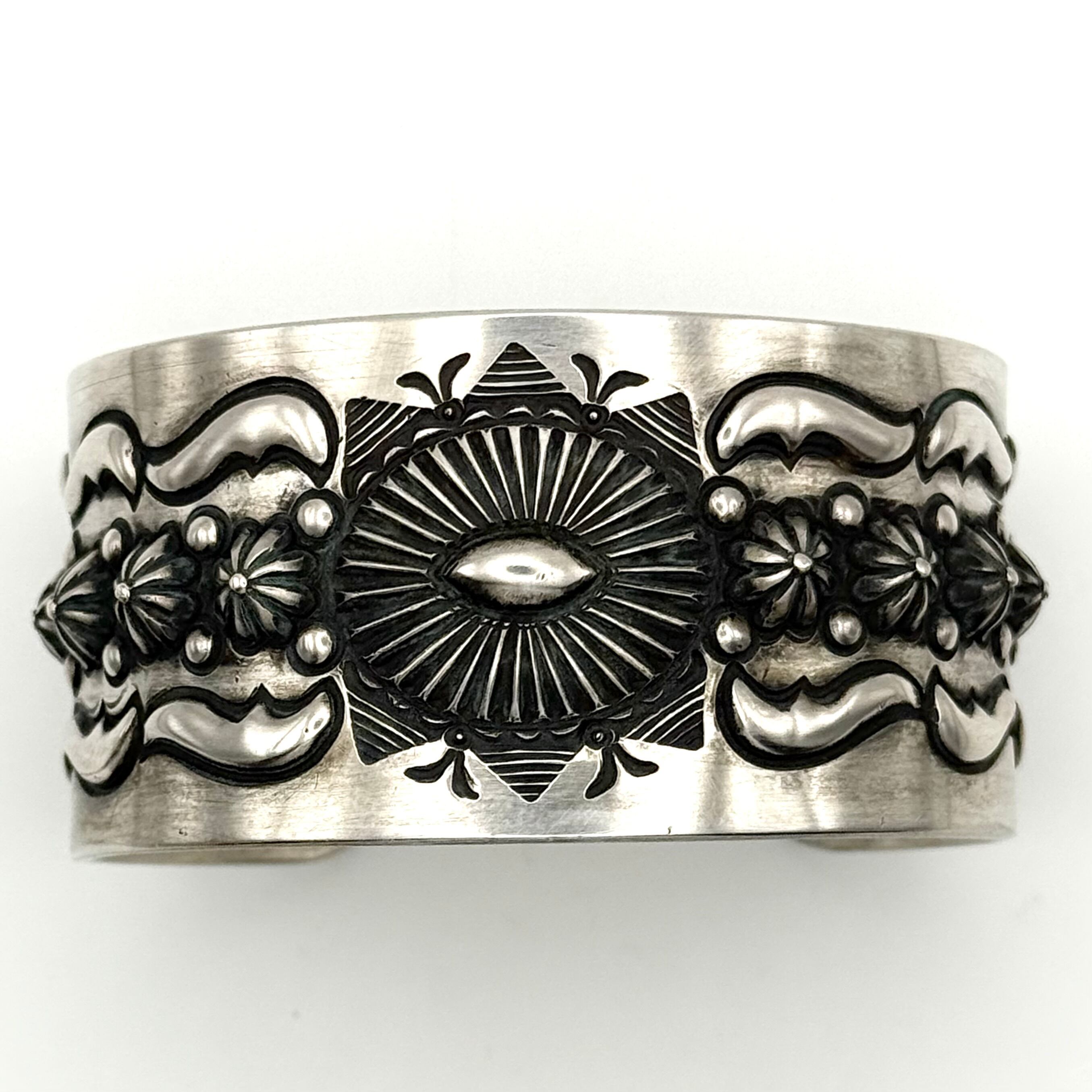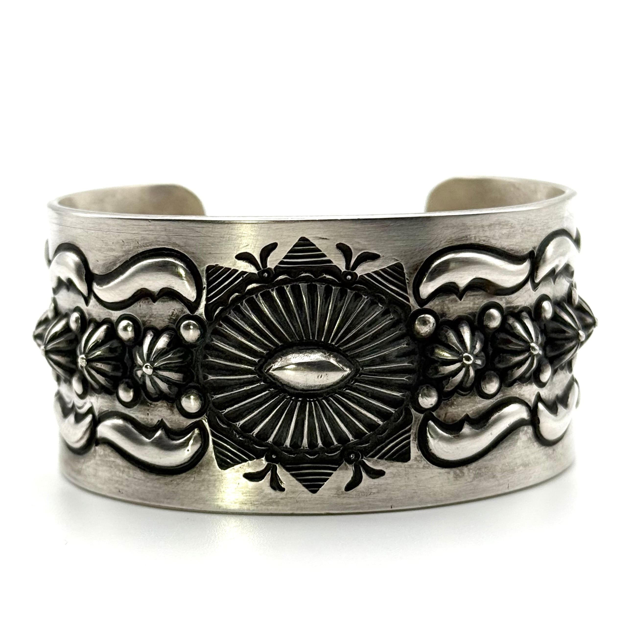 ナバホならではの伝統的な技法を駆使しブレスレット中央にサンバースト、両サイドのバンプアウトを施したエディソンならではの圧巻のブレスレットです。