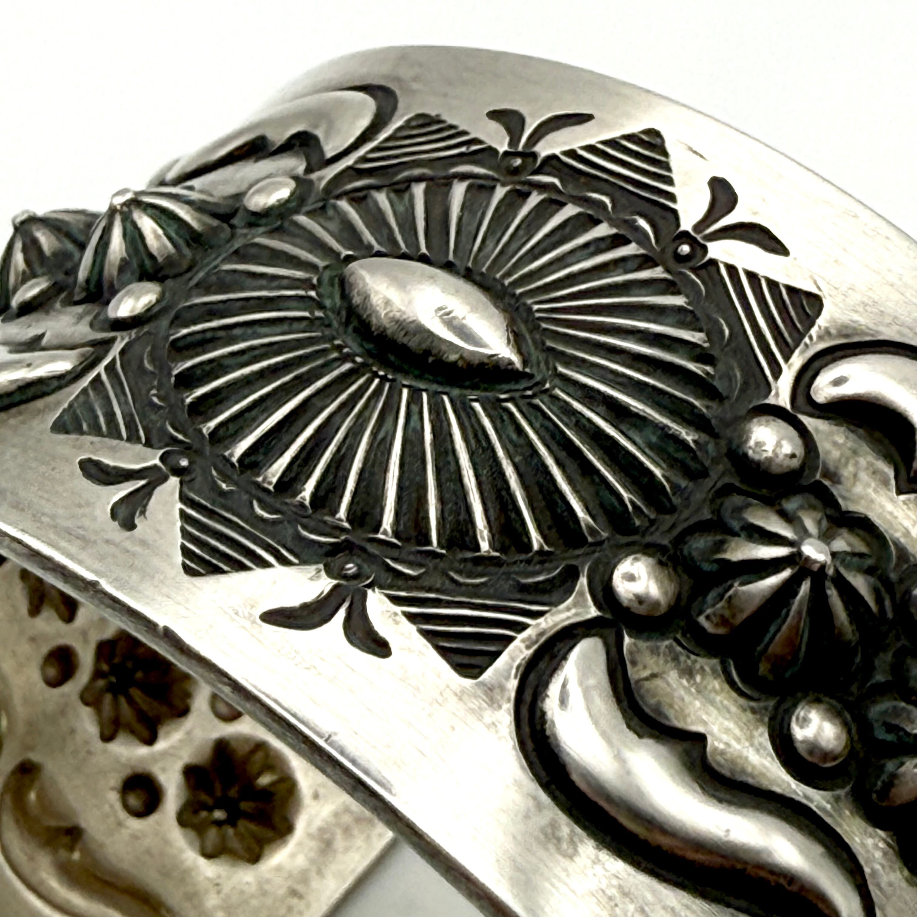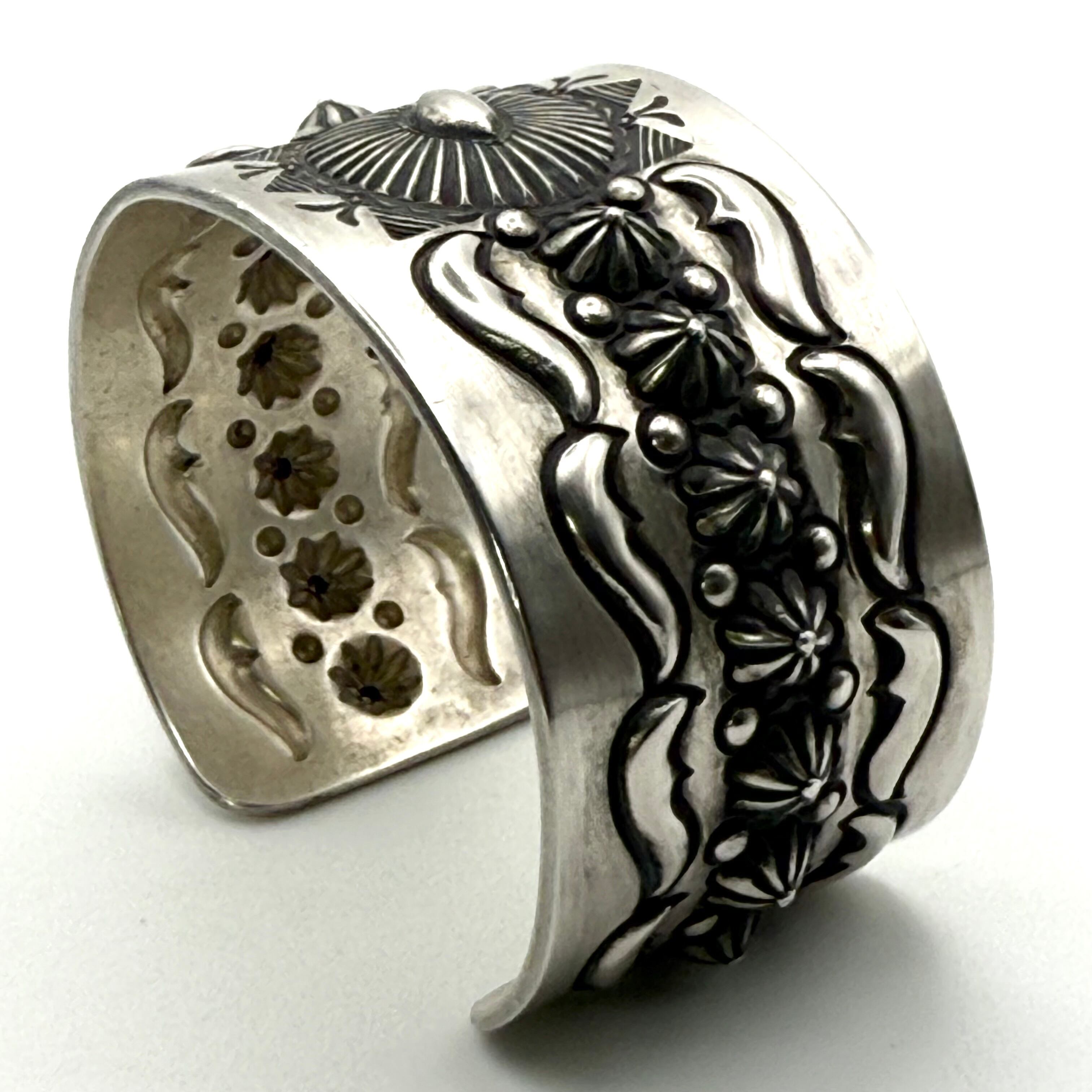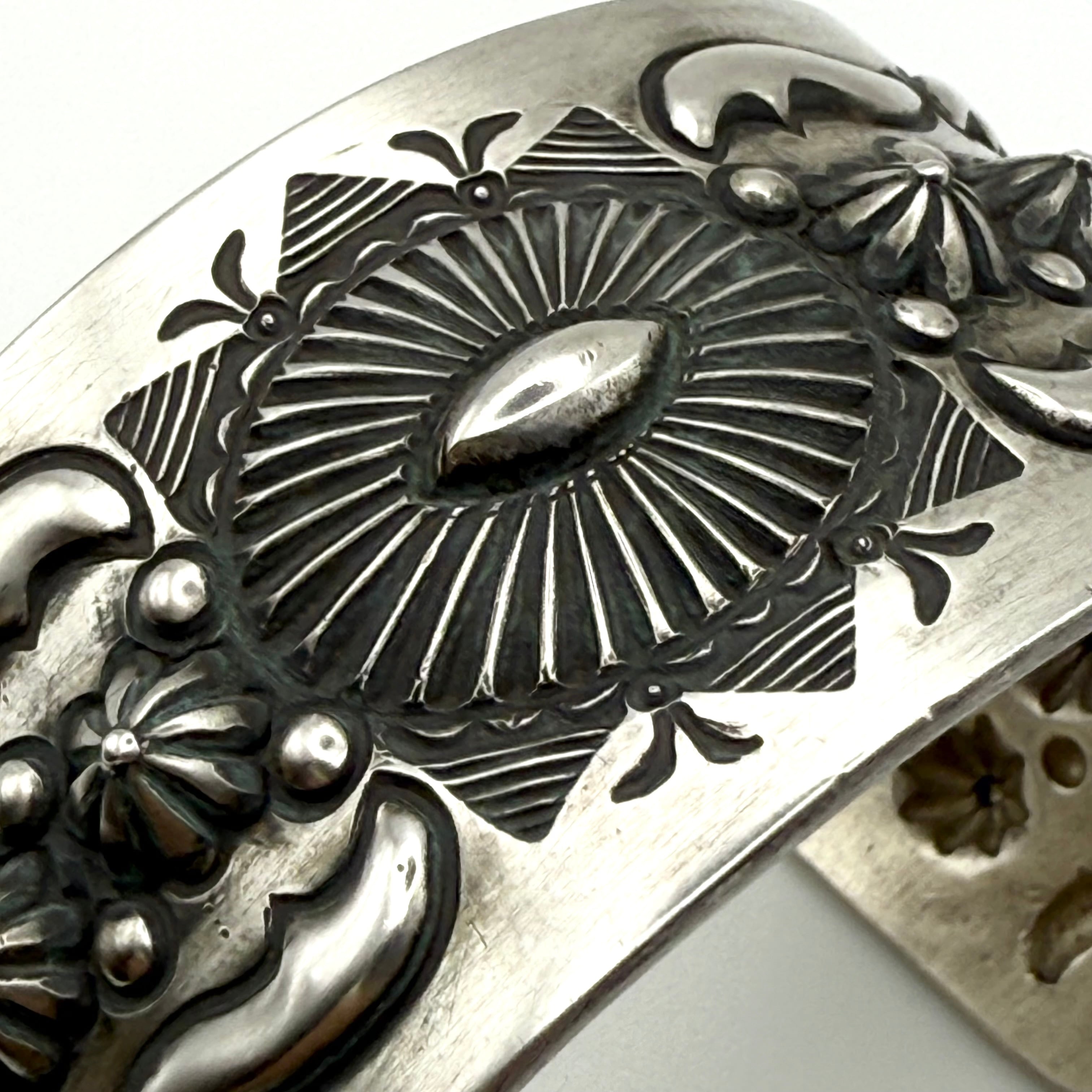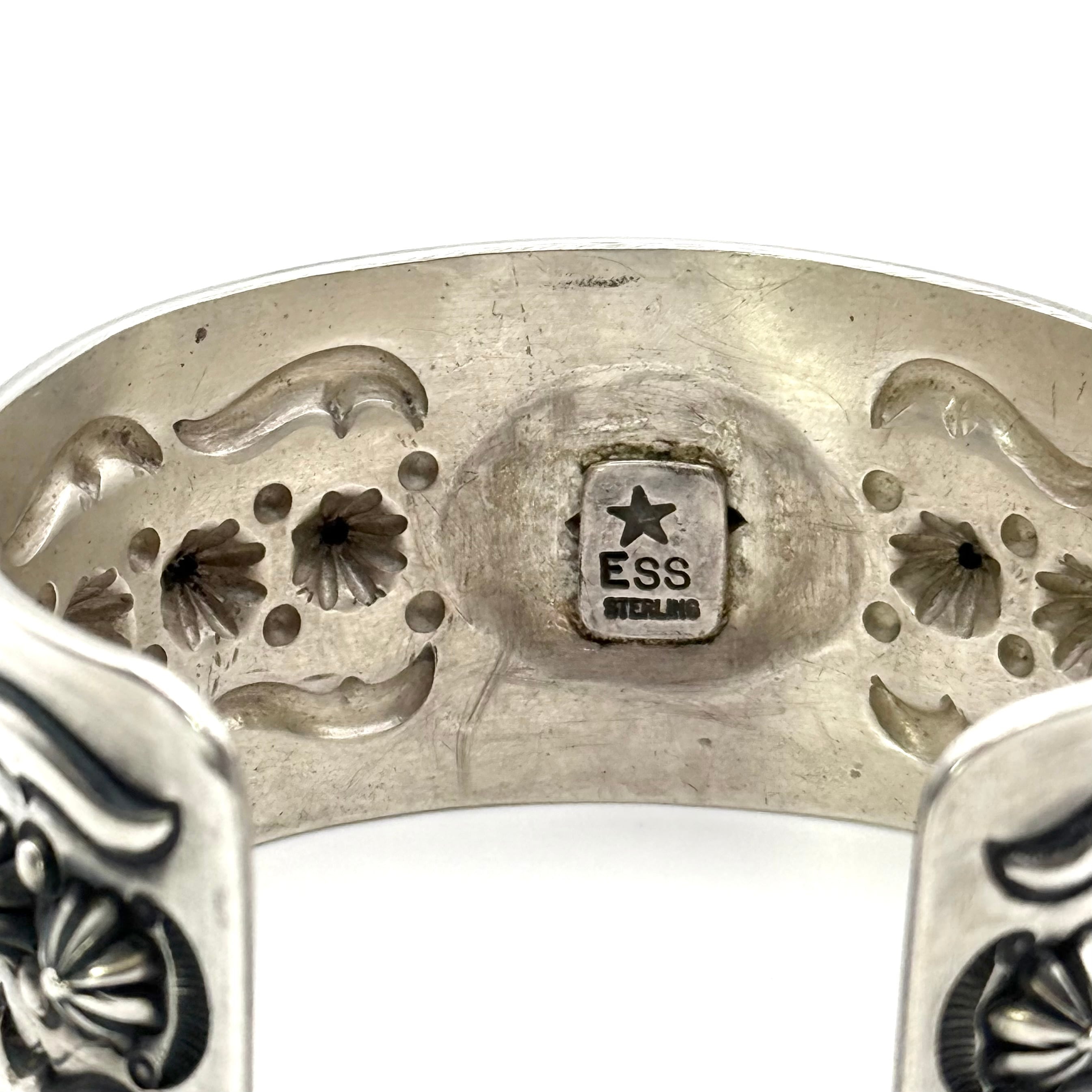 ナバホならではの伝統的な技法を駆使しブレスレット中央にサンバースト、両サイドのバンプアウトを施したエディソンならではの圧巻のブレスレットです。