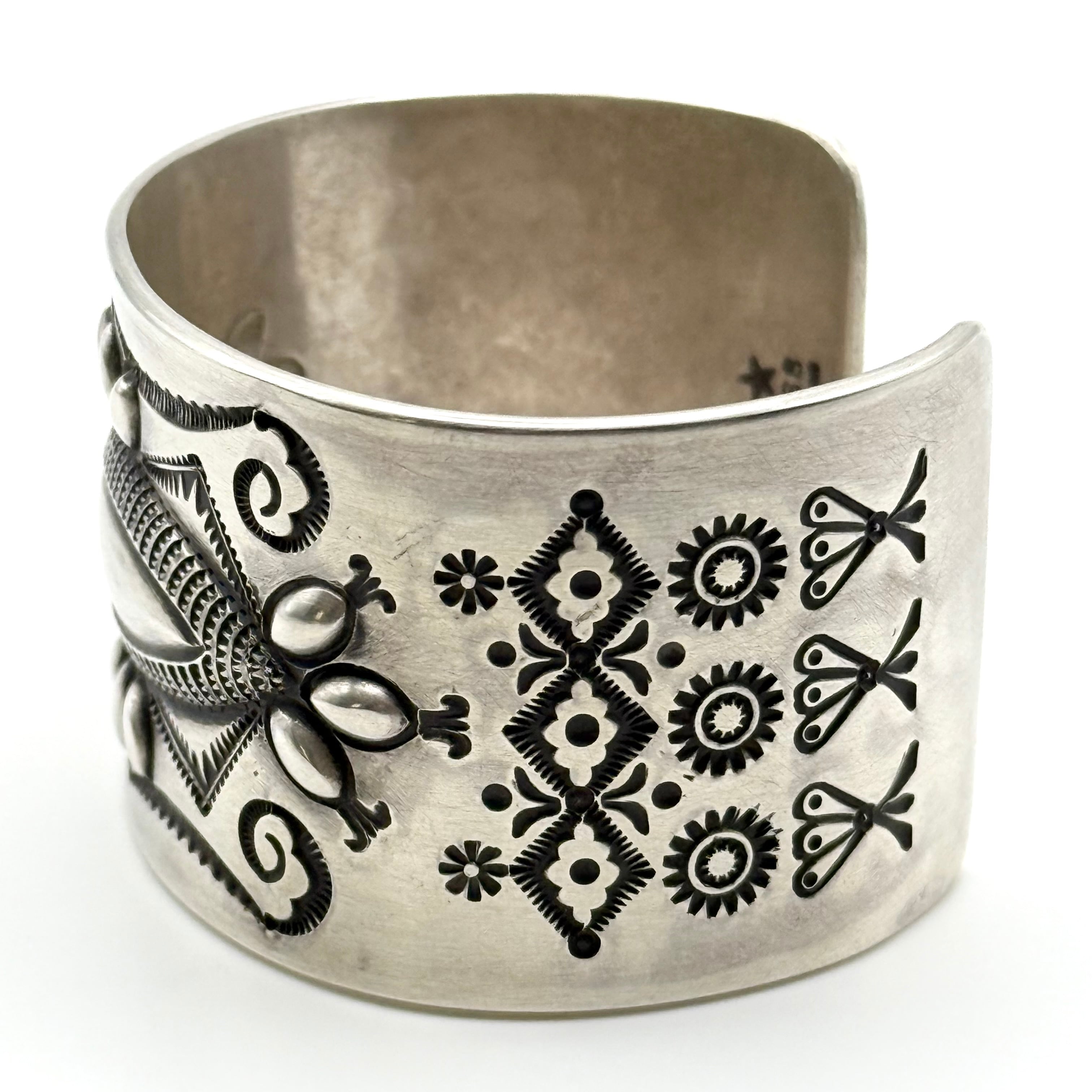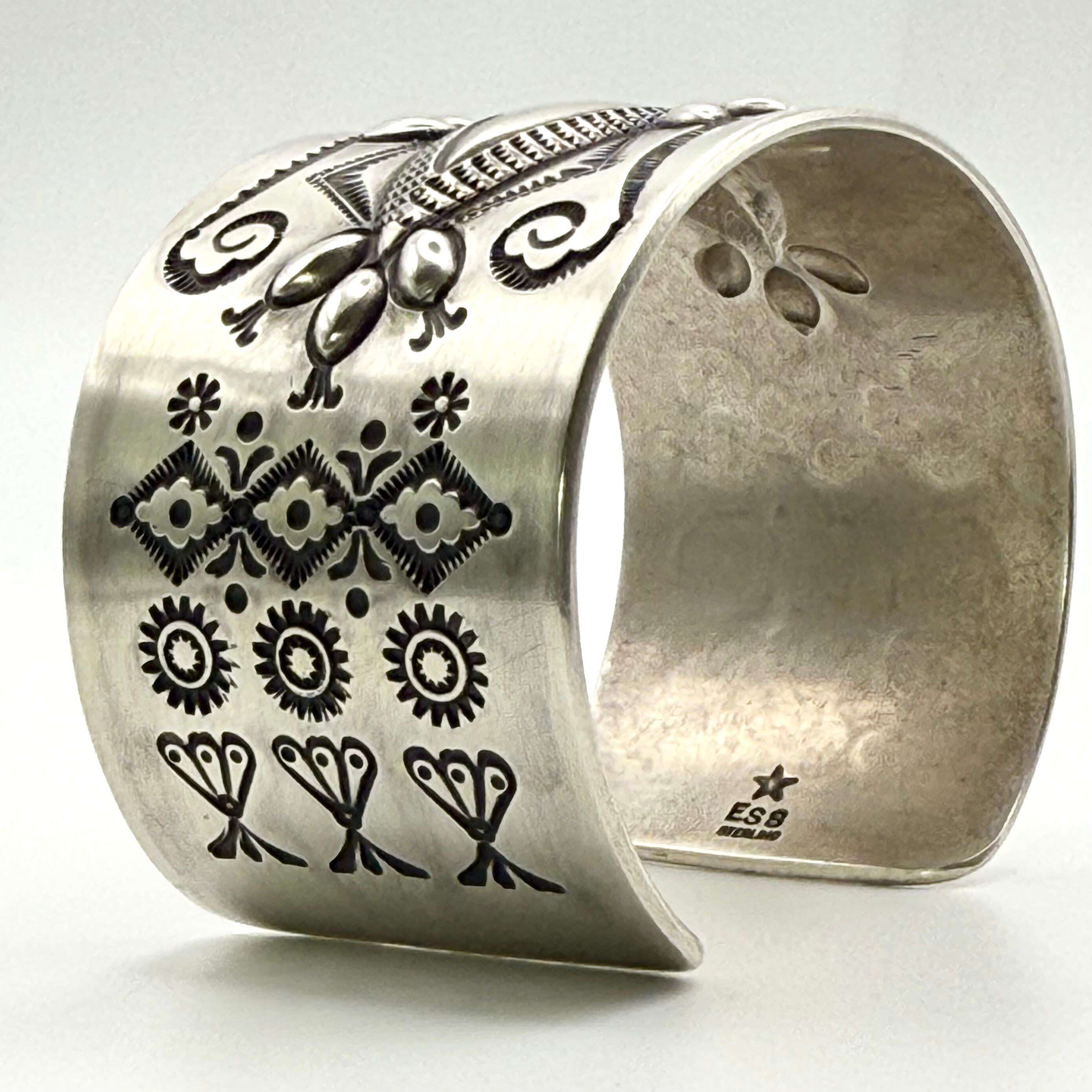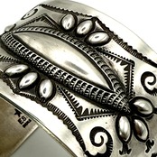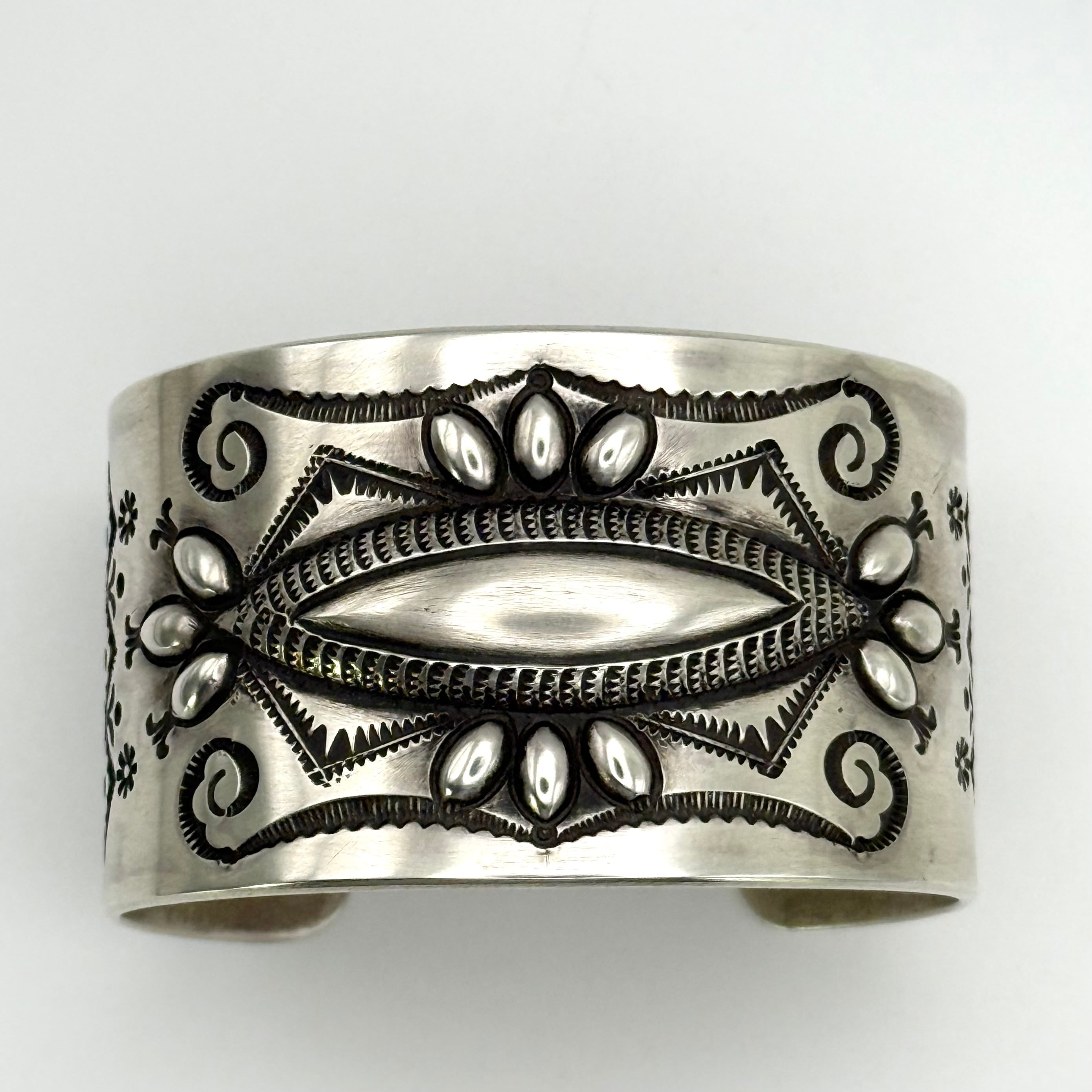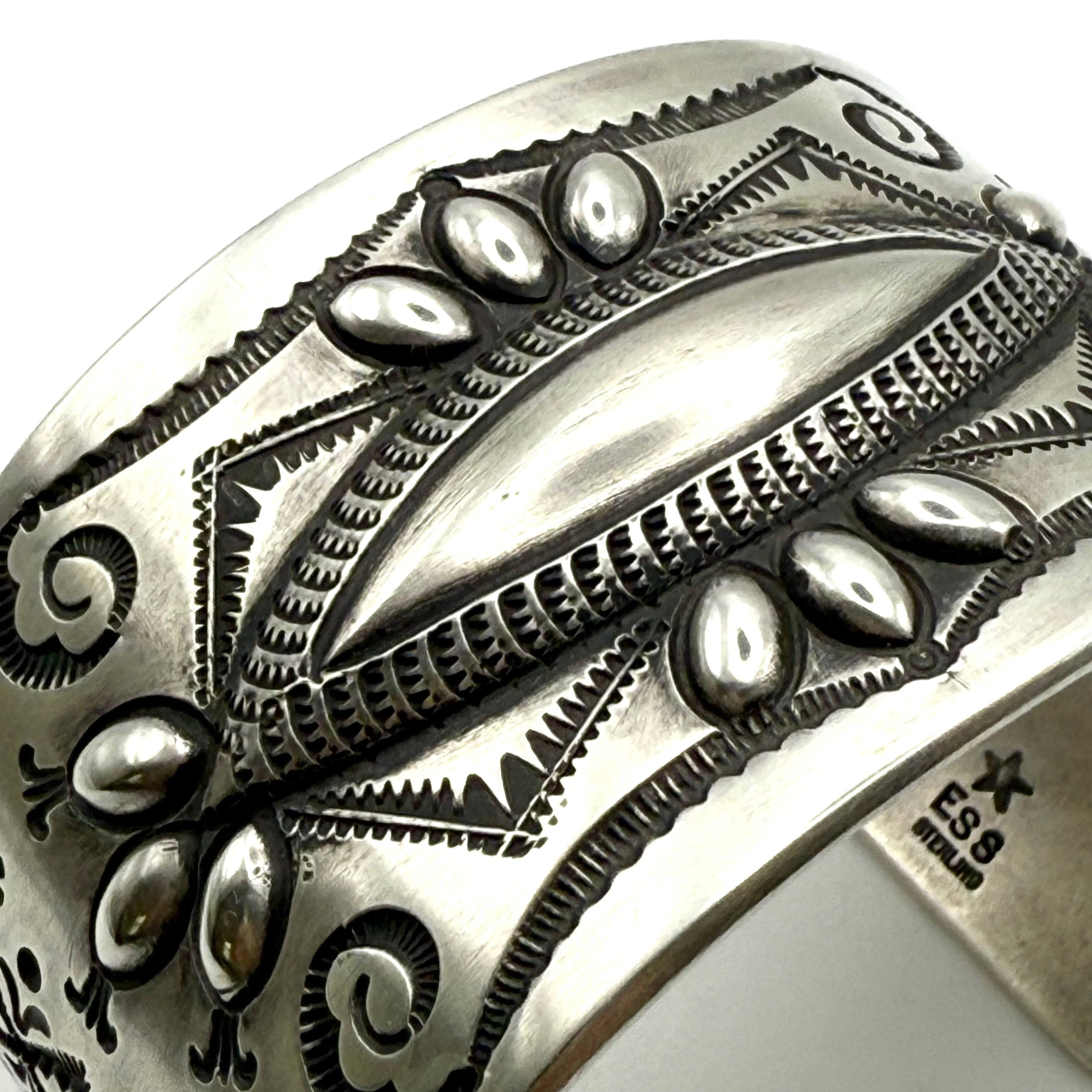 ナバホならではの伝統的な技法を駆使しブレスレット中央のリポウズ、バンプアウト、スタンプワークを施したエディソンならではの圧巻のブレスレットです。