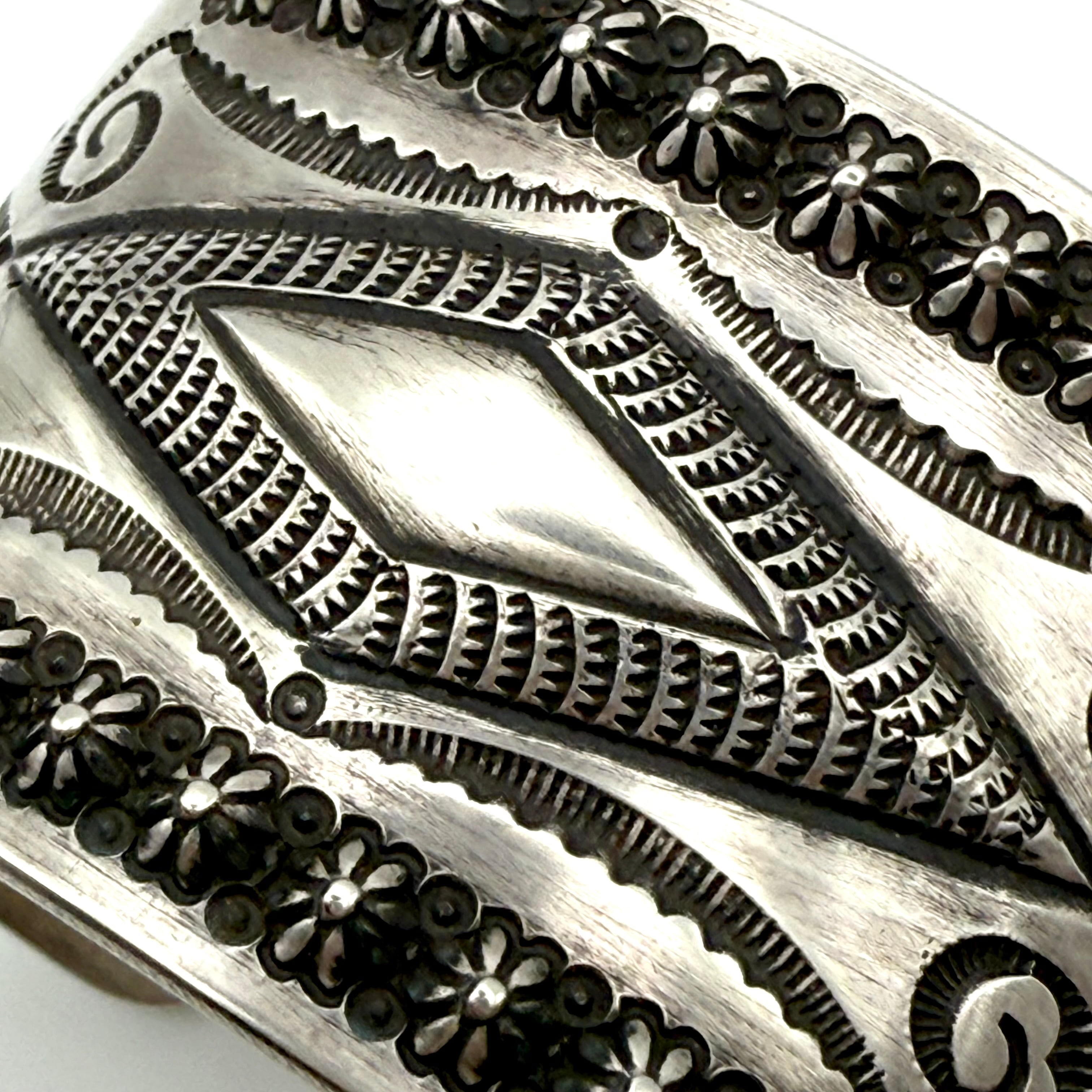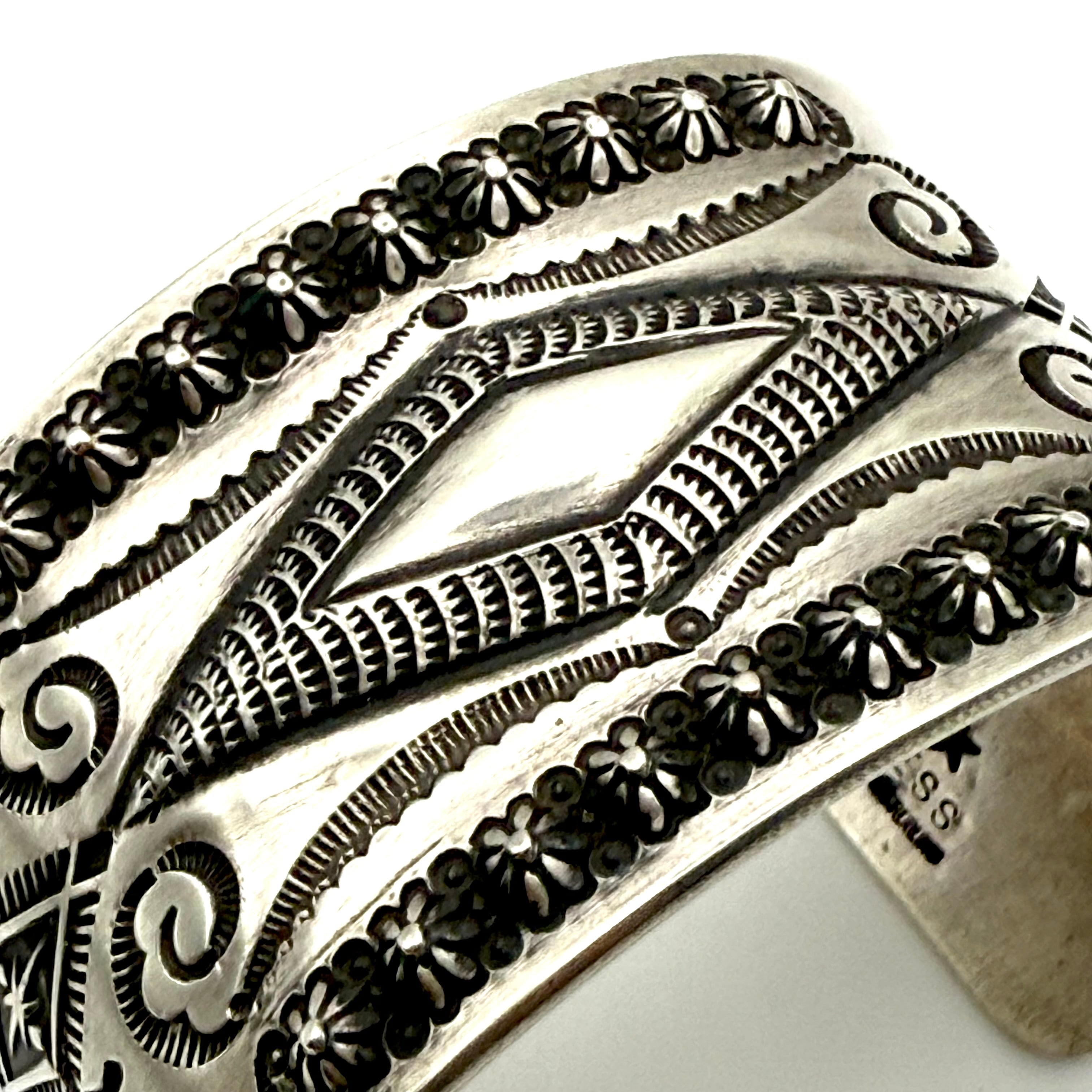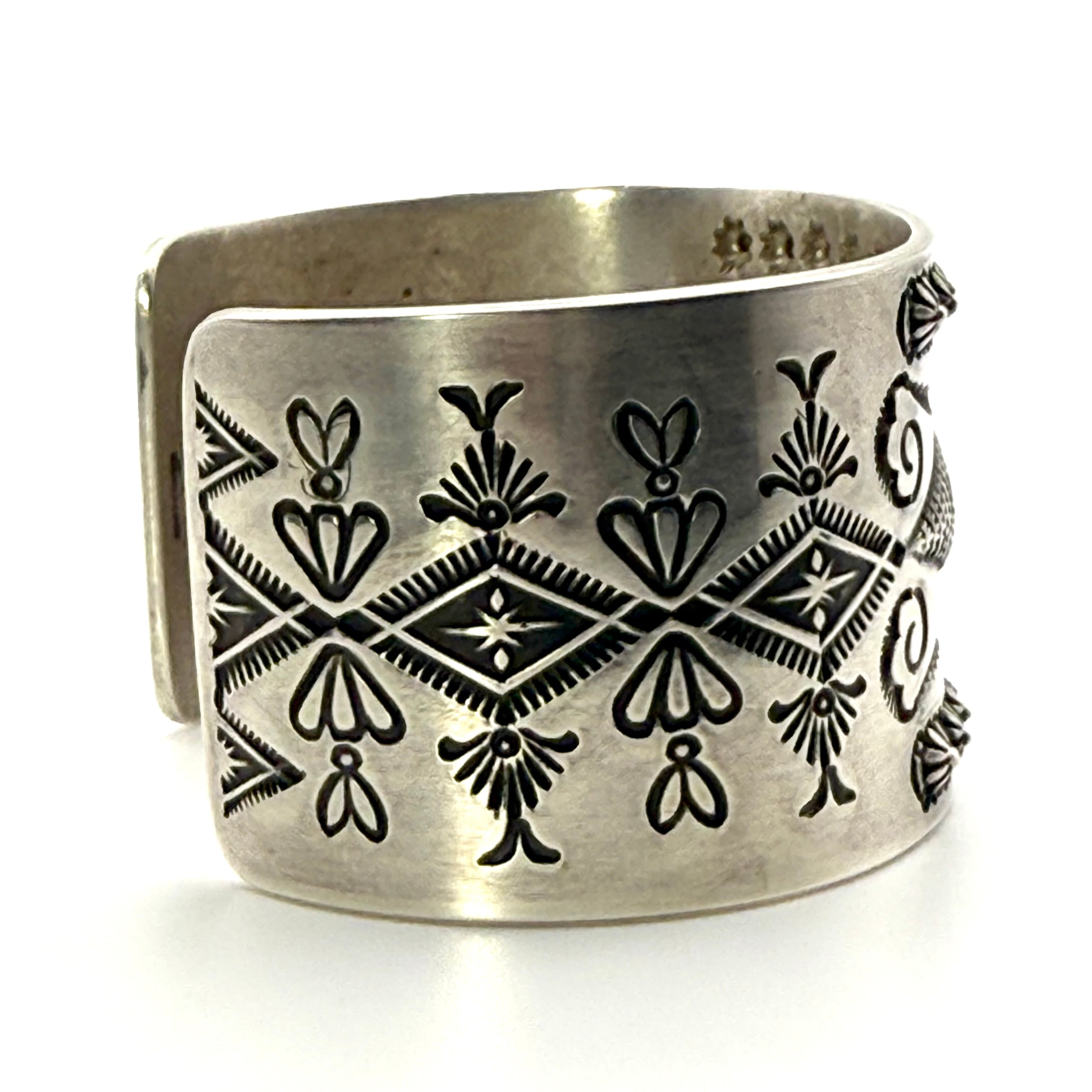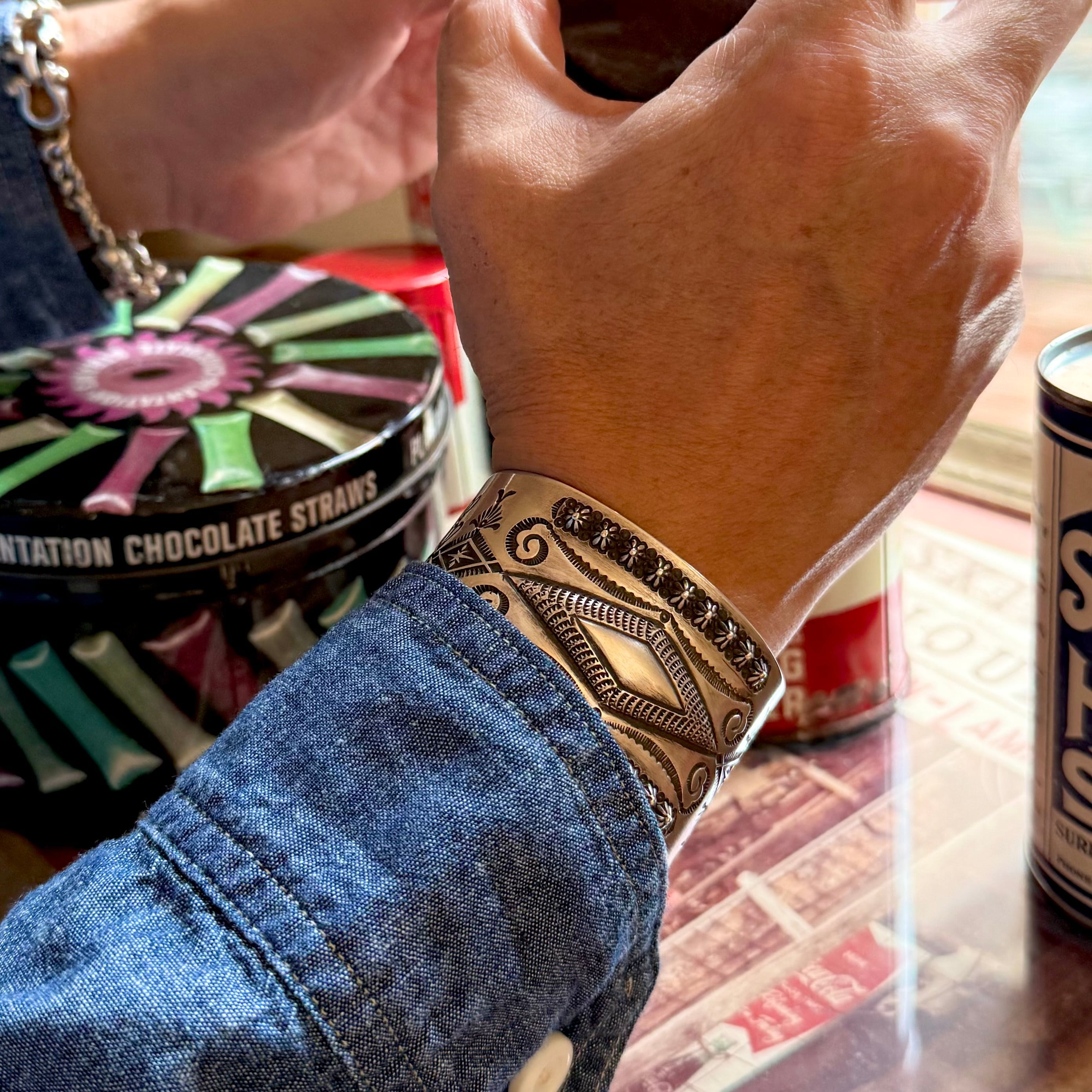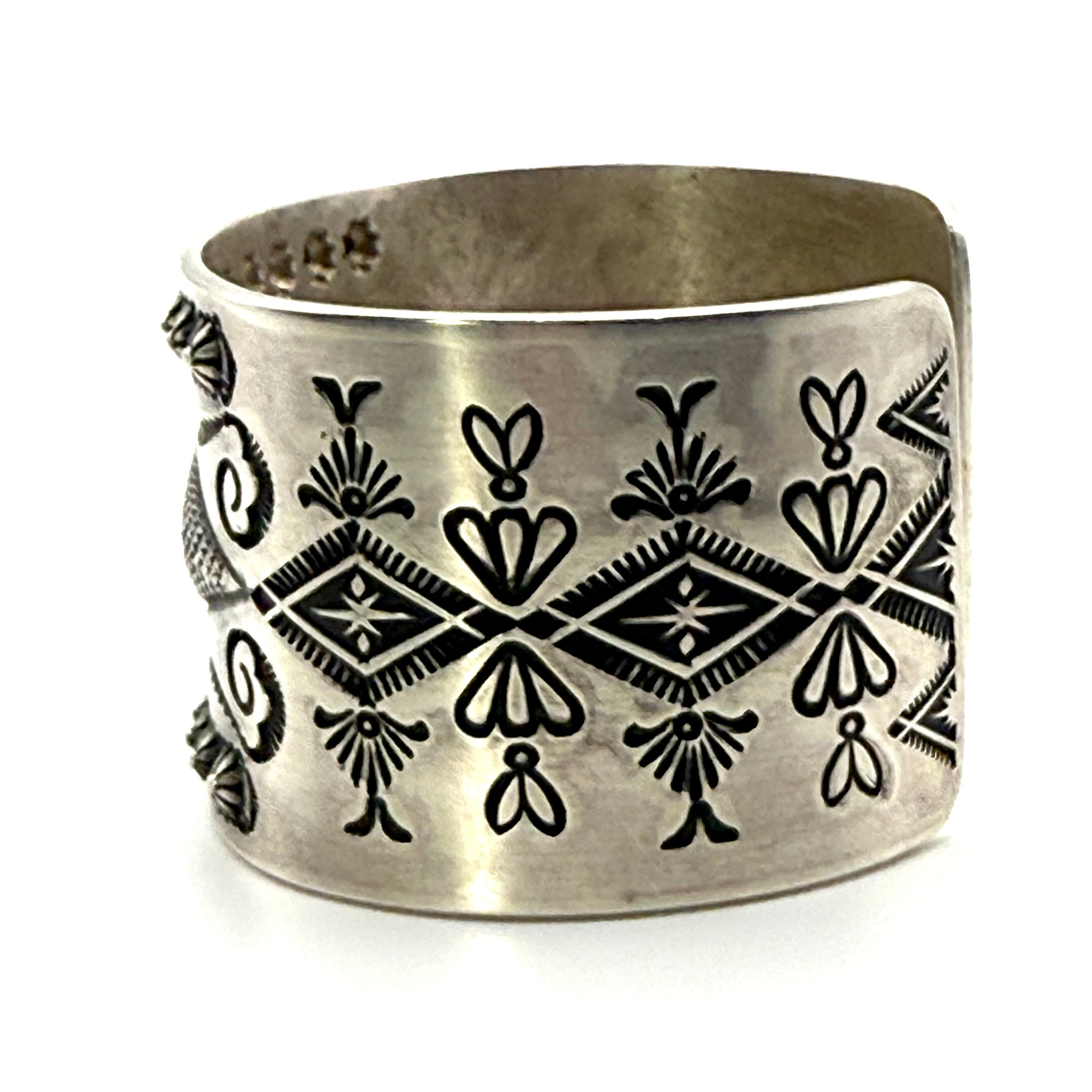ナバホならではの伝統的な技法を駆使しブレスレット中央のリポウズ、バンプアウト、スタンプワークを施したエディソンならではの圧巻のブレスレットです。