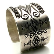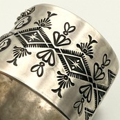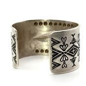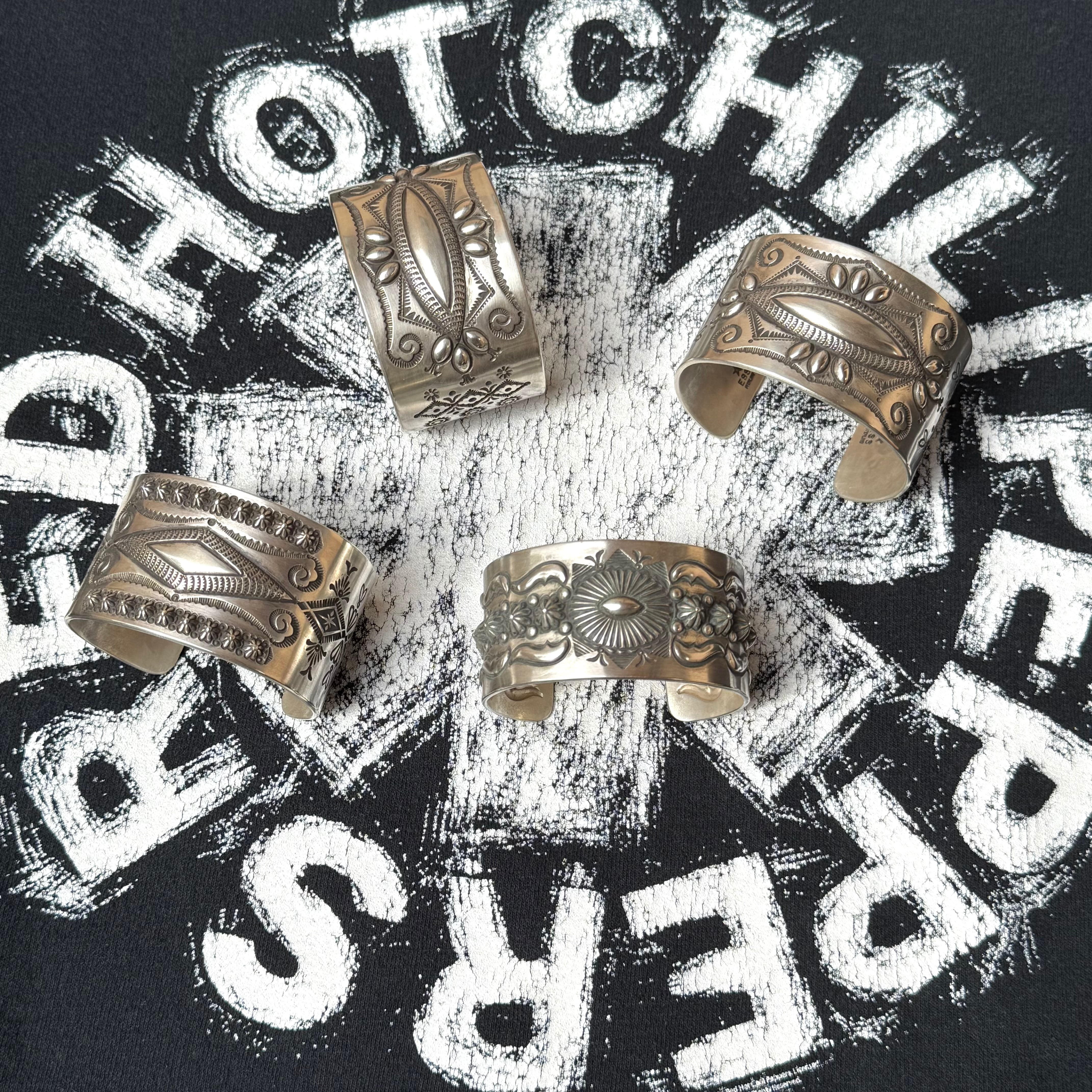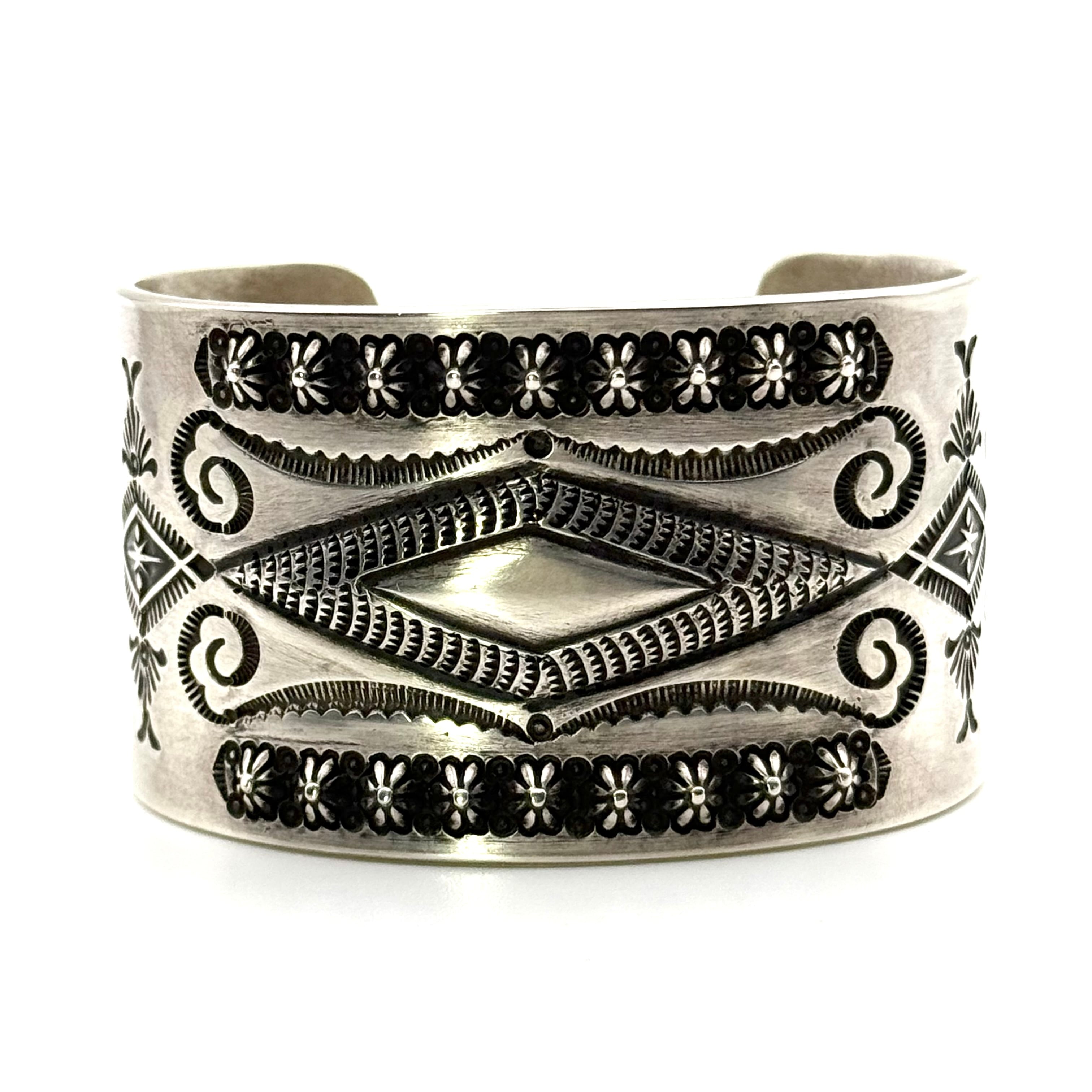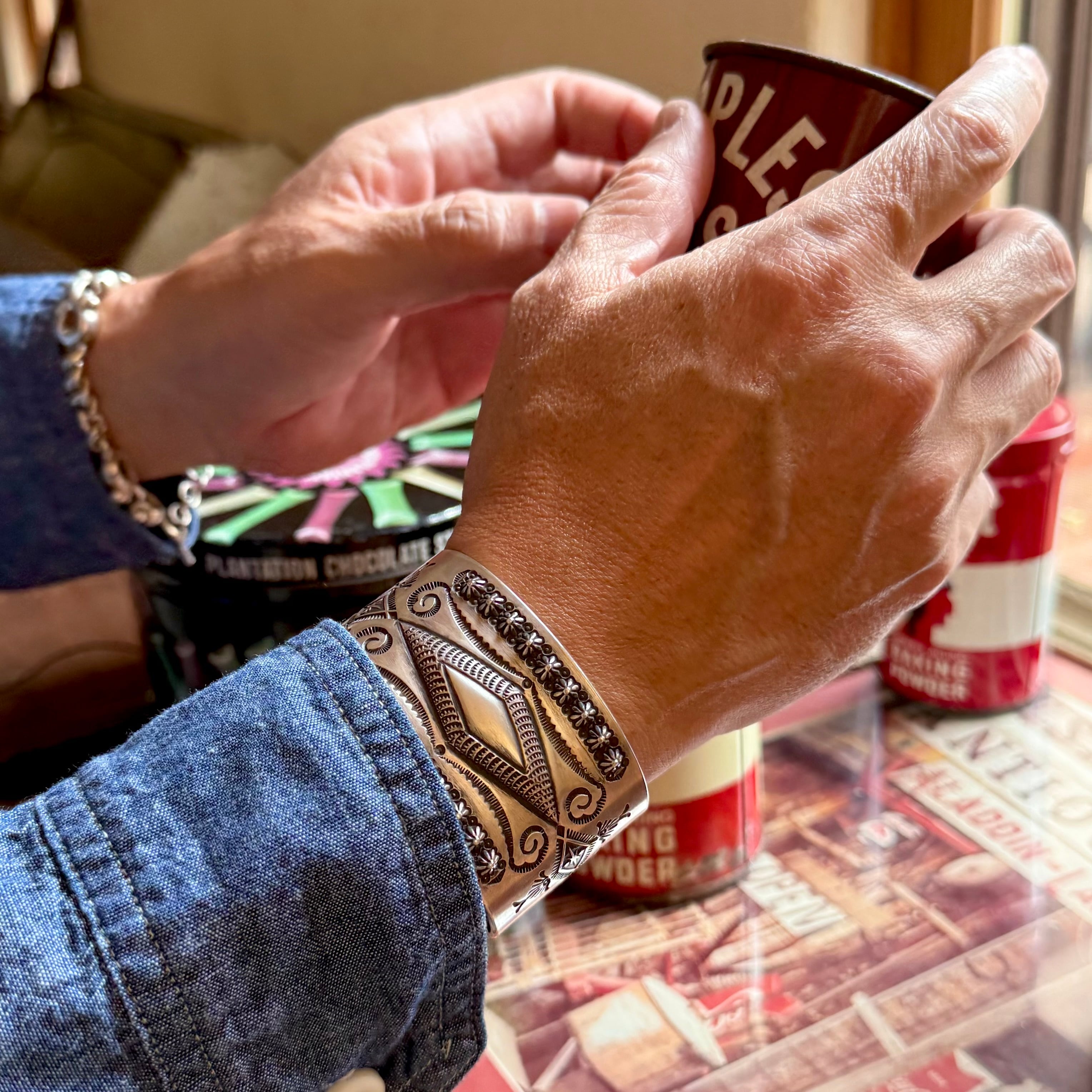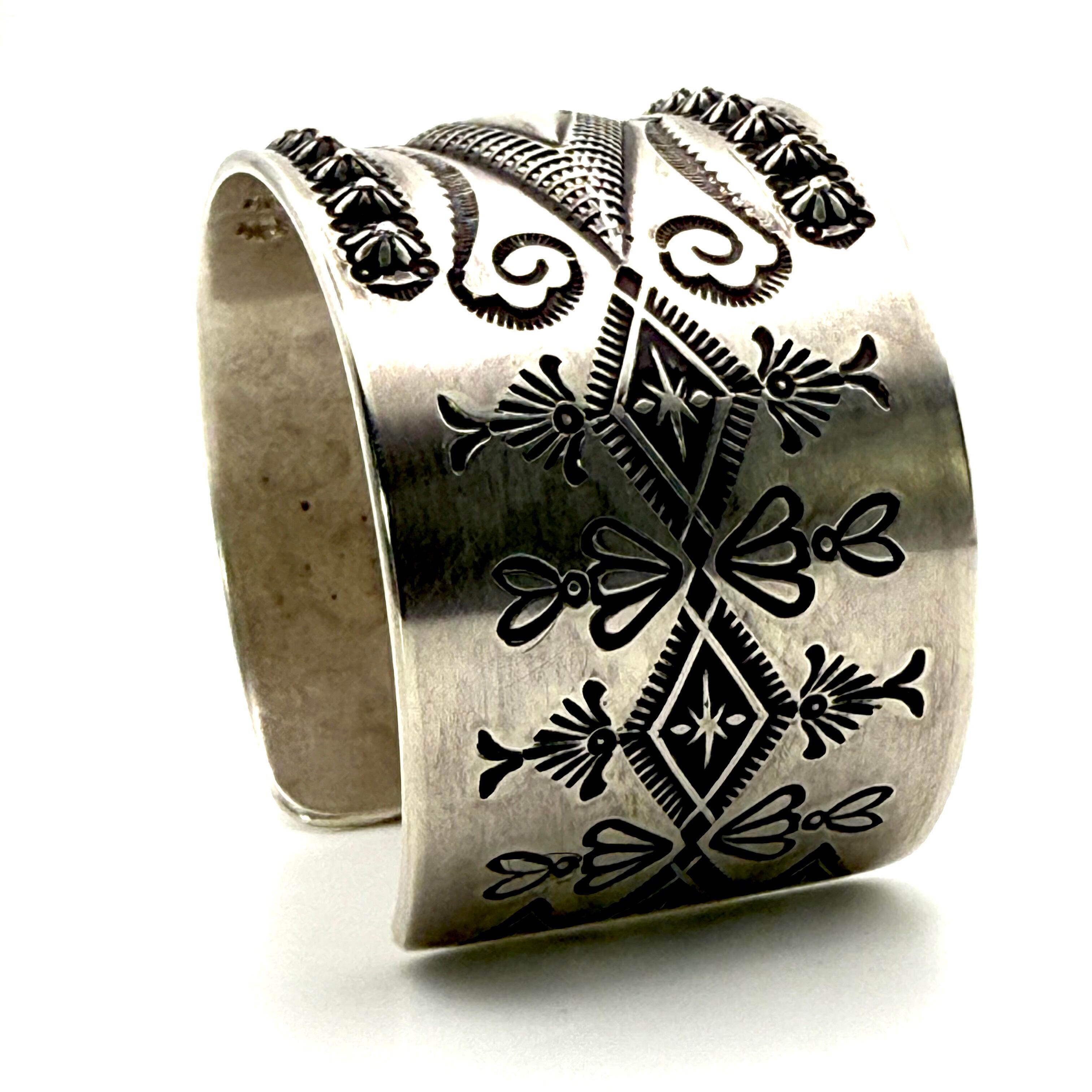 ナバホならではの伝統的な技法を駆使しブレスレット中央のリポウズ、バンプアウト、スタンプワークを施したエディソンならではの圧巻のブレスレットです。