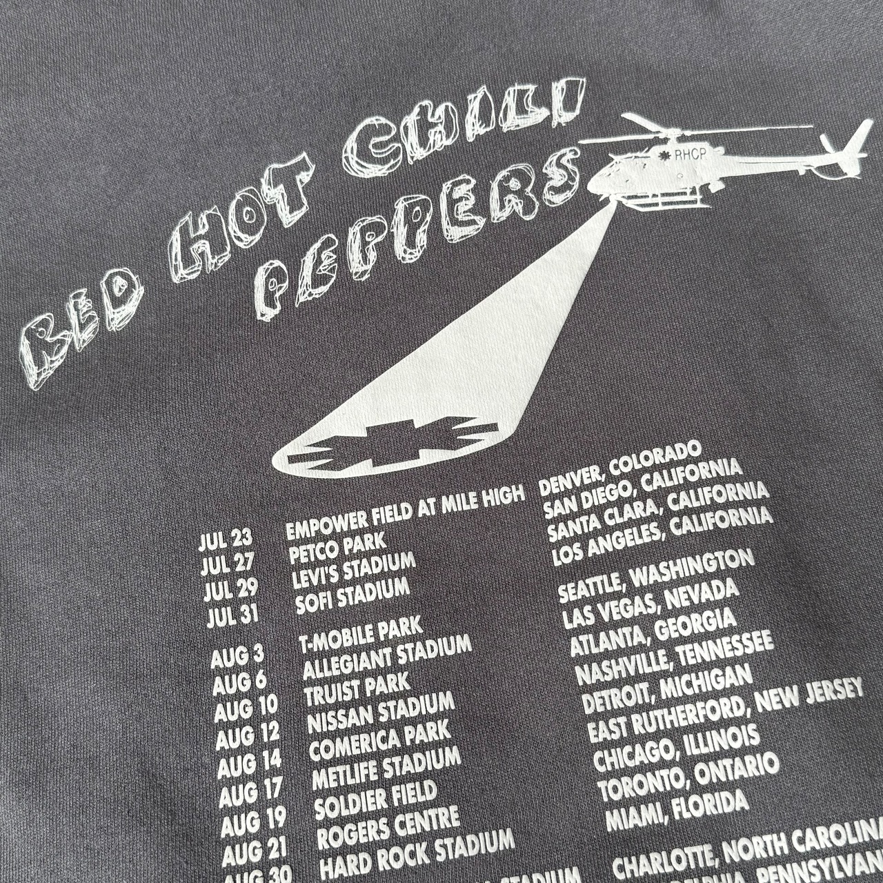 RED HOT CHILI PEPPERS、2022年ワールド・スタジアム・ツアーの北米での日程がプリントされたパーカー。