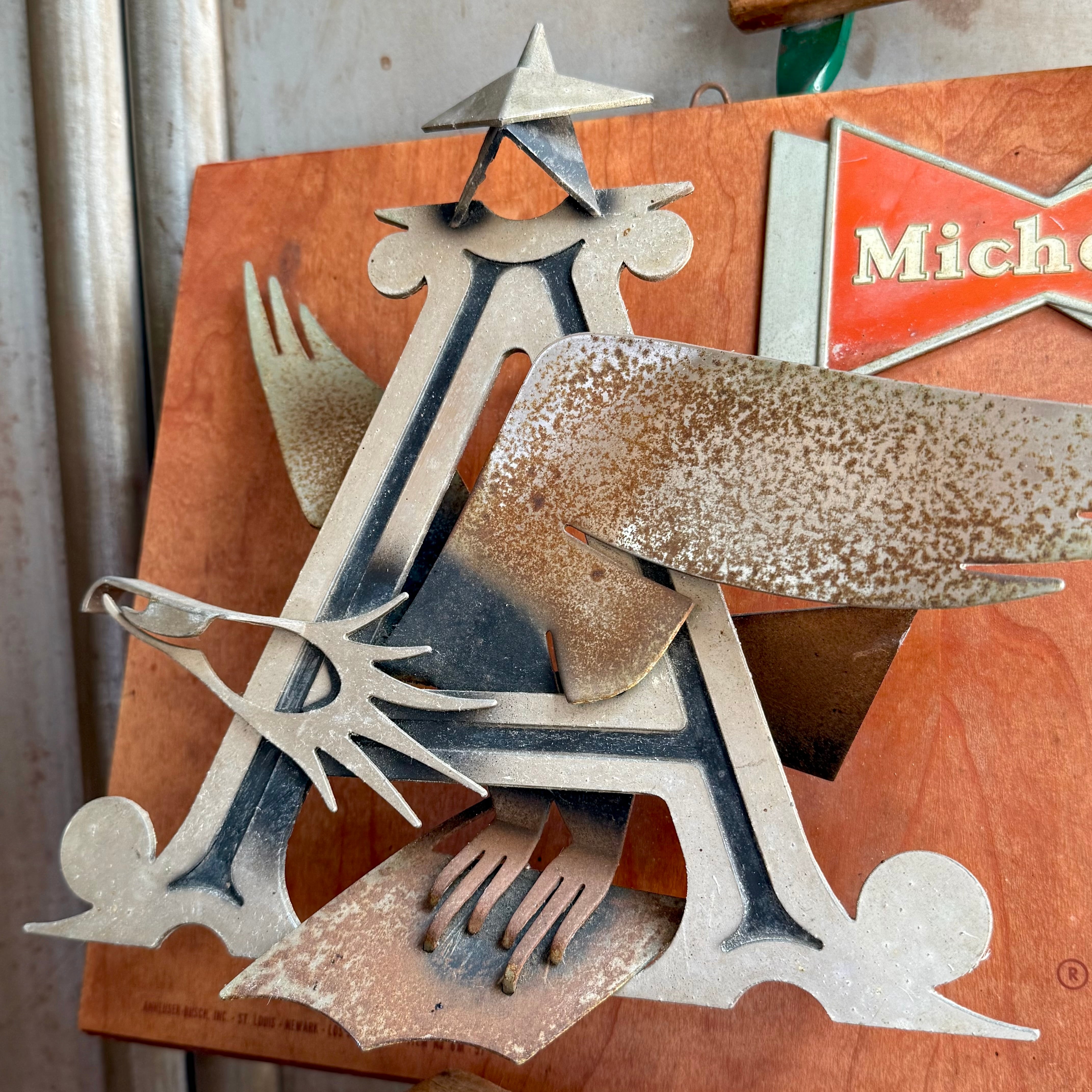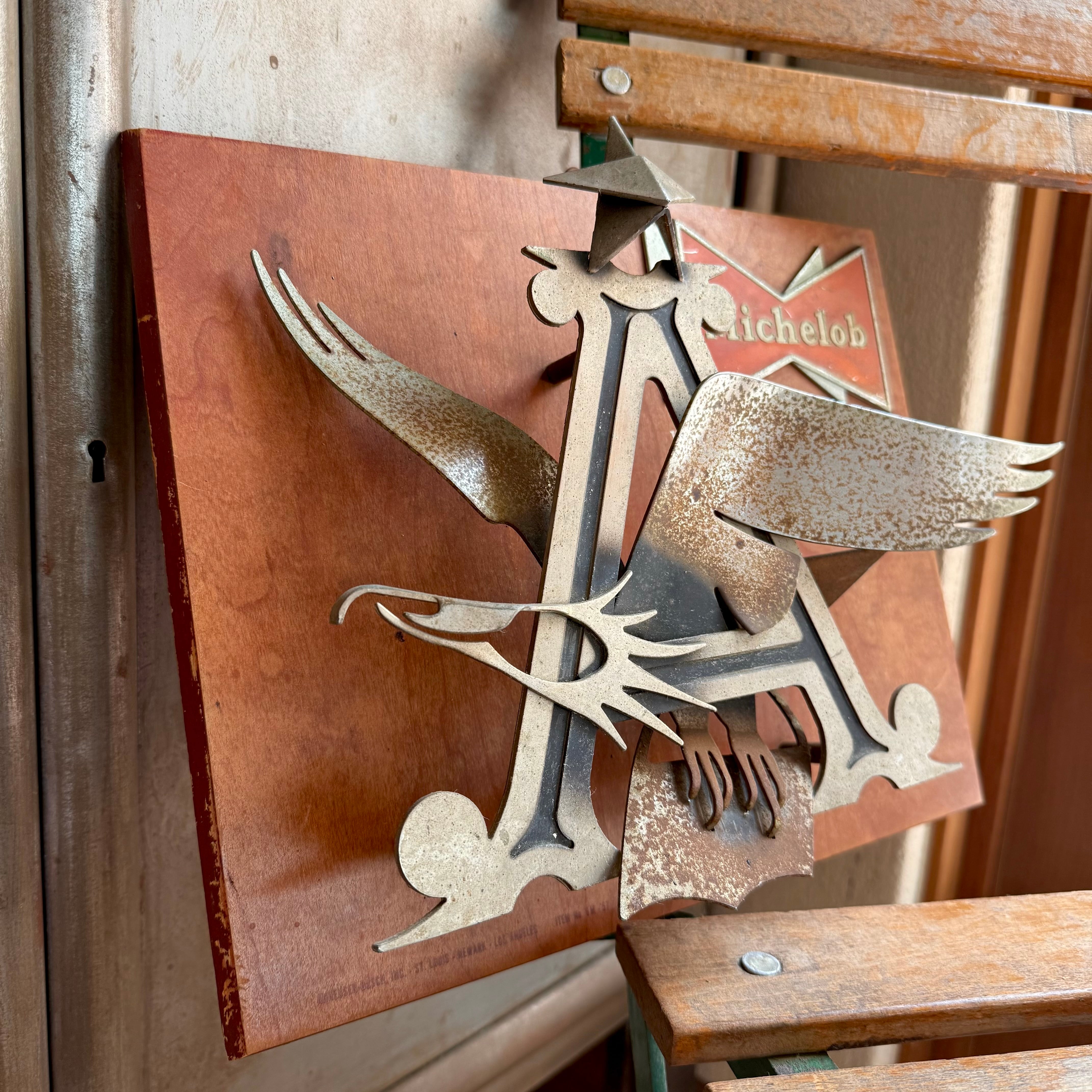 木製の板の上には、1点1点ハンドメイドで仕上げられたと思われる非常にアート性ある仕上がりとなっていて、バドワイザーやミケロブでお馴染みのアンハイザー・ブッシュのアイコンとなる A の文字とイーグルが重なる象徴的なロゴが金属のパーツによって立体感あるオブジェのようなサインとなっています。