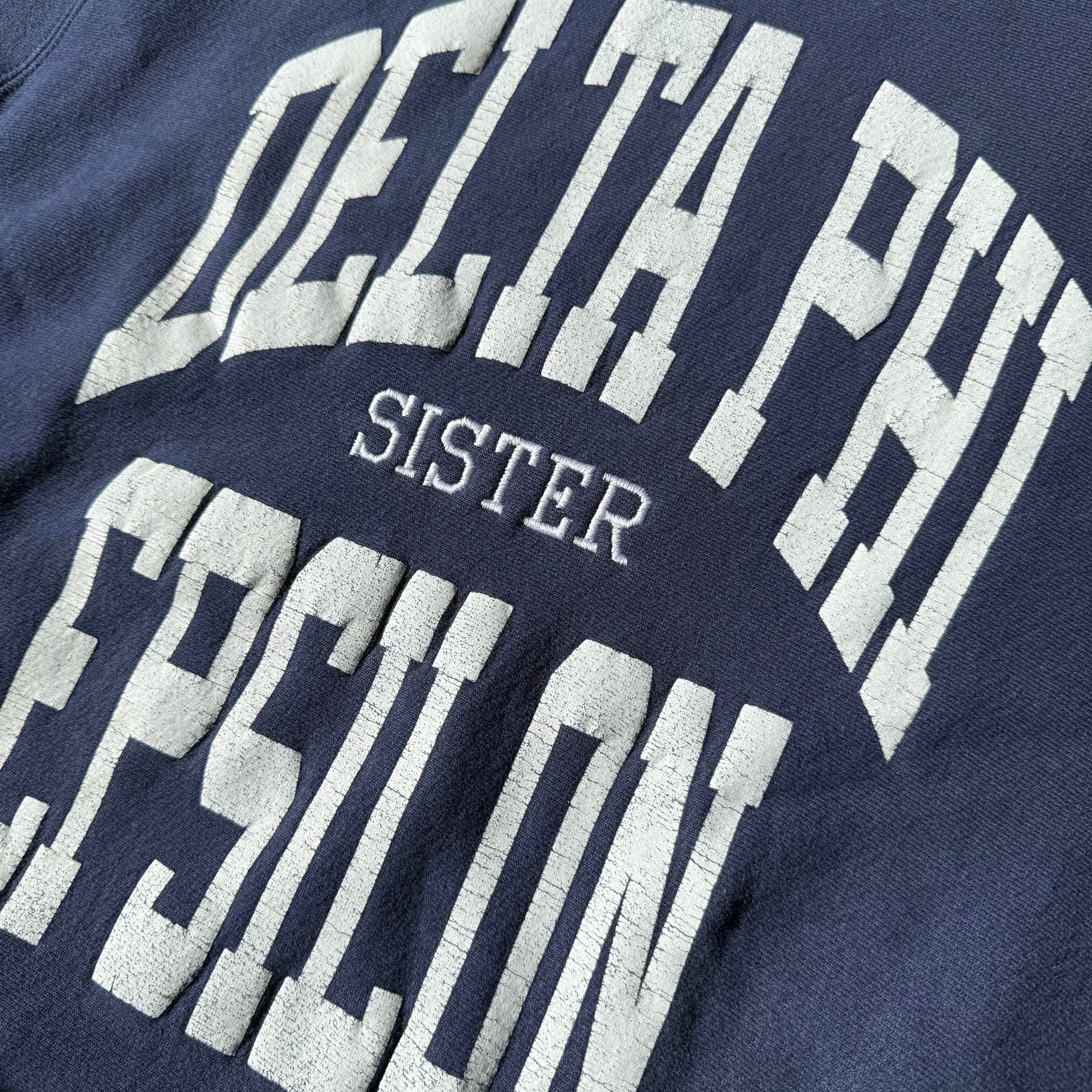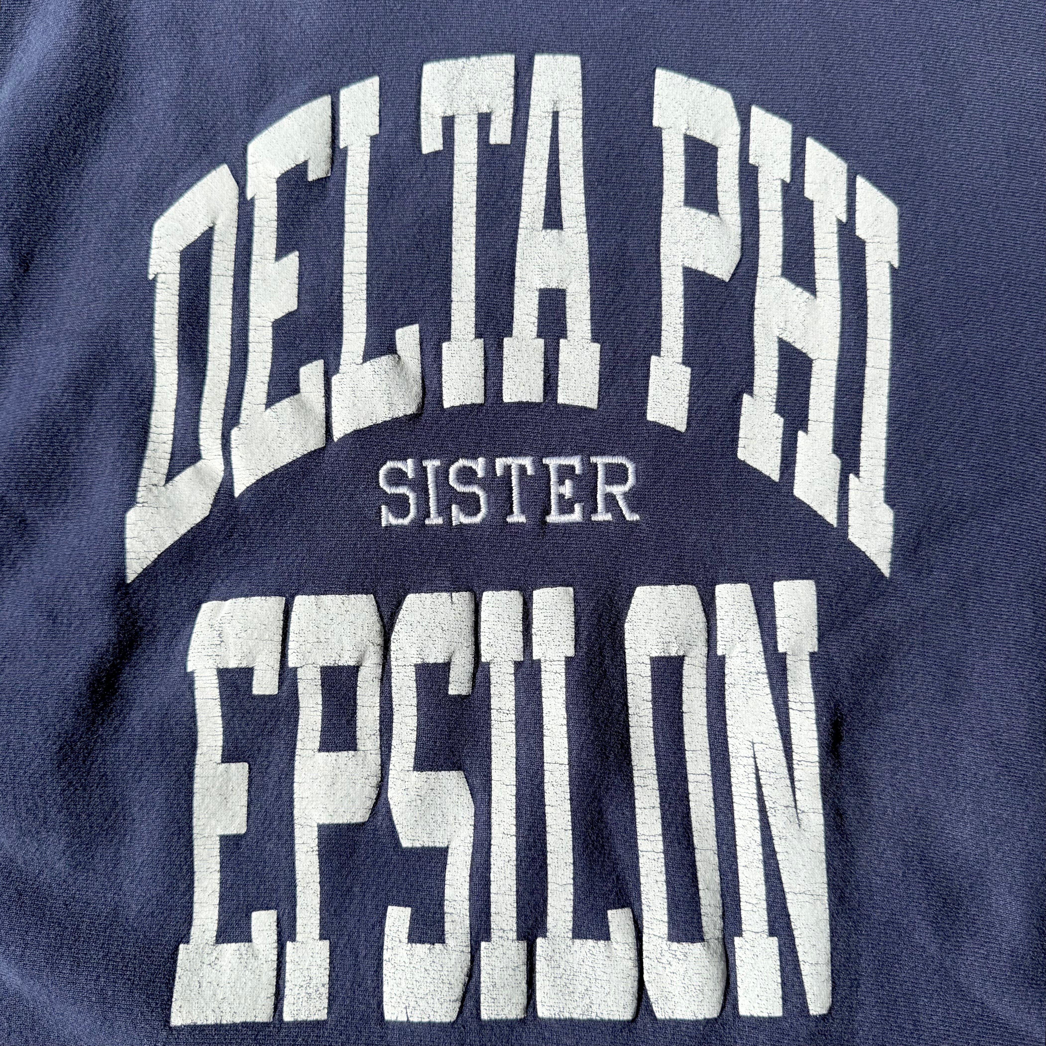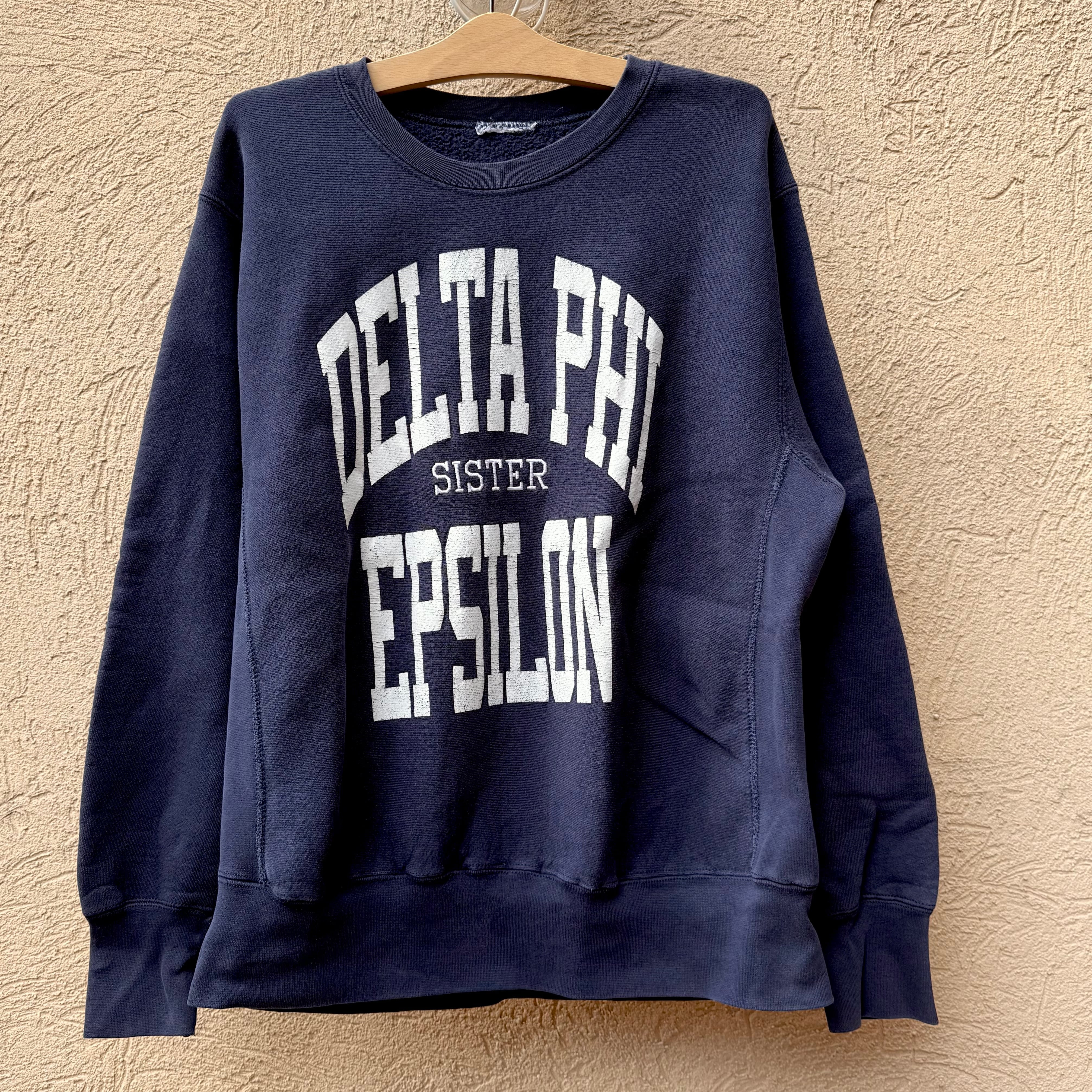 プリントは、ペンシルベニア州フィラデルフィアに本部を置くデルタ・ファイ・イプシロンのプリントに DELTA PHI と EPSILON 間に SISTER の刺繍が入るプリントと刺繍で三段となるインパクトあるリバースウィーブです。