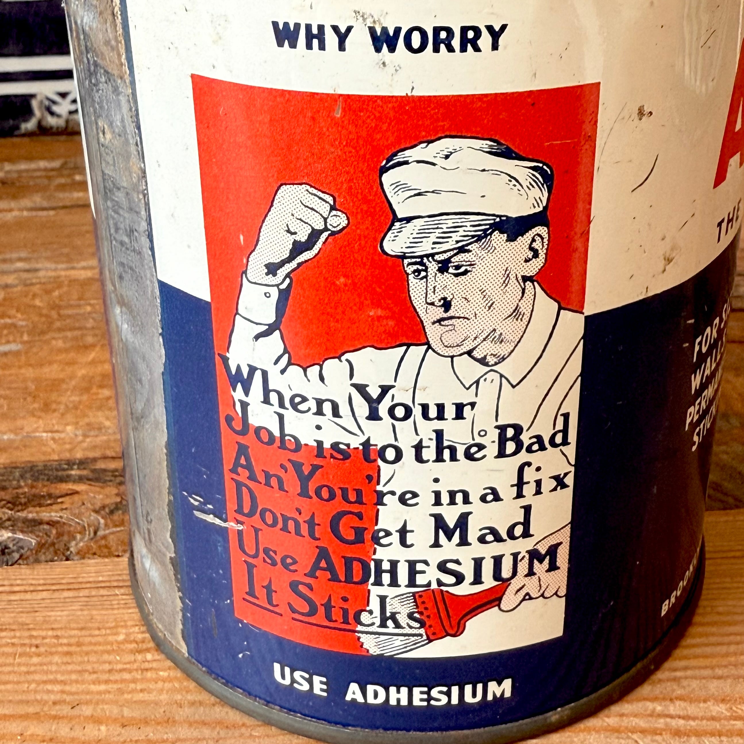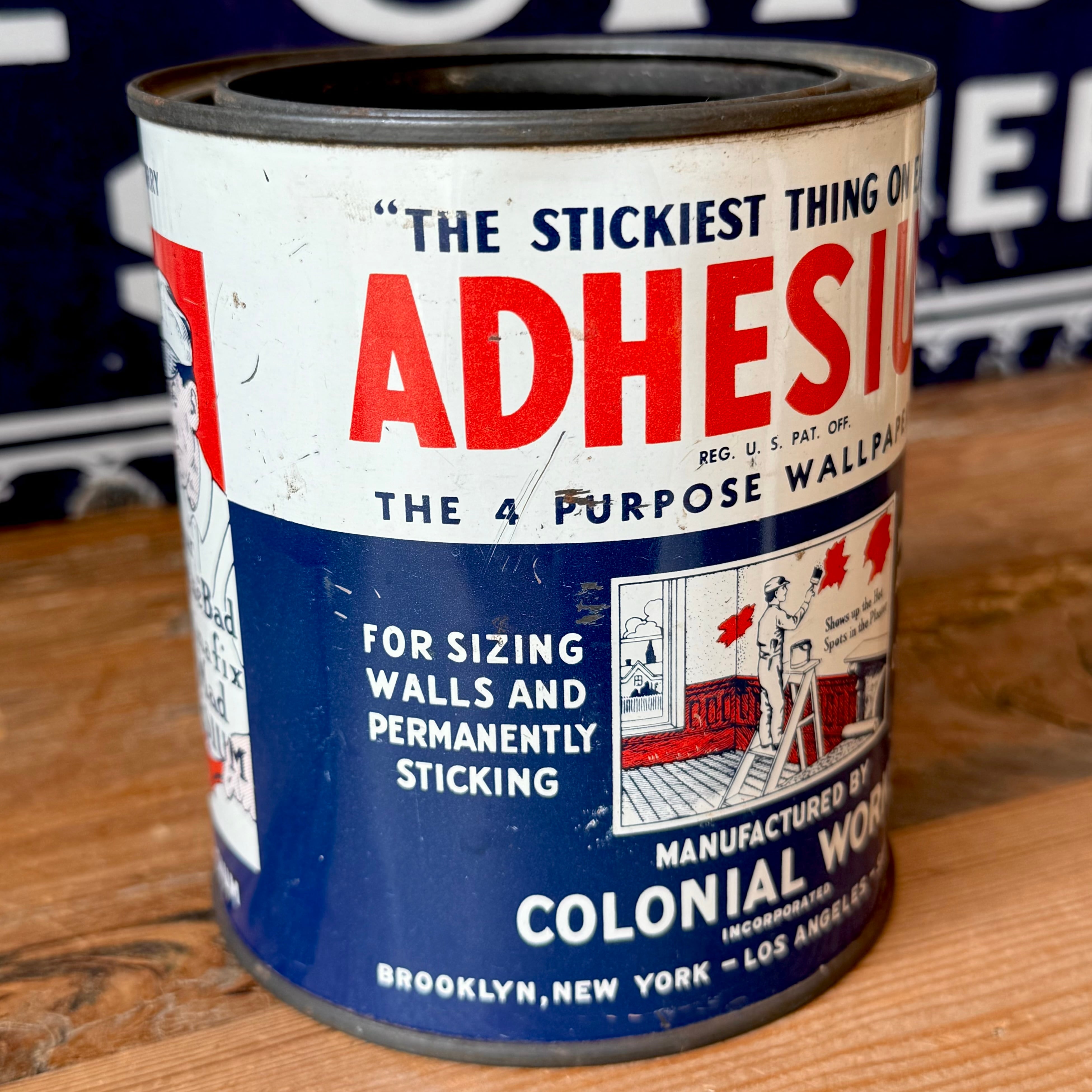缶のフロントには、“THE STICKIEST THING ON EARTH” ADHESIUM とあり、接着剤が入っていた缶で、ステップラダーに乗って塗る姿やサイドの刷毛を持ってワークキャップを被りシャツにオーバーオールを着た感じと言いワークな雰囲気盛り沢山の缶です。