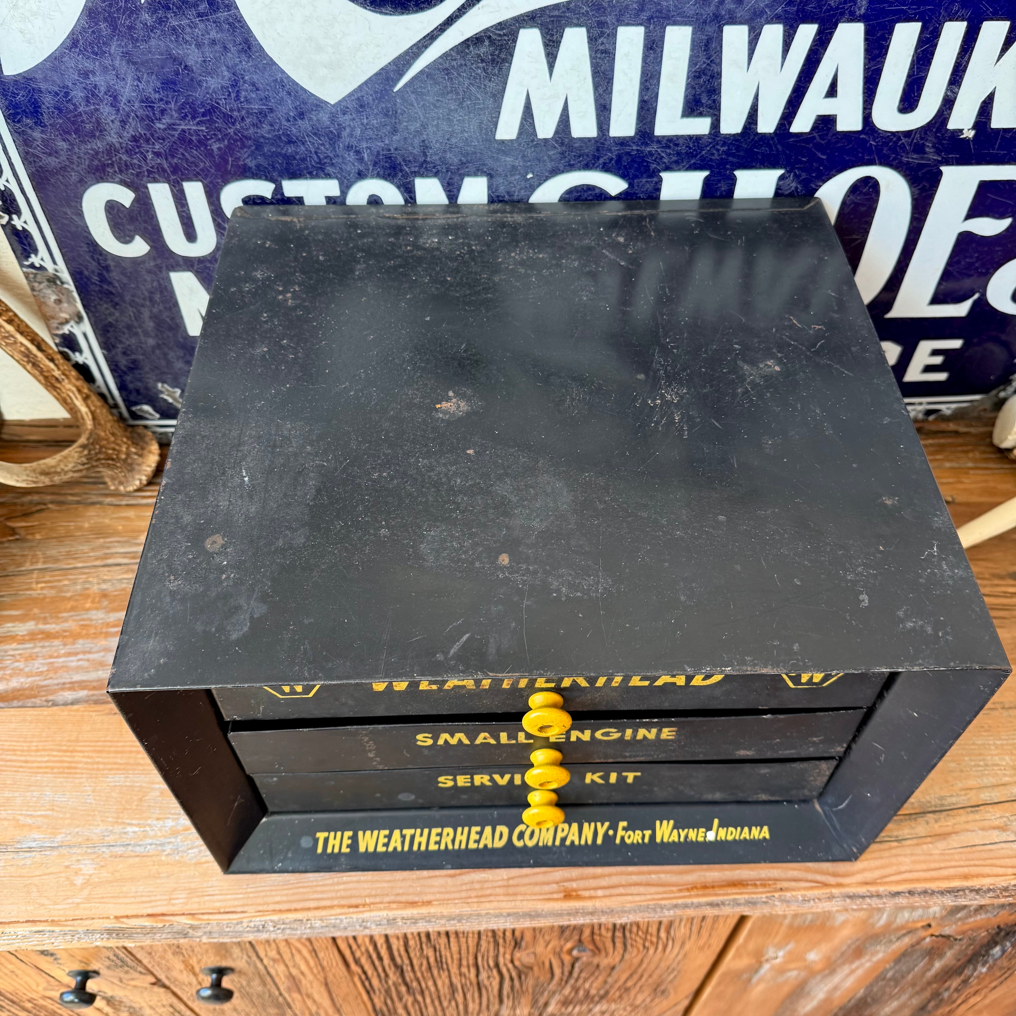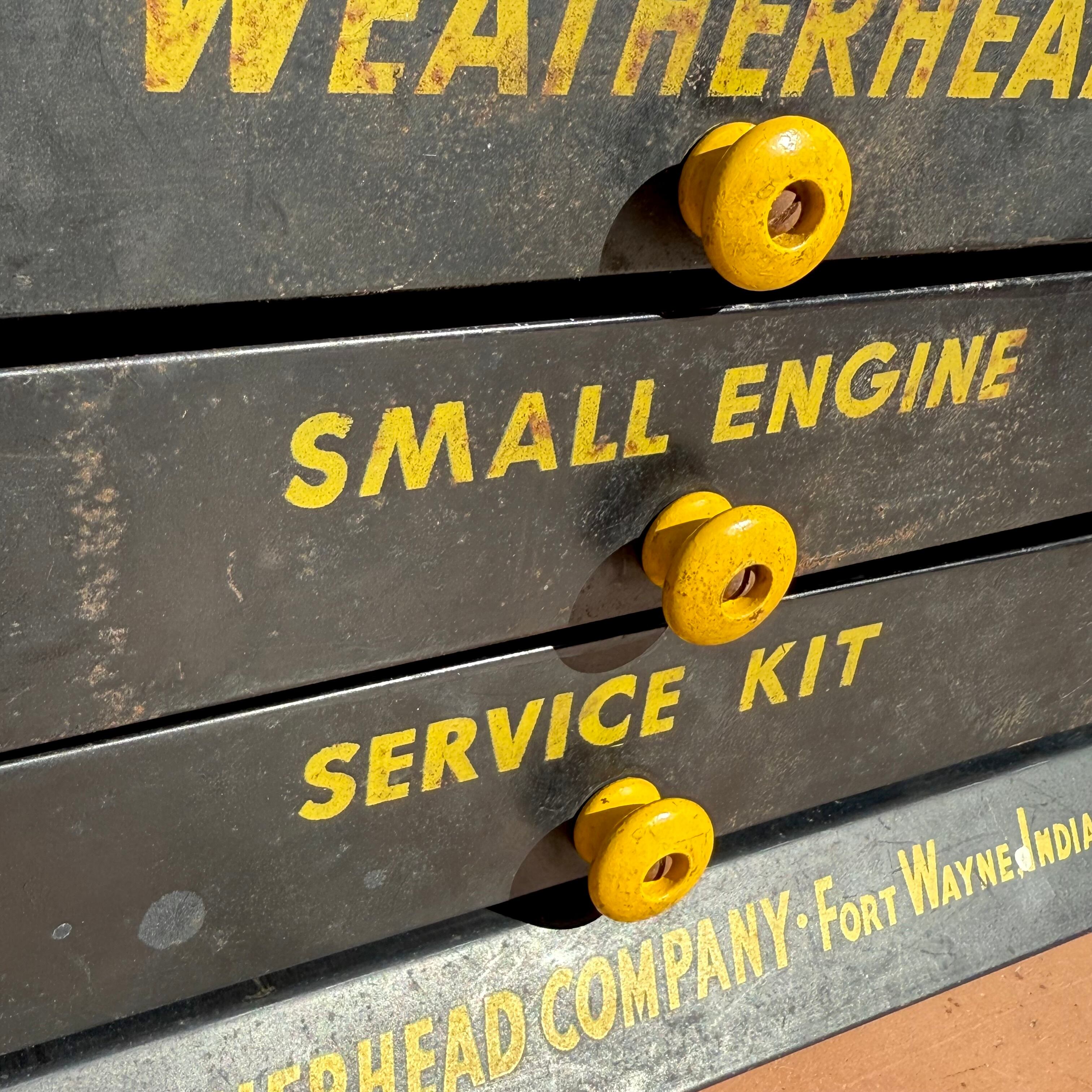 上段は、ウェザーヘッドカンパニーのアイコンマークの間に WEATHERHEAD、中段は SMALL ENGINE、下段は SERVICE KIT、本体の下部には THE WEATHERHEAD COMPANY・FORT WAYNE, INDIANA とプリントされた文字、取っ手部分のイエローのノブ、更にはサビやキズ、スレなどのリアルエイジングの雰囲気も最高です。