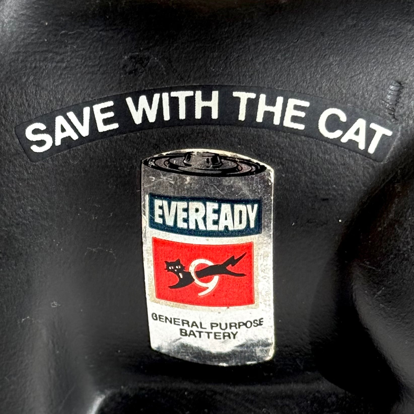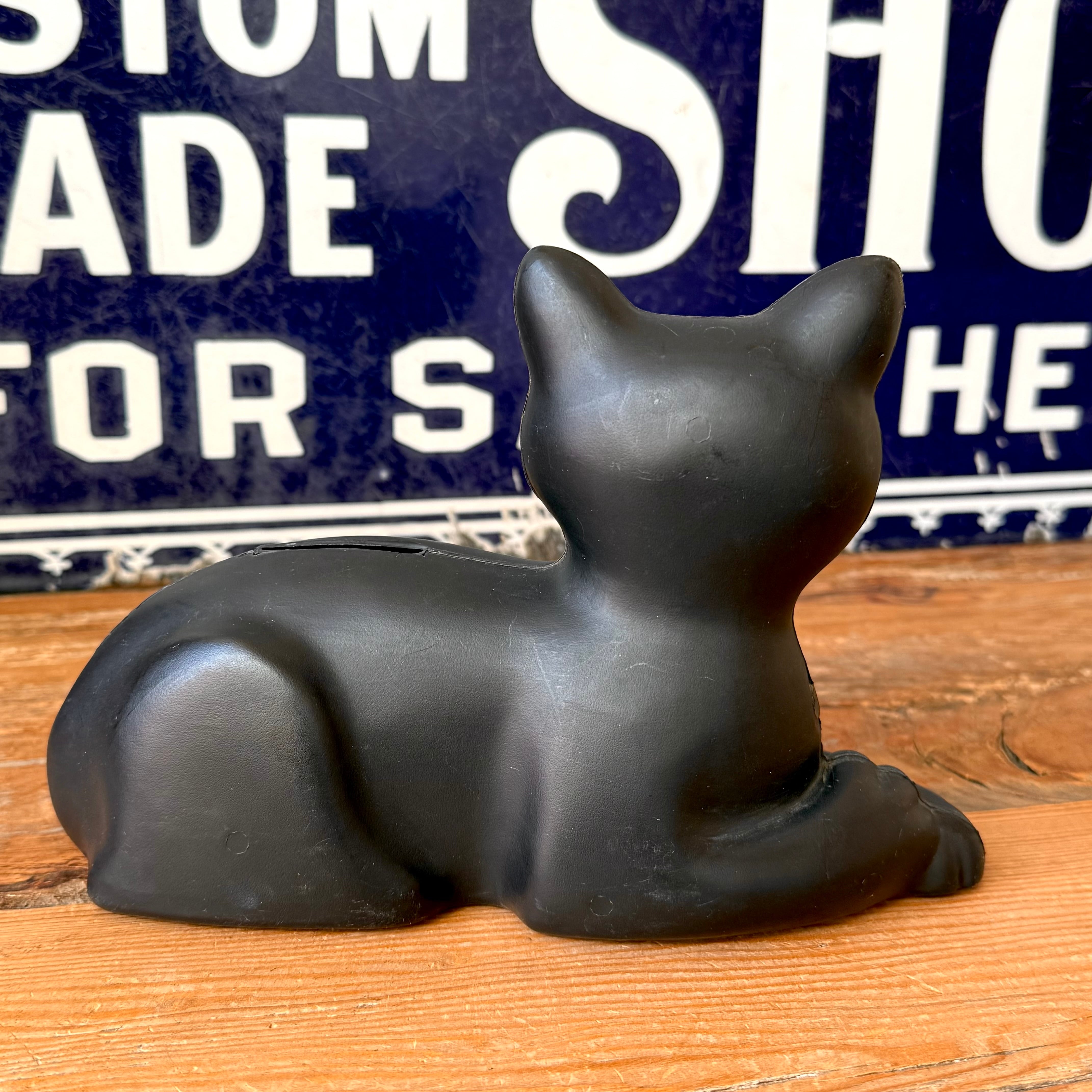 “SAVE WITH THE CAT” と電池のマークがアメリカらしく、アメリカで長寿を意味する黒猫、電池もバッテリーもちの良い長寿とかけたアドバタイジングの貯金箱です!