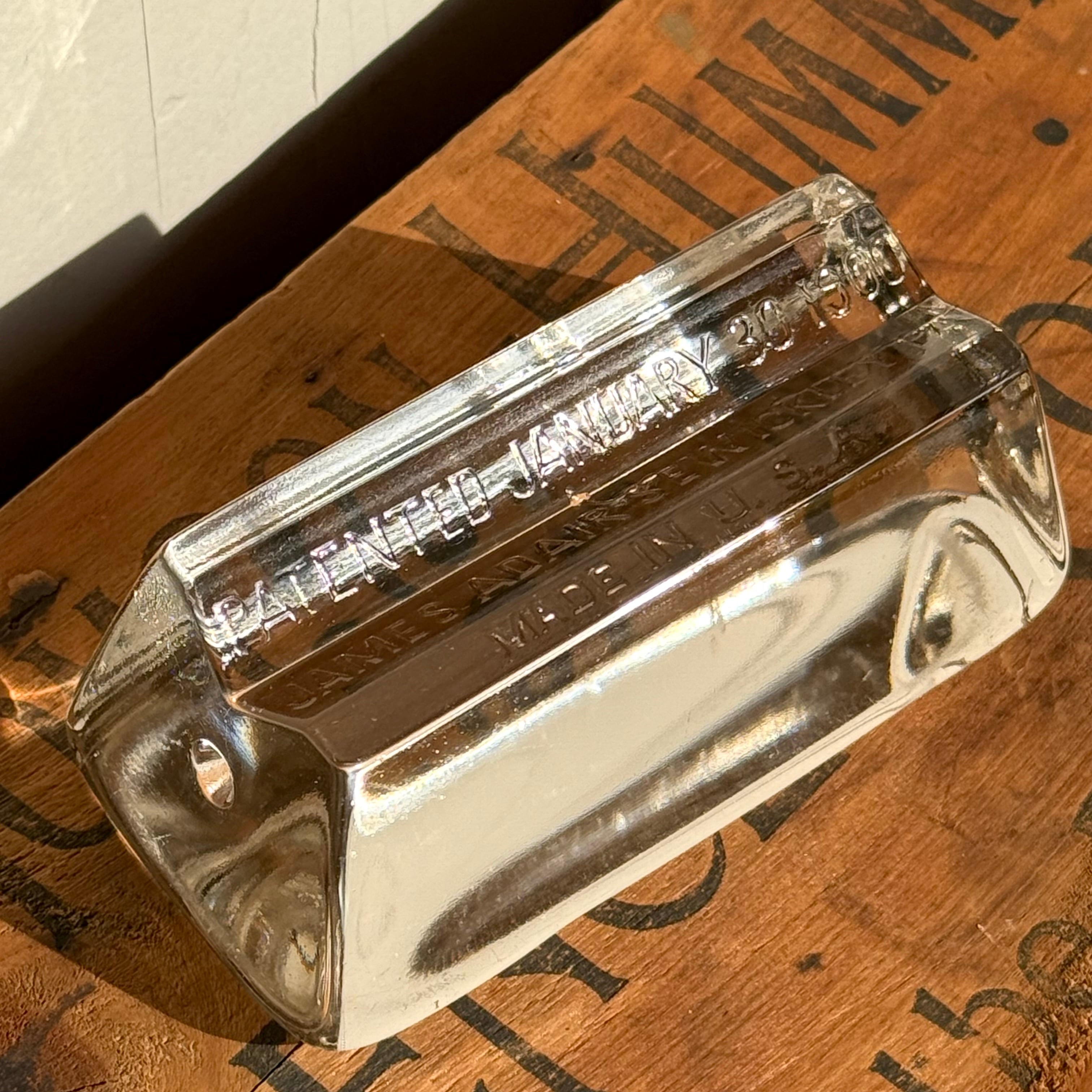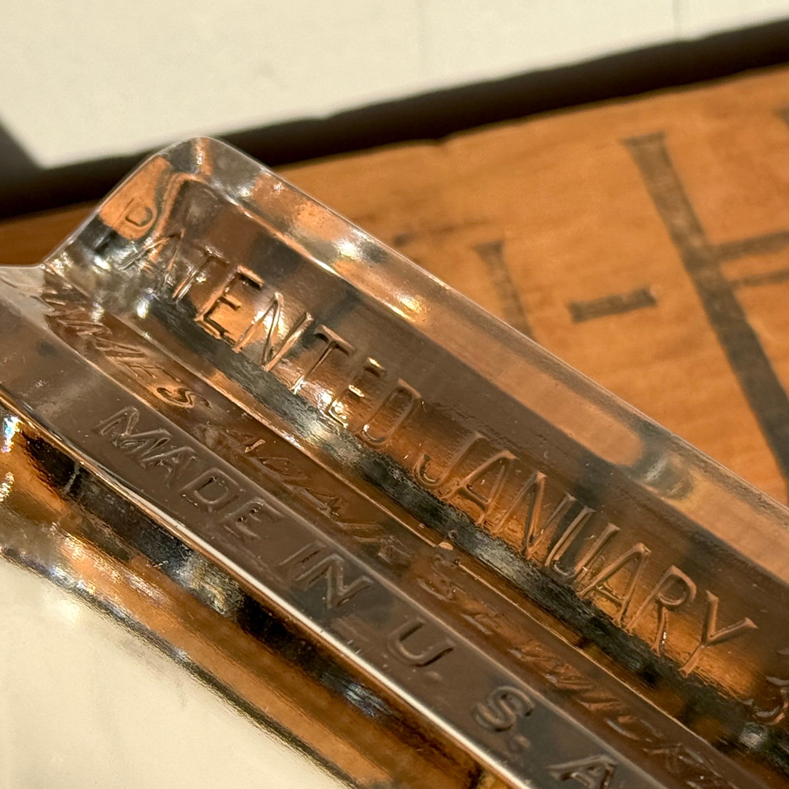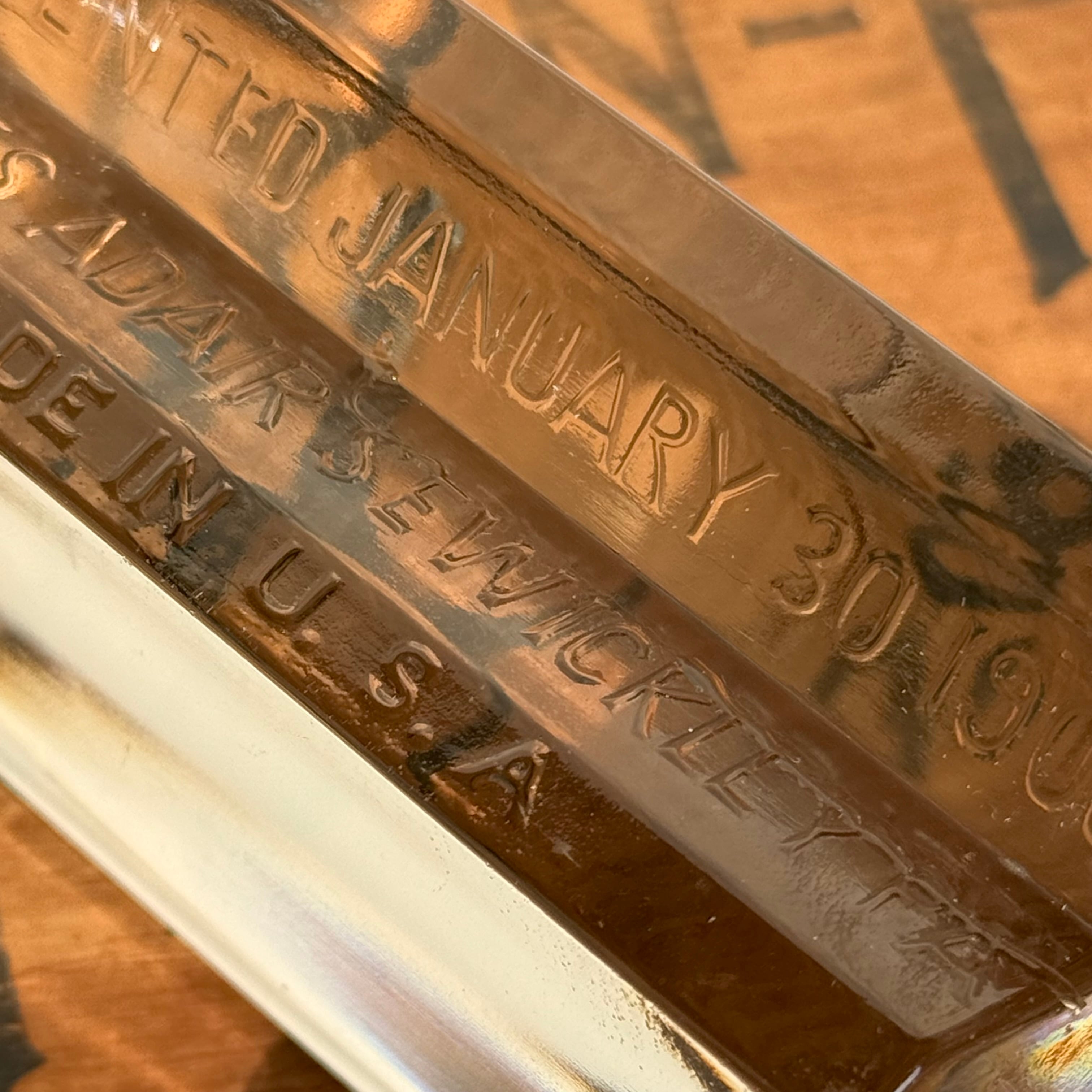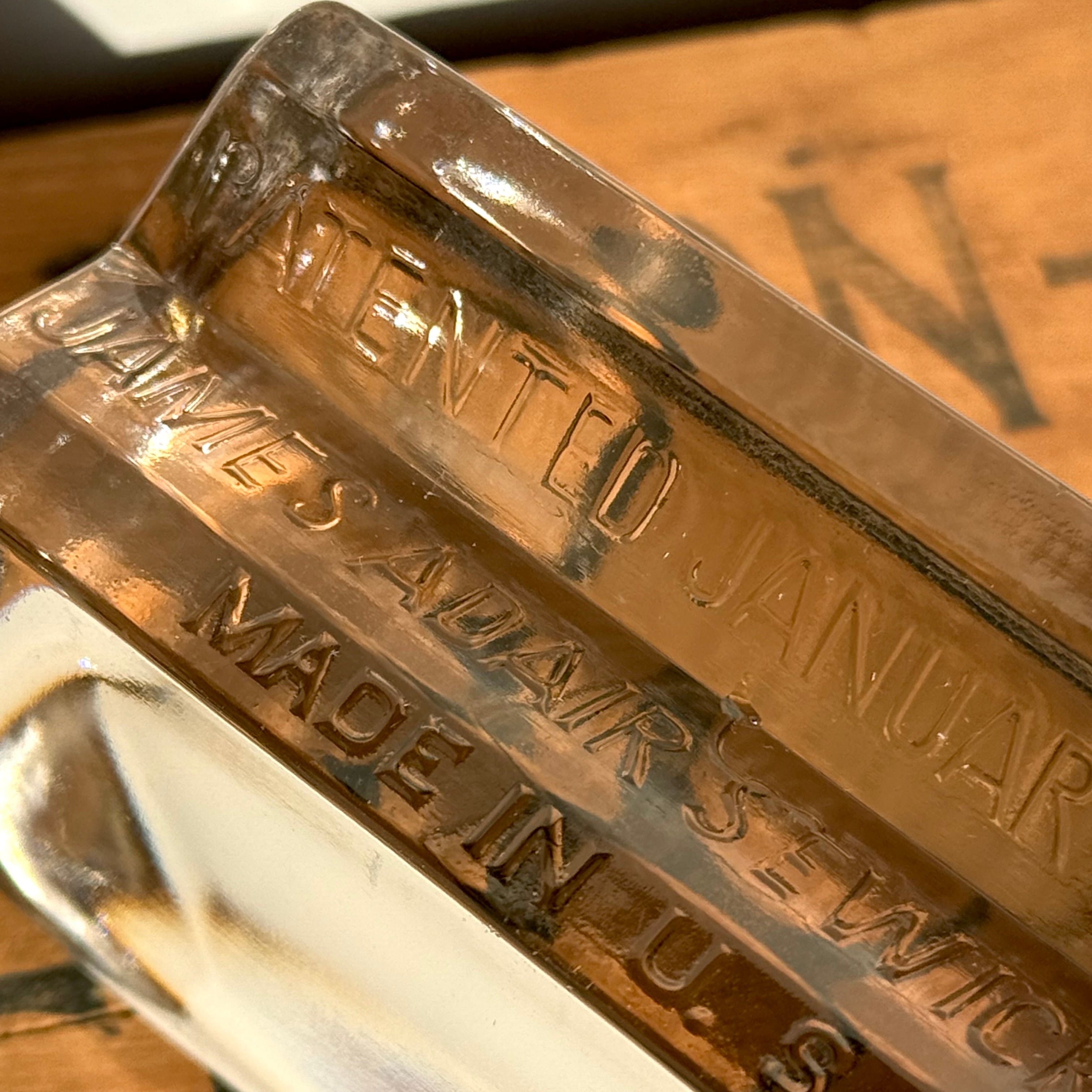 透き通ったクリアガラスで上部に窪みのある作り、どっしりとした 500グラムオーバーの重厚な作りで、上部に PATENTED JANUARY 30 1900 JAMES ADAIR SEWICKLEY PA MADE IN U.S.A. とエンボスされています。