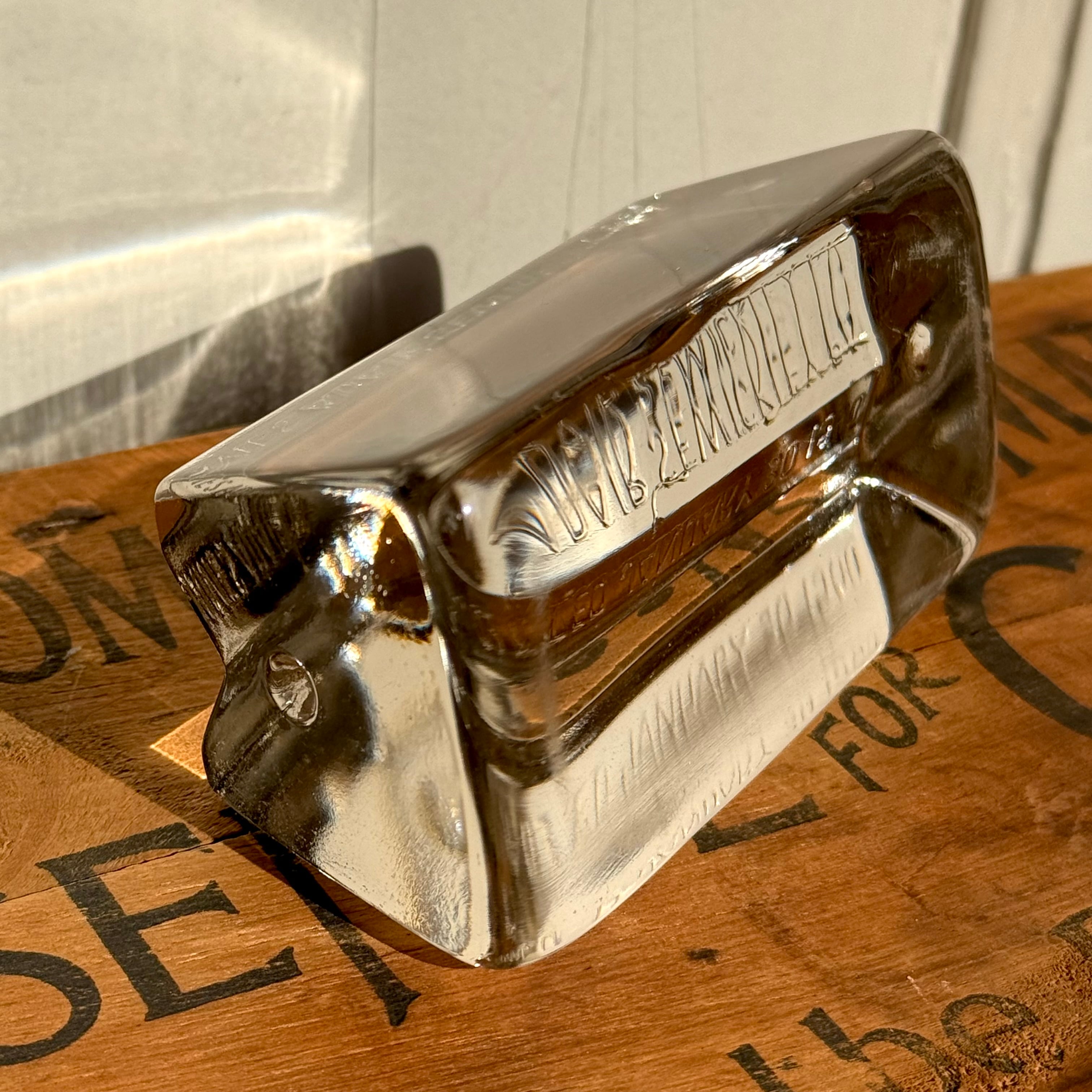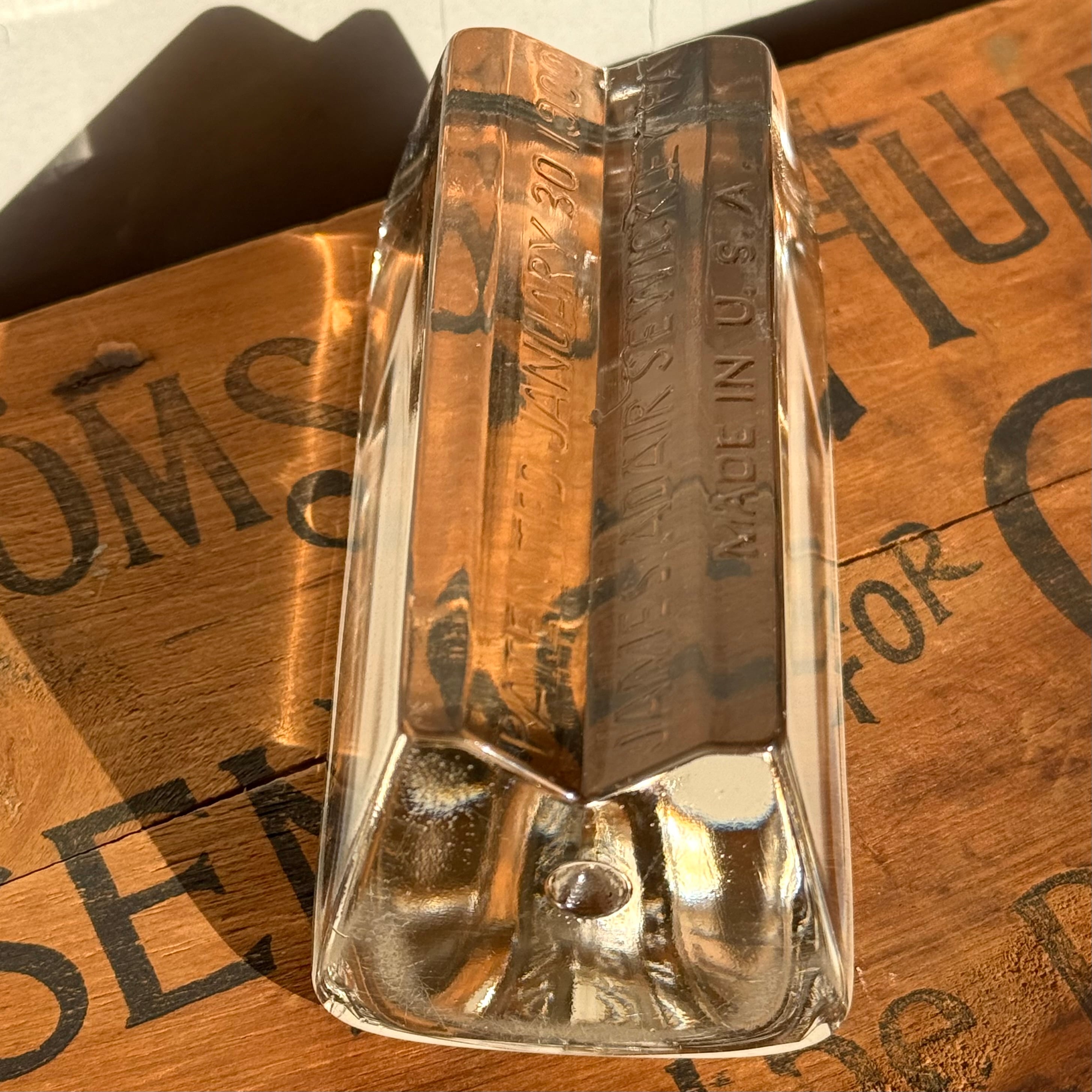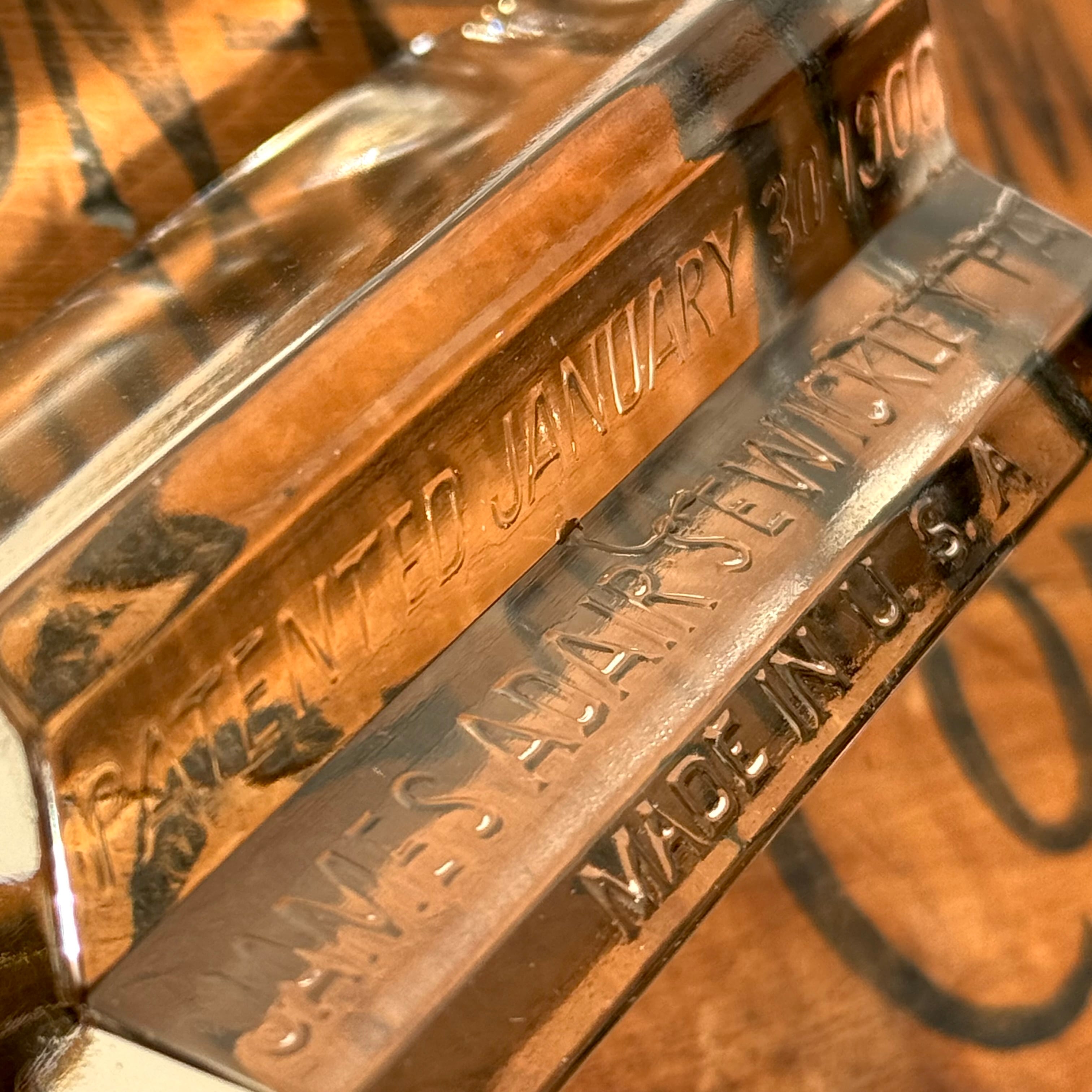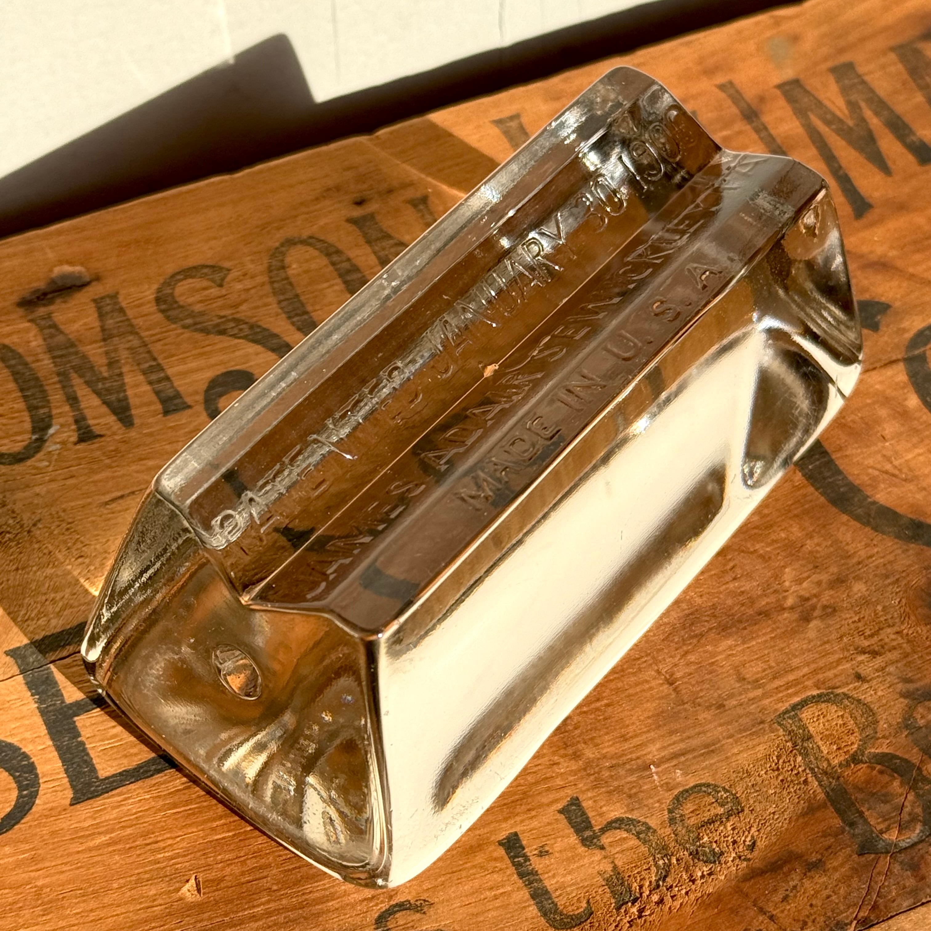 透き通ったクリアガラスで上部に窪みのある作り、どっしりとした 500グラムオーバーの重厚な作りで、上部に PATENTED JANUARY 30 1900 JAMES ADAIR SEWICKLEY PA MADE IN U.S.A. とエンボスされています。
