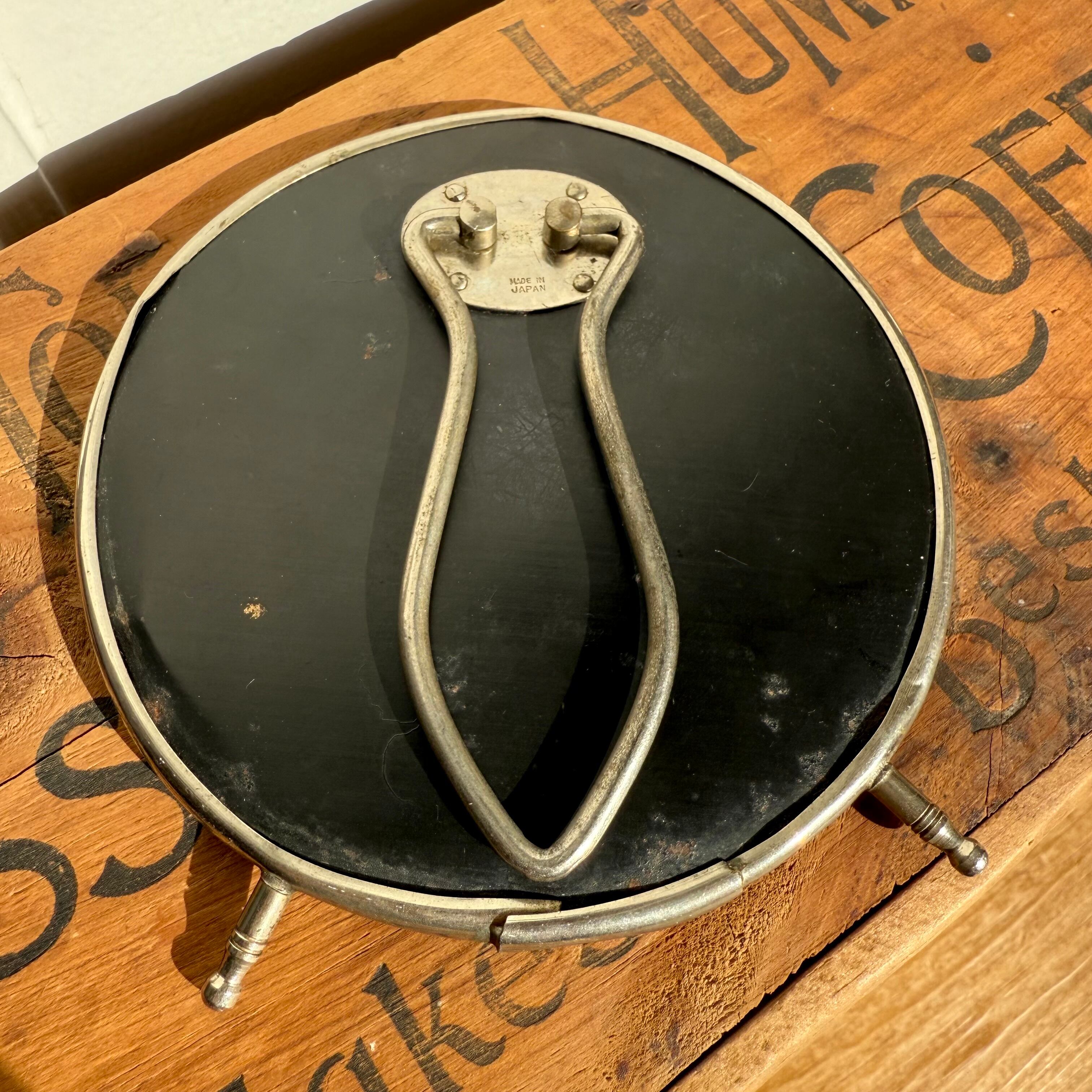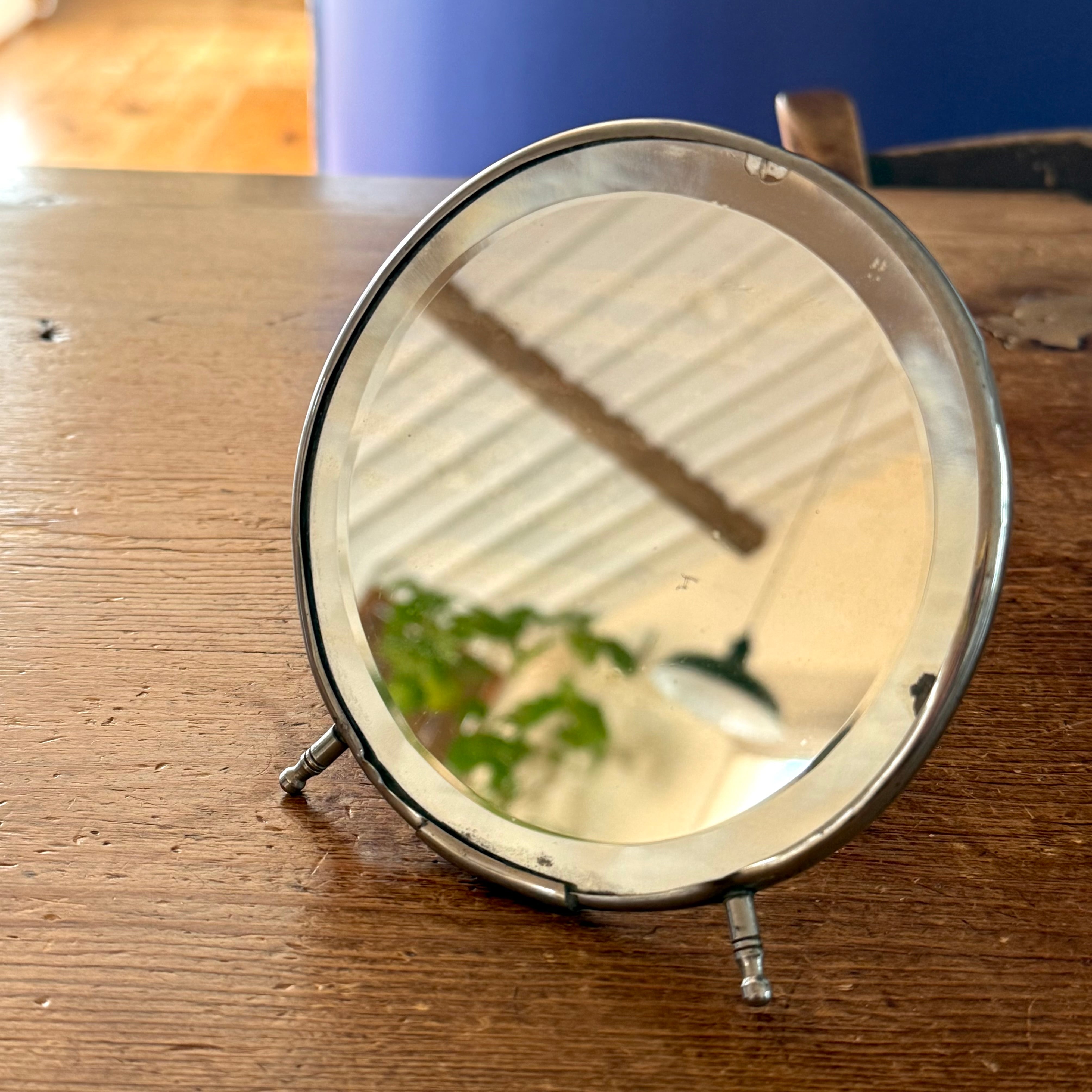 畳んで持ち運びできるスタンドミラー、当時鏡の無い場所やお部屋での化粧、シェイビングなど、また携帯用と使われていたいたと思われる1950年代以前~1950年代頃のミラーだと思われ、日本製。
