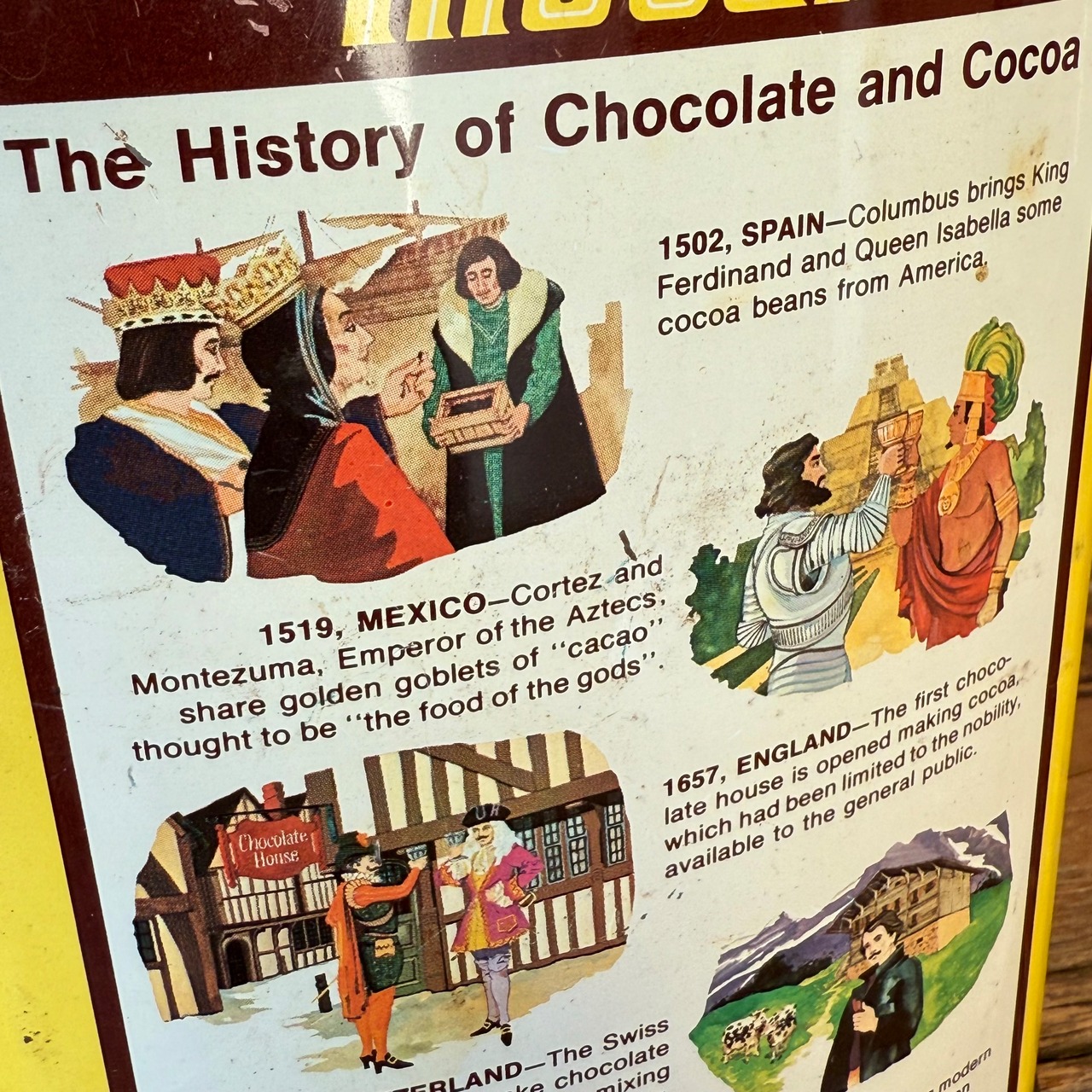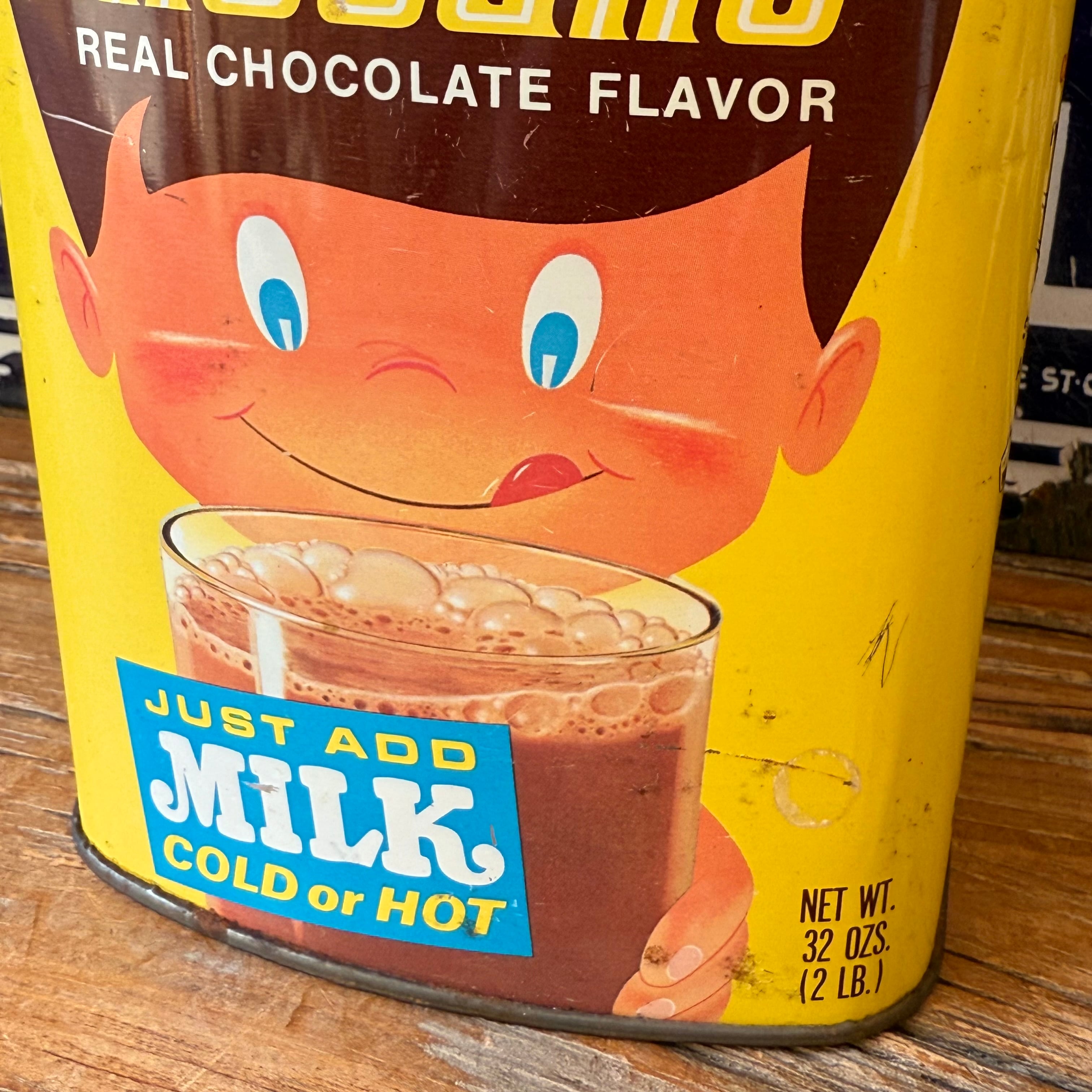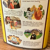 ミルクと混ぜて飲む粉末が入っていた缶で、サイドには作り方、裏面にはチョコレート、ココアの歴史と奥深いです!
