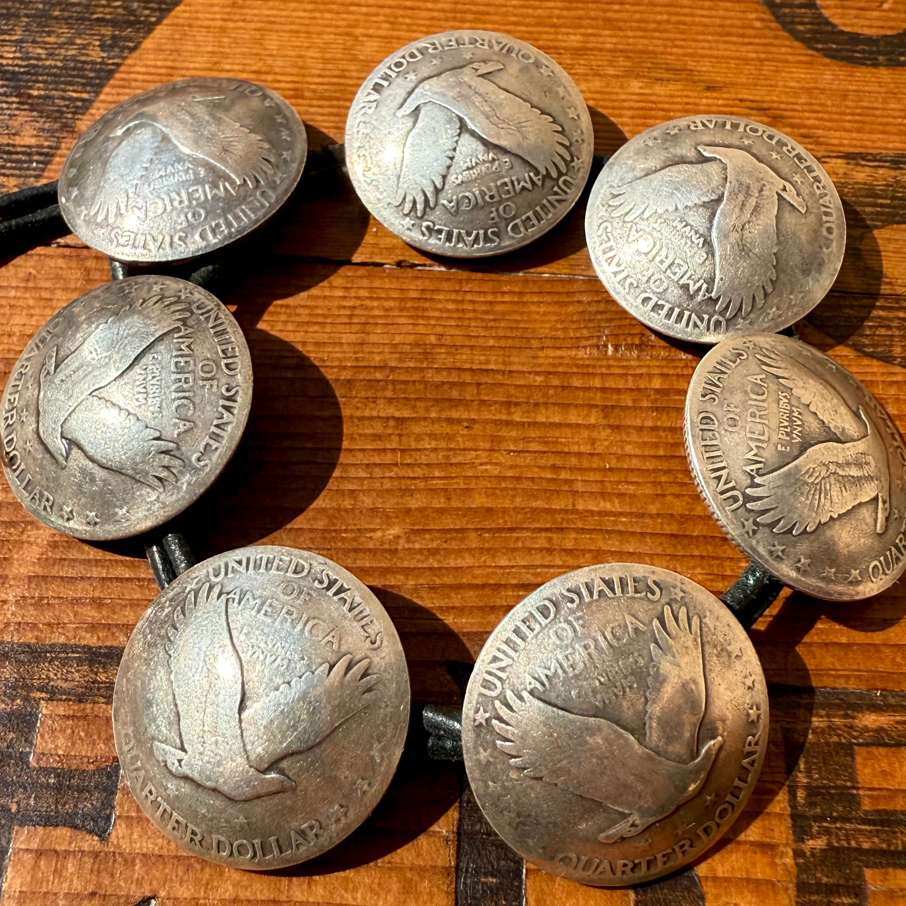 “ Standing Liberty Quarter ”の裏面となる翼を大きく広げ羽ばたくイーグルが象徴的なデザイン、古い年代に見られる当時のコインを使用したビンテージのジュエリーも数多く存在し、こちらは1926年〜1929年に製造されたアメリカの“ Standing Liberty Quarter ”を一点一点コンチョに仕上げ、レザーを通しブレスレットに仕上げられています。