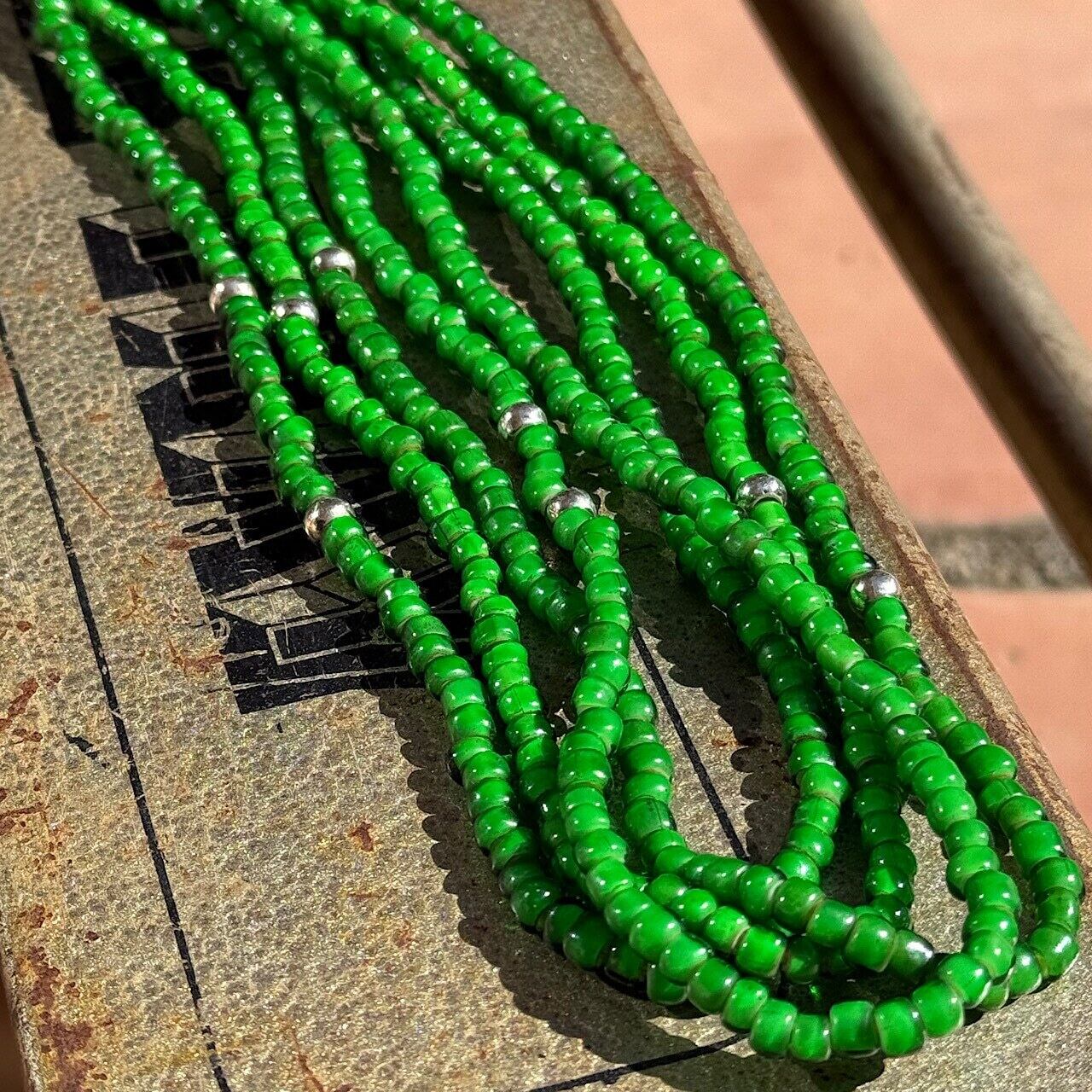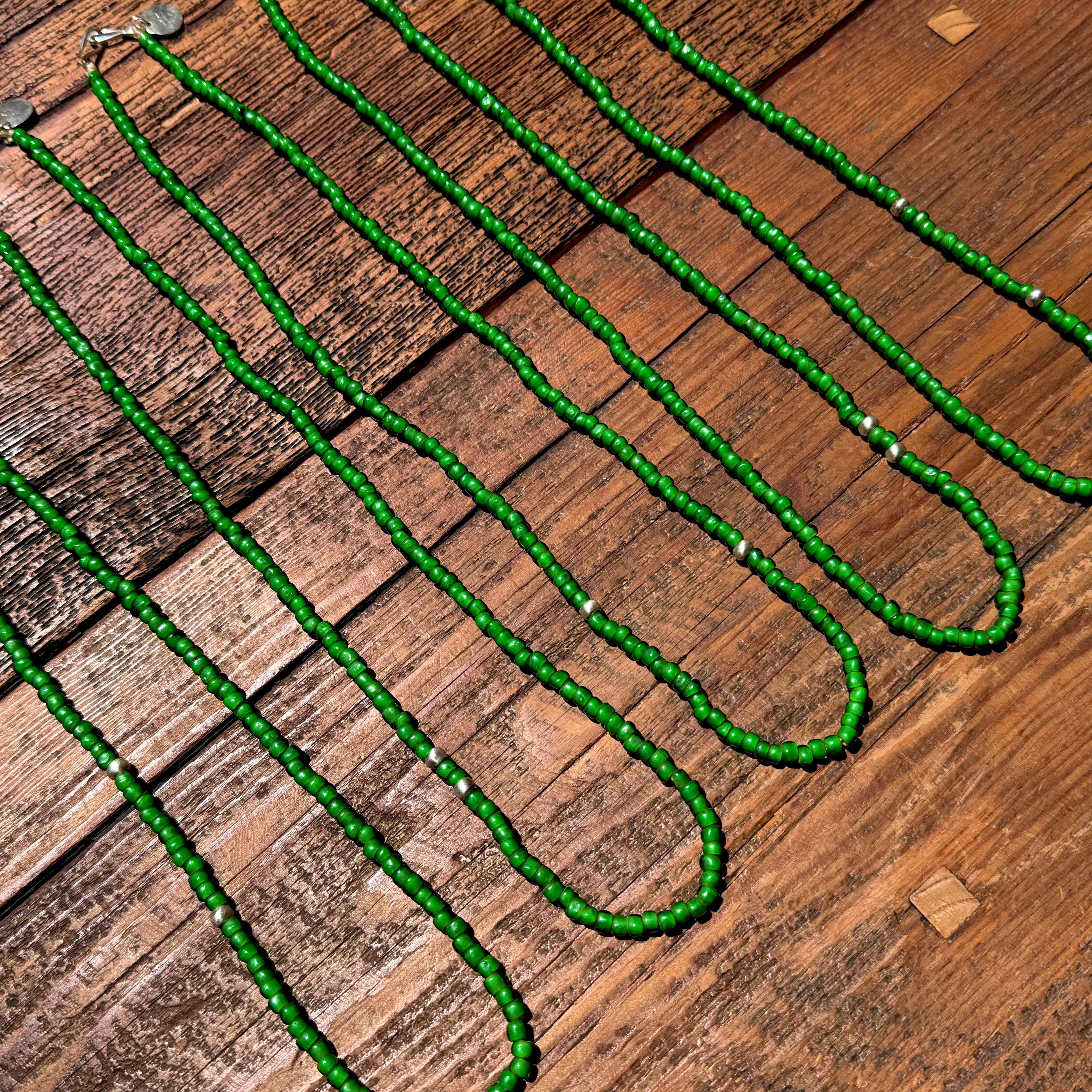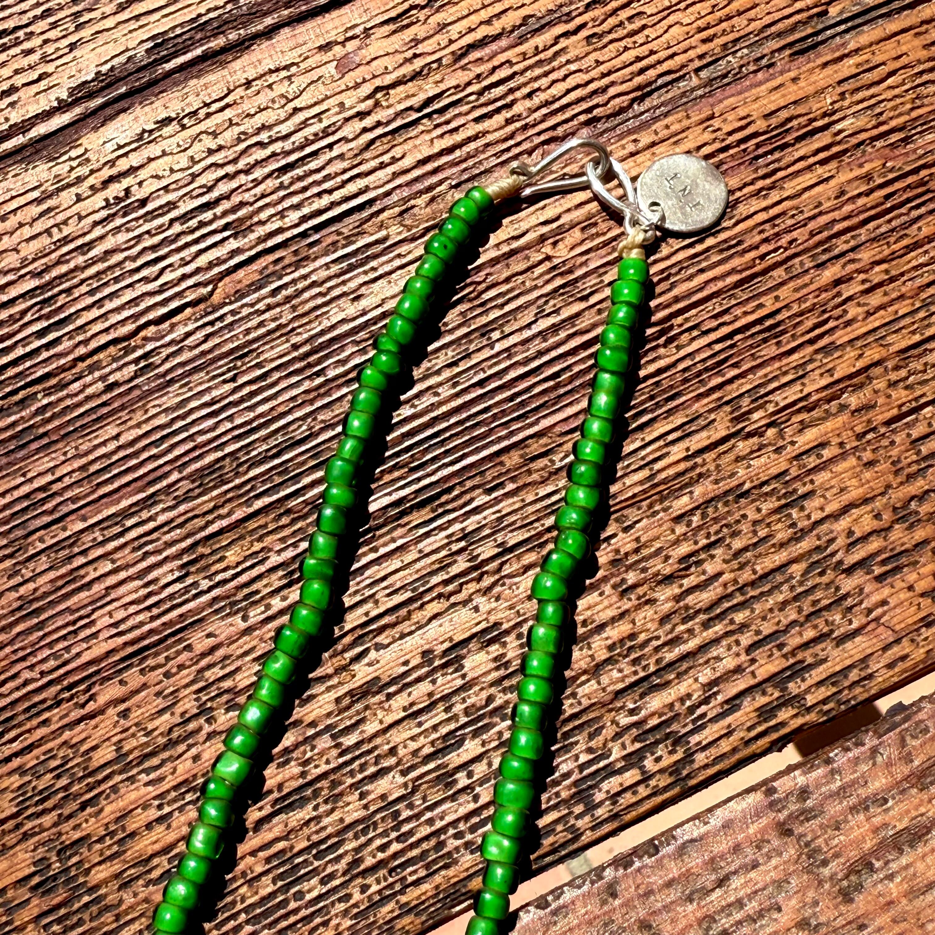 ビーズも貴重となるグリーンのビーズに濃淡あるグリーンのビーズをミックスし使用したビンテージ感ある雰囲気で、インポート、ドメスティック、古着など洋服のジャンルを問わない合わせ易さも魅力です!