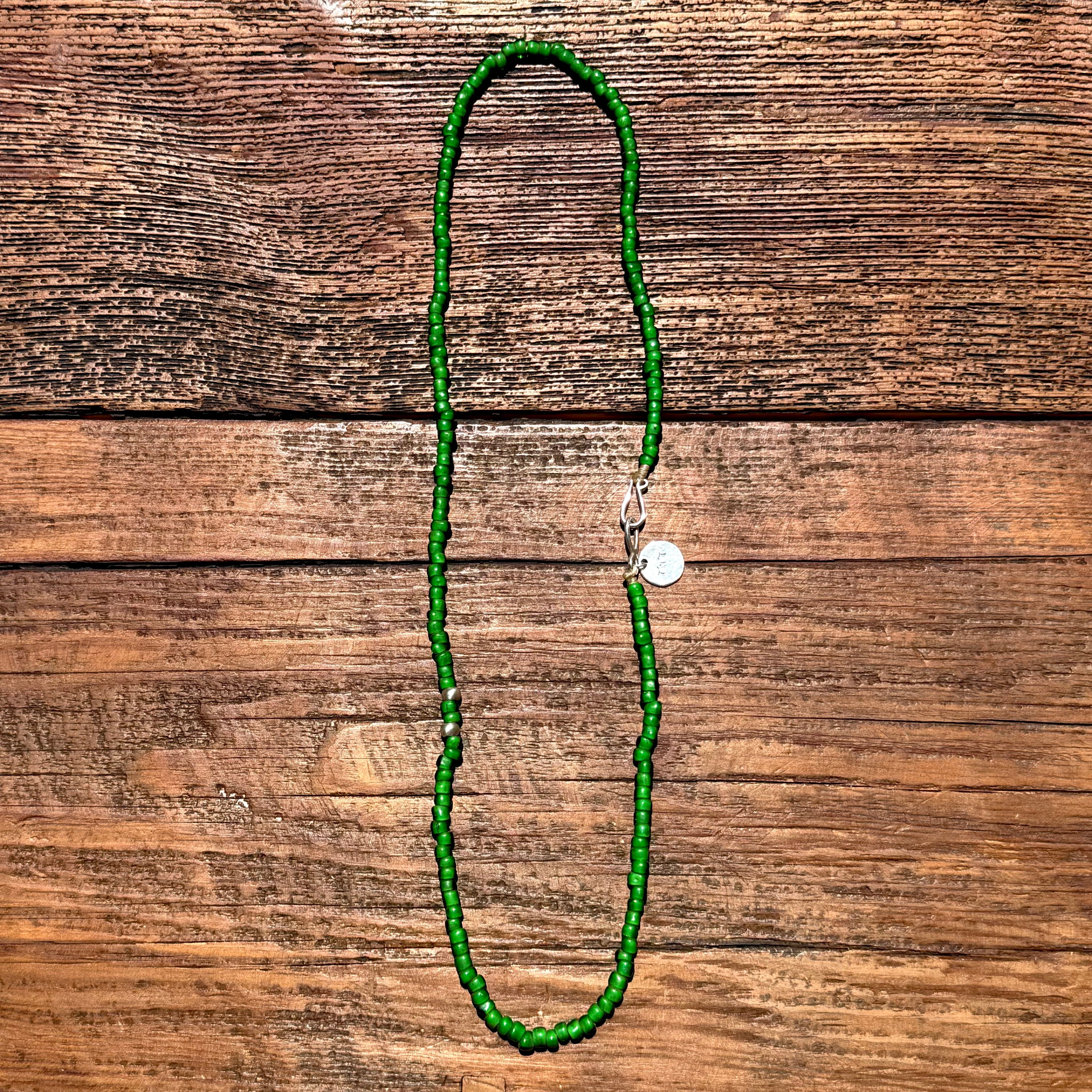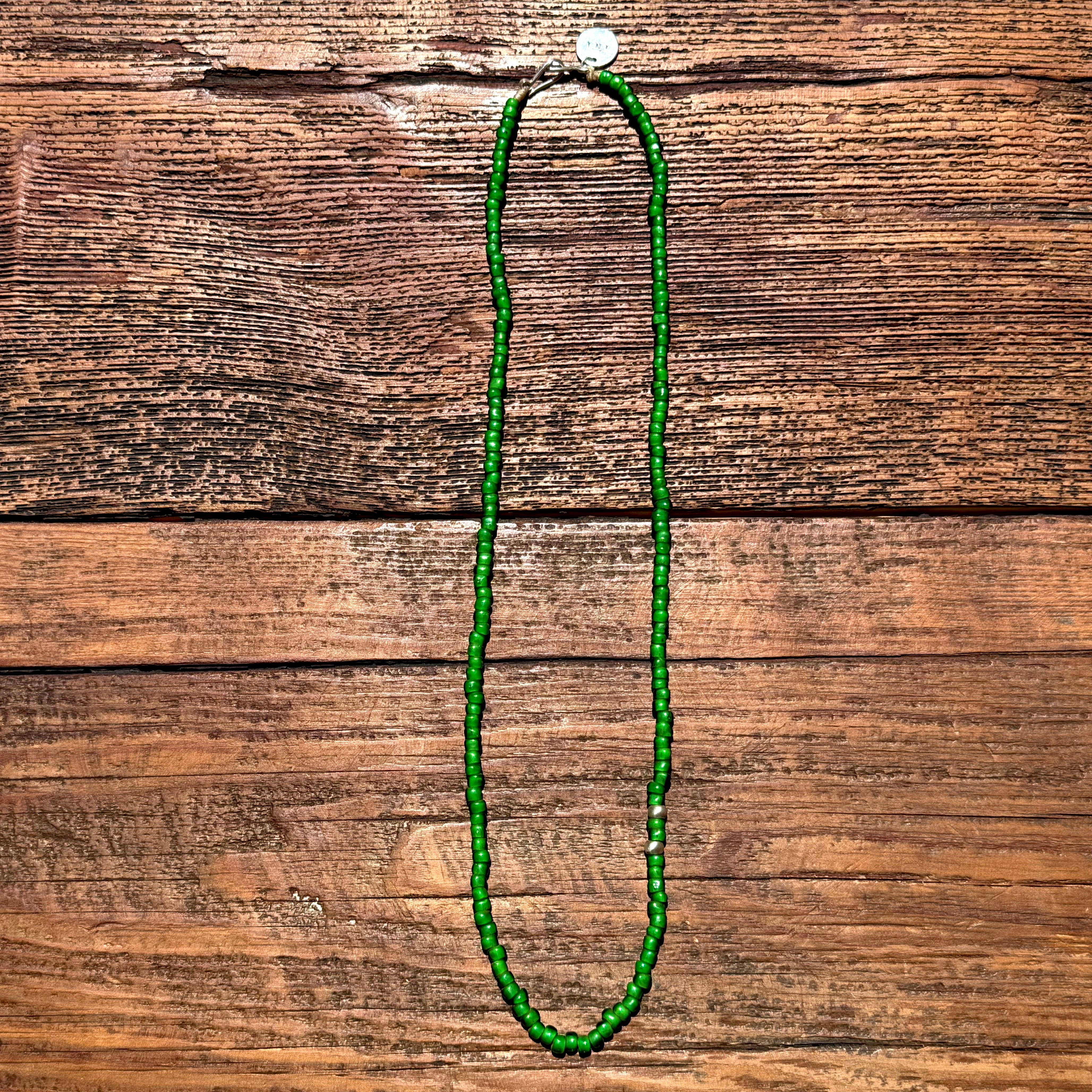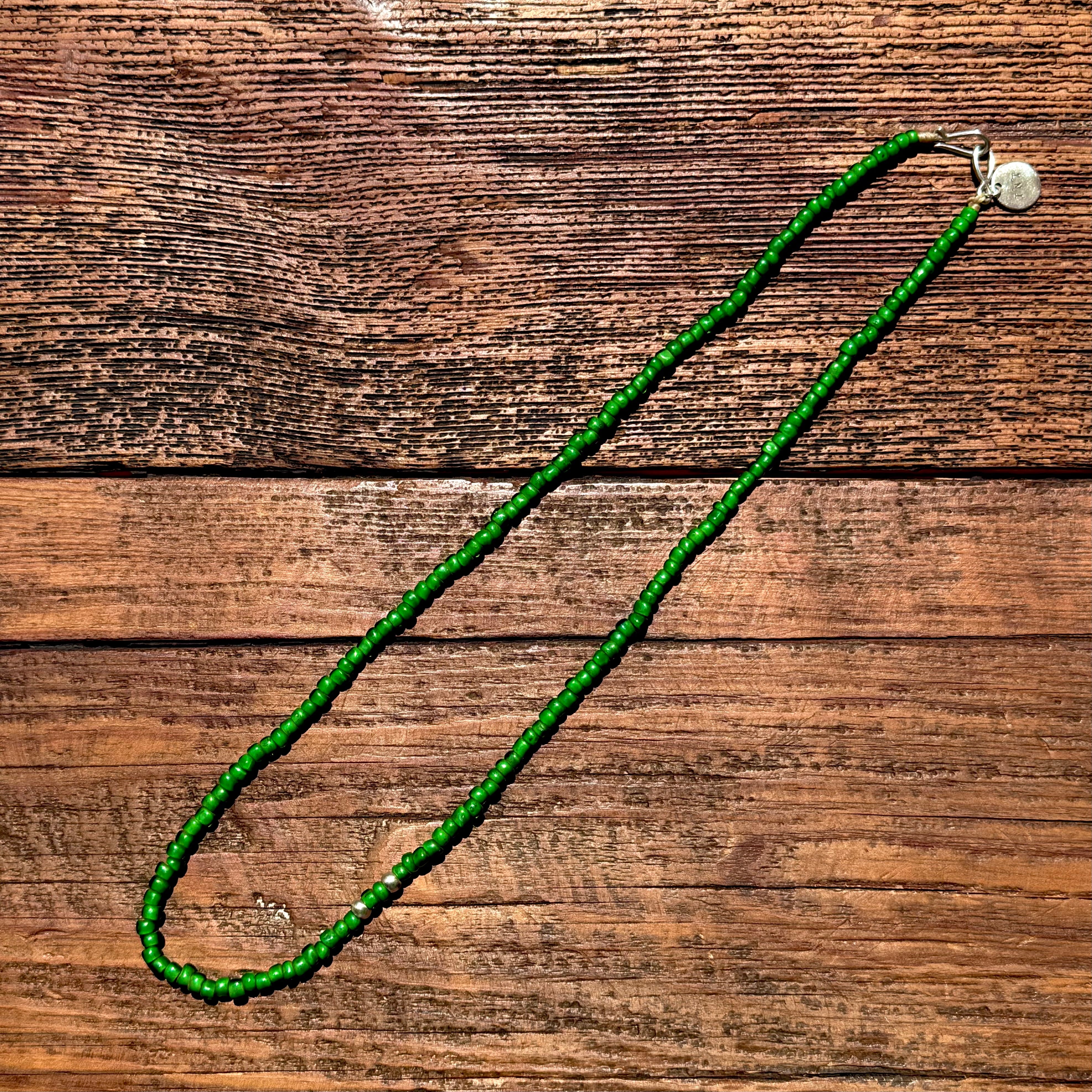ビーズも貴重となるグリーンのビーズに濃淡あるグリーンのビーズをミックスし使用したビンテージ感ある雰囲気で、インポート、ドメスティック、古着など洋服のジャンルを問わない合わせ易さも魅力です!