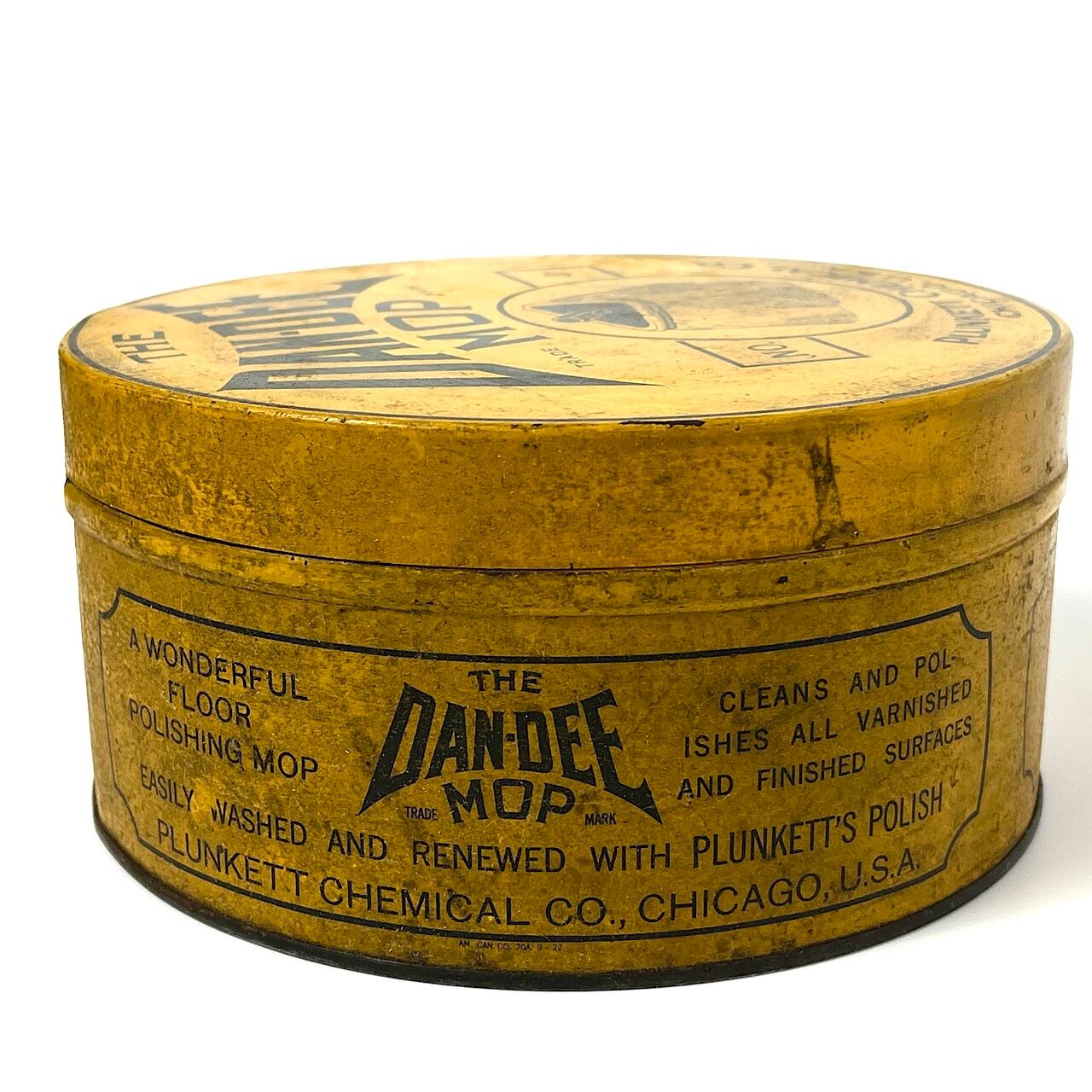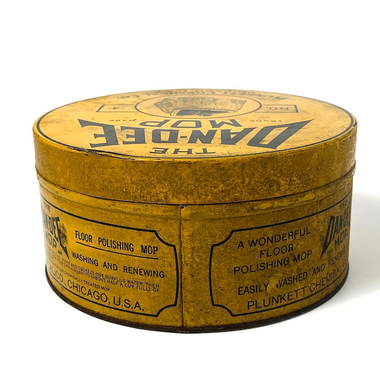 1940年代~に作られたと思われる古い缶で、わりと大き目のラウンド型でイエローにブラックのデザイン、汚れも加わり良い感じの雰囲気です。