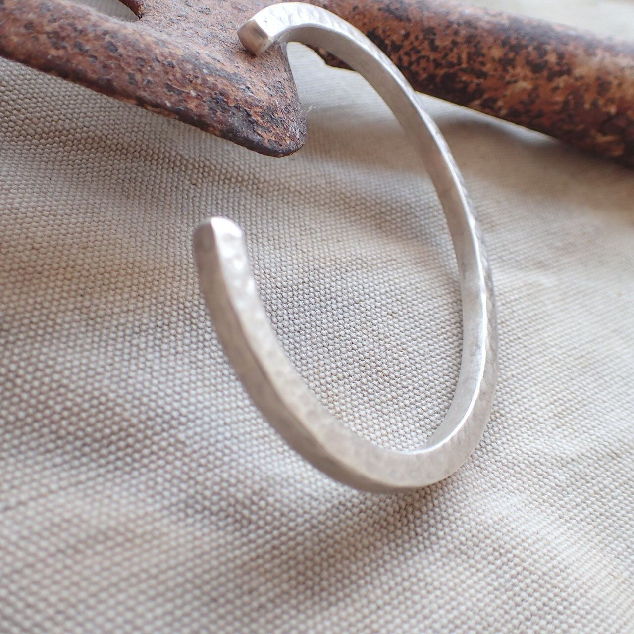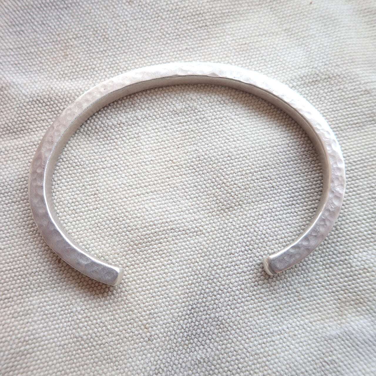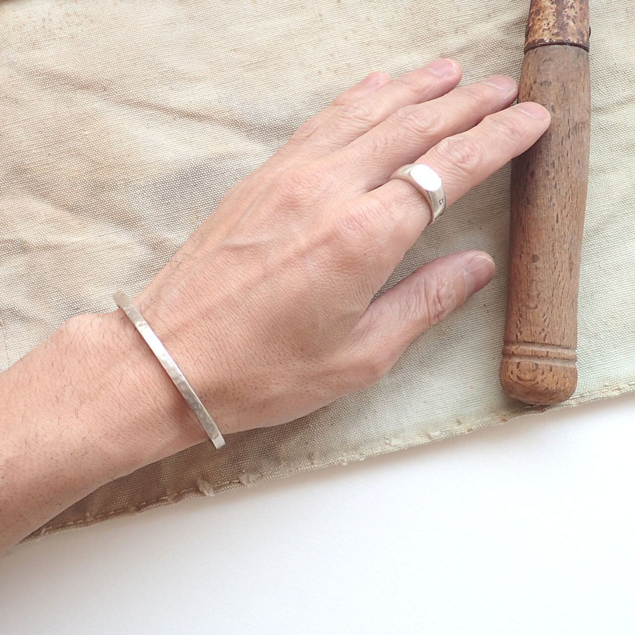 表面にはハンマー加工が施され温かみのある表情に仕上がっています。コーディネートを選ばないシンプルさと滑らかな着け心地で、毎日着用できるバングルです。