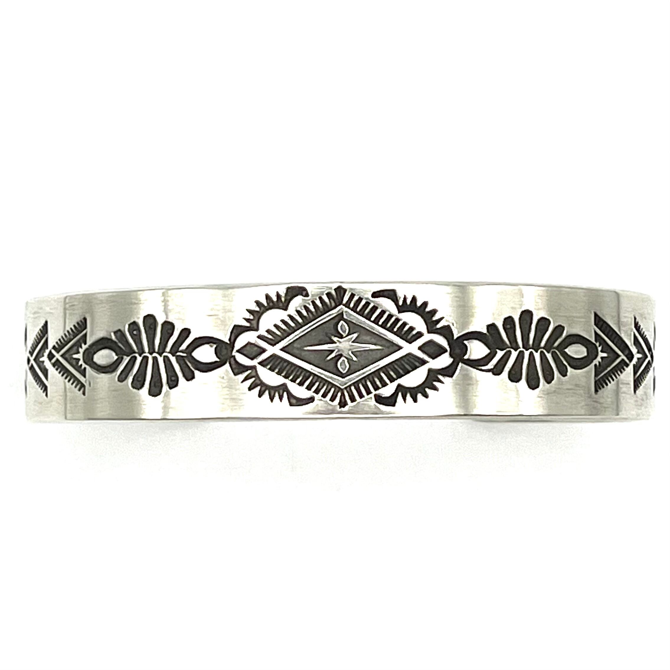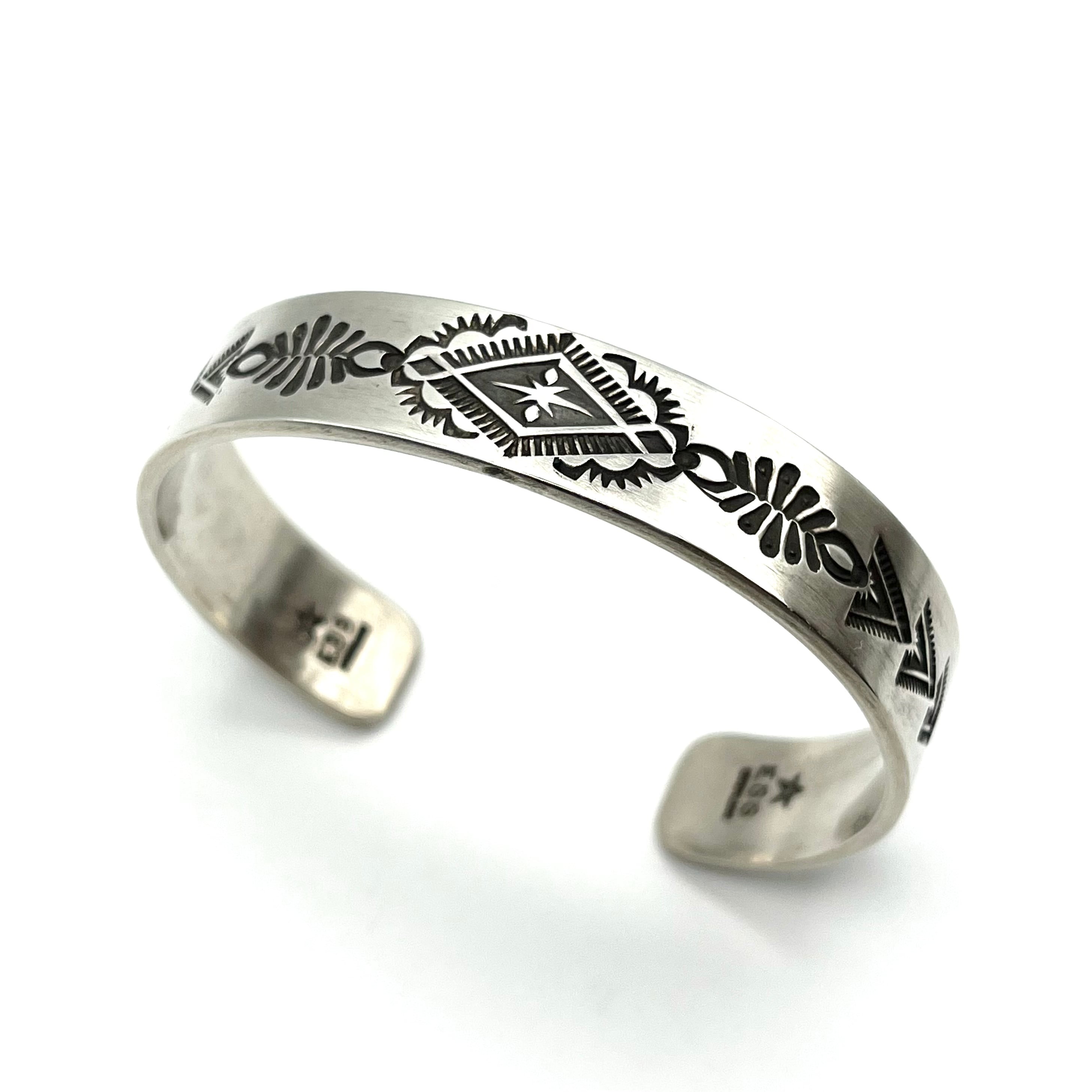 ナバホならではのクラシックな技法を駆使したブレスレットで、ハーフインチ幅にエディソンならではのセンスで配置されスタンプワークが、シンプルながら存在感あるブレスレットです。