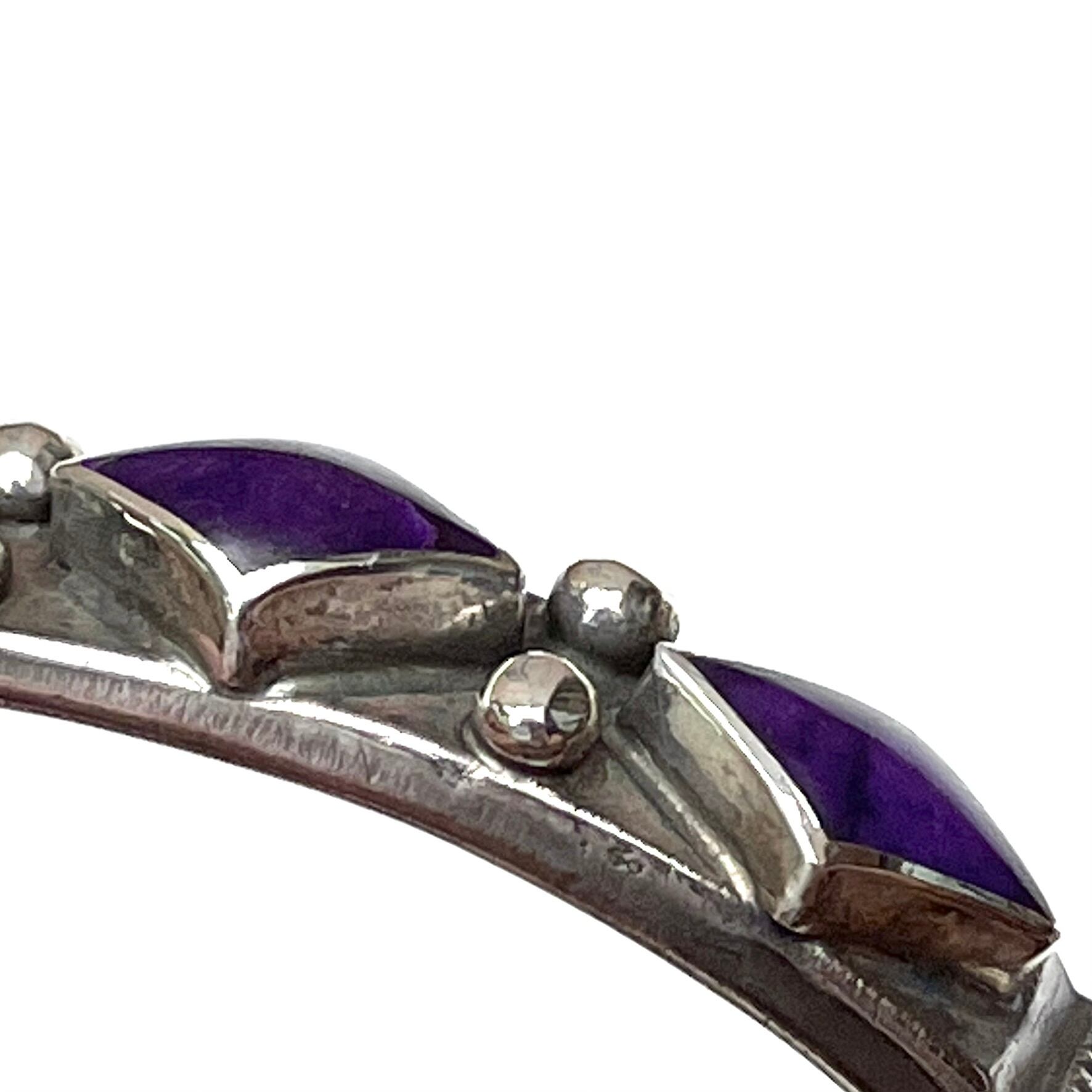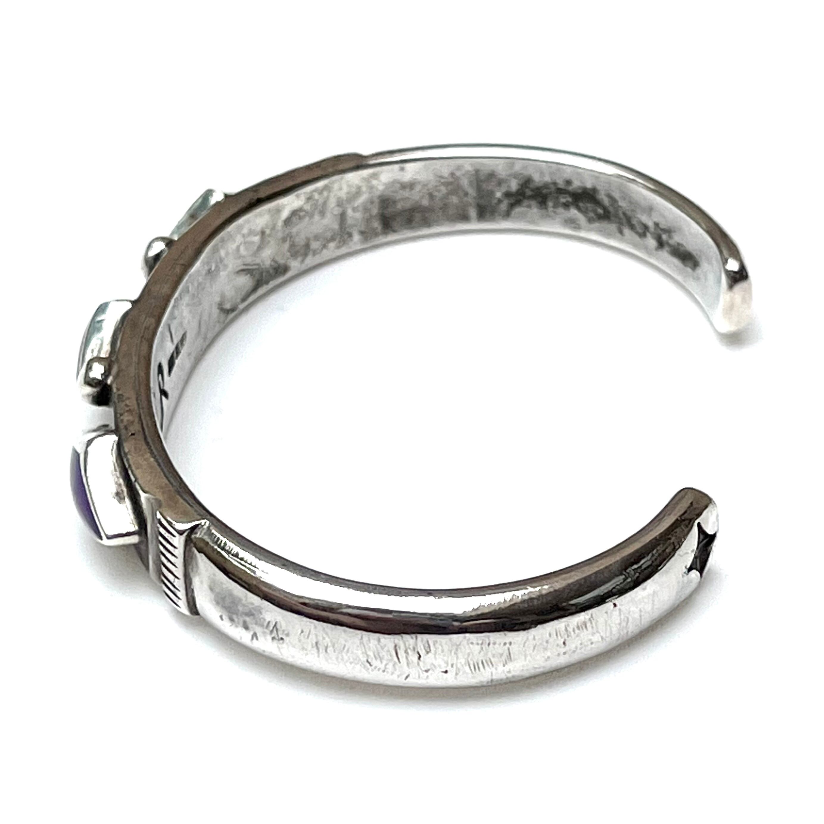 バングルのメインとなる中央に3個のひし形の“Sugilite”をセット、カラーがパープルなのが特徴のスギライトをセットしたことにより、コインシルバーを使用したトラディッショナルなスタイルでありながらも、不思議と繊細さを併せ持つ雰囲気となっています。