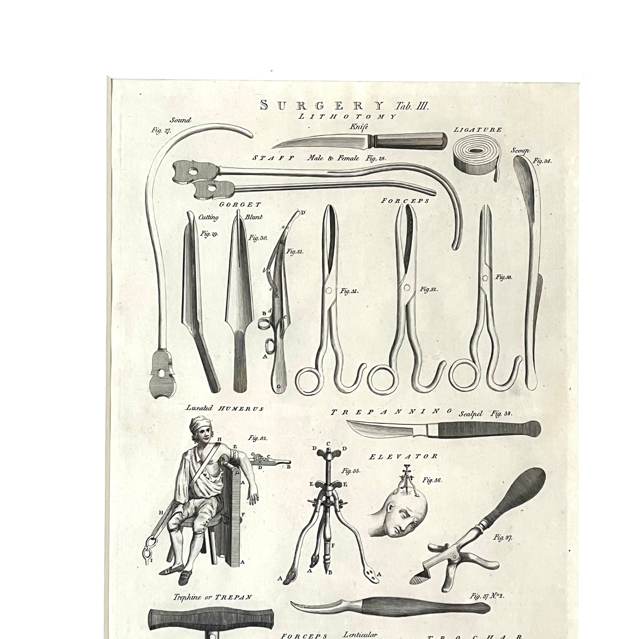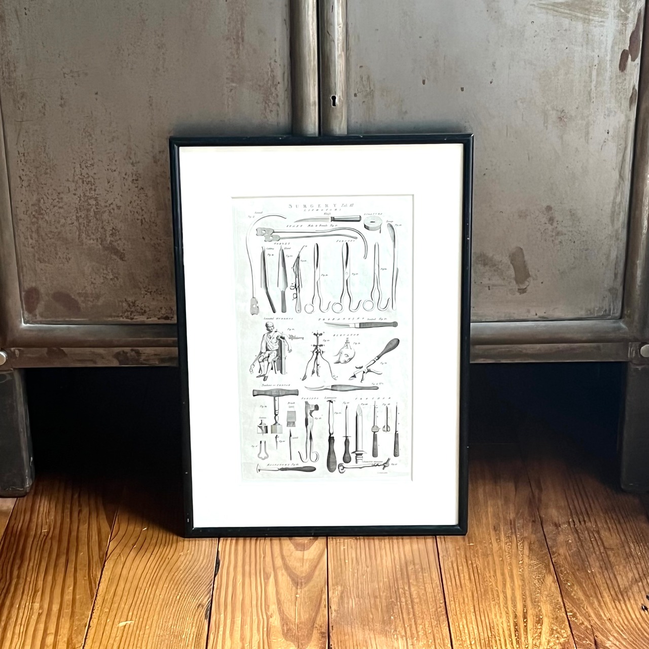 アメリカで買い付けた古い年代のSurgery Toolが描かれた額装になります。