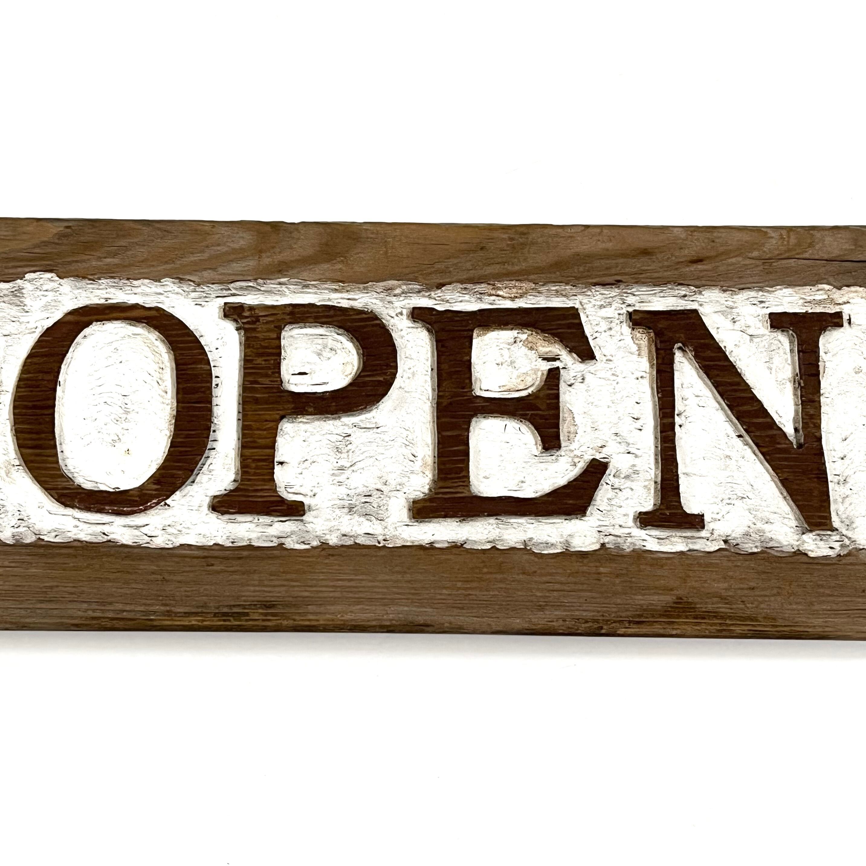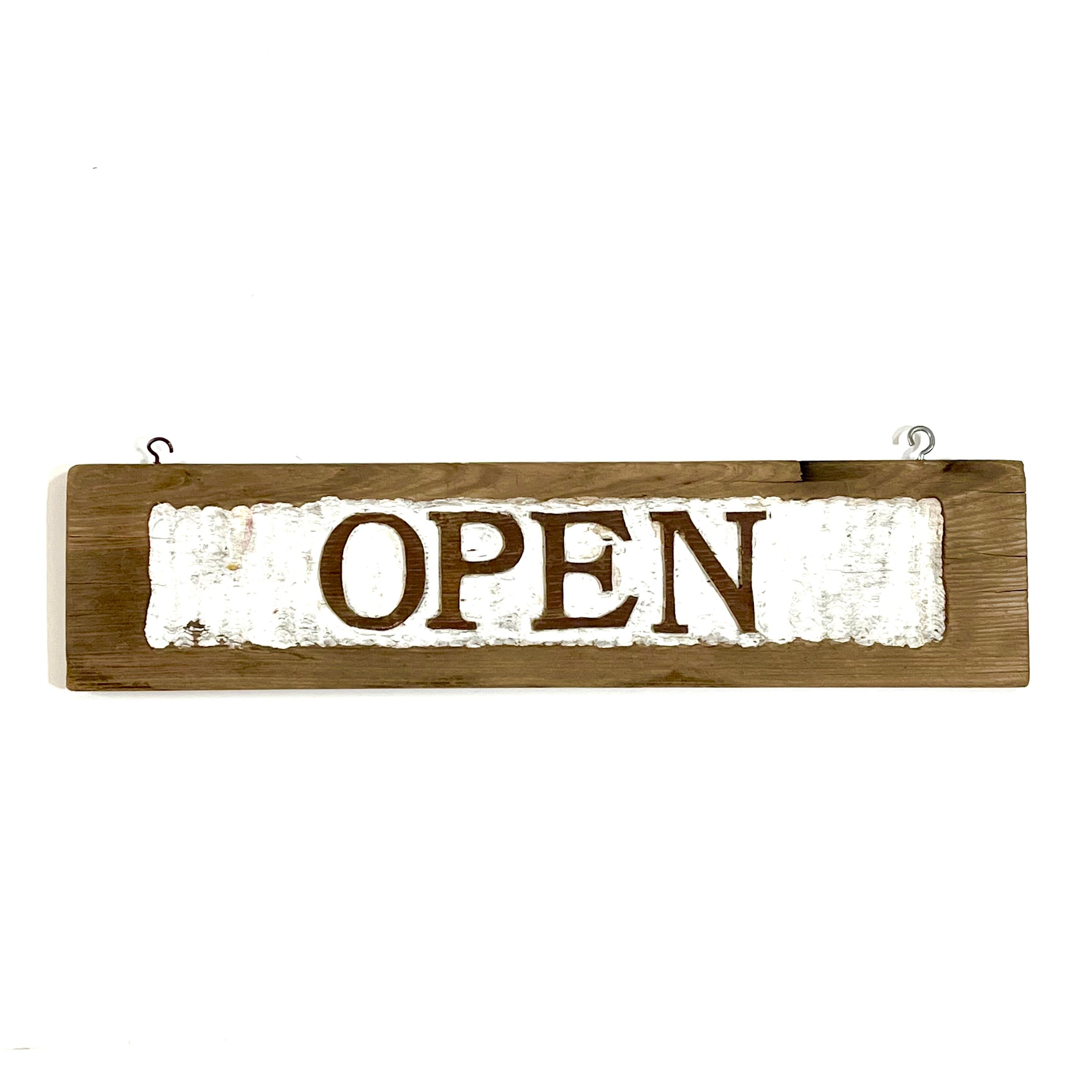 板を削り出した木製のハンドメイドのOpen / Closedサイン。