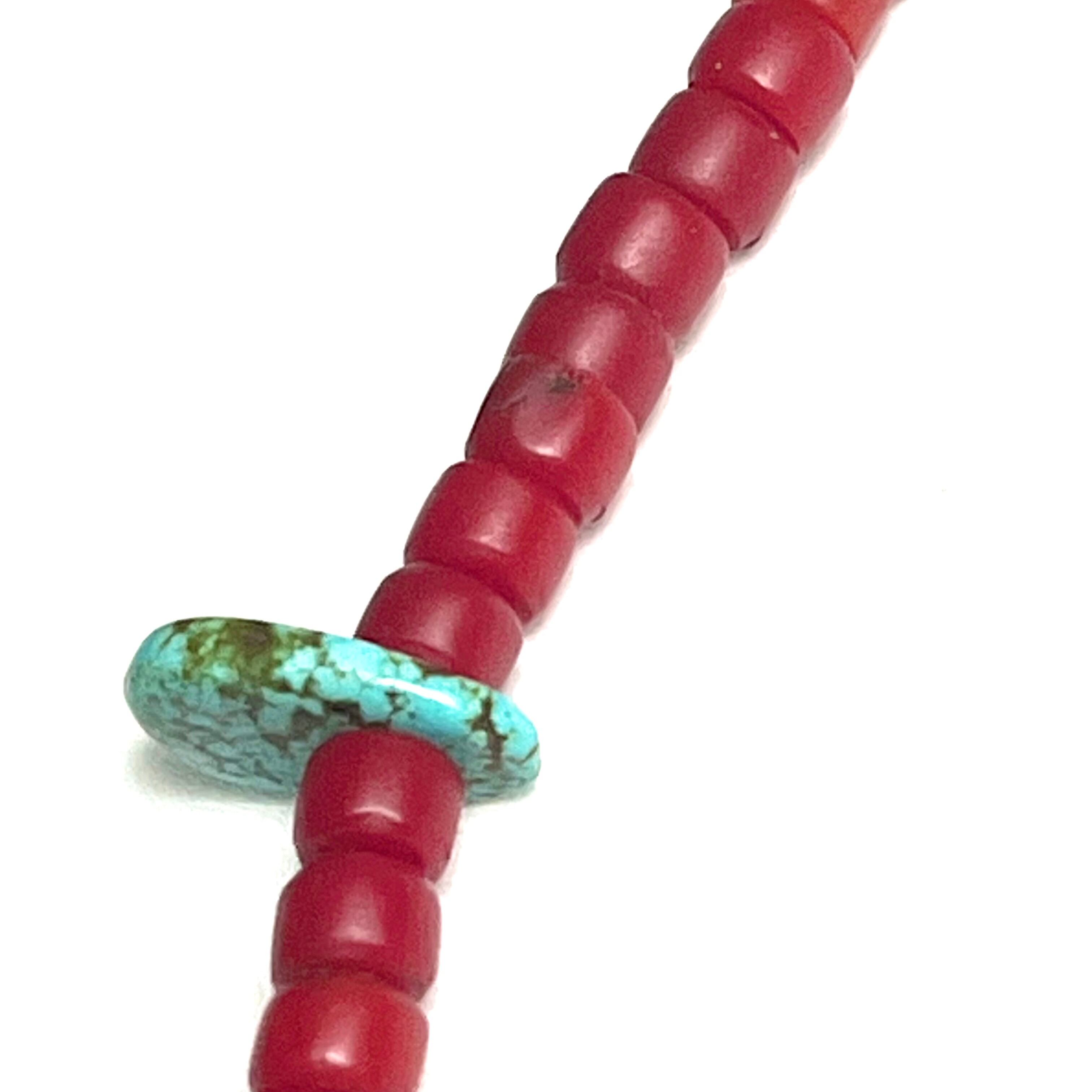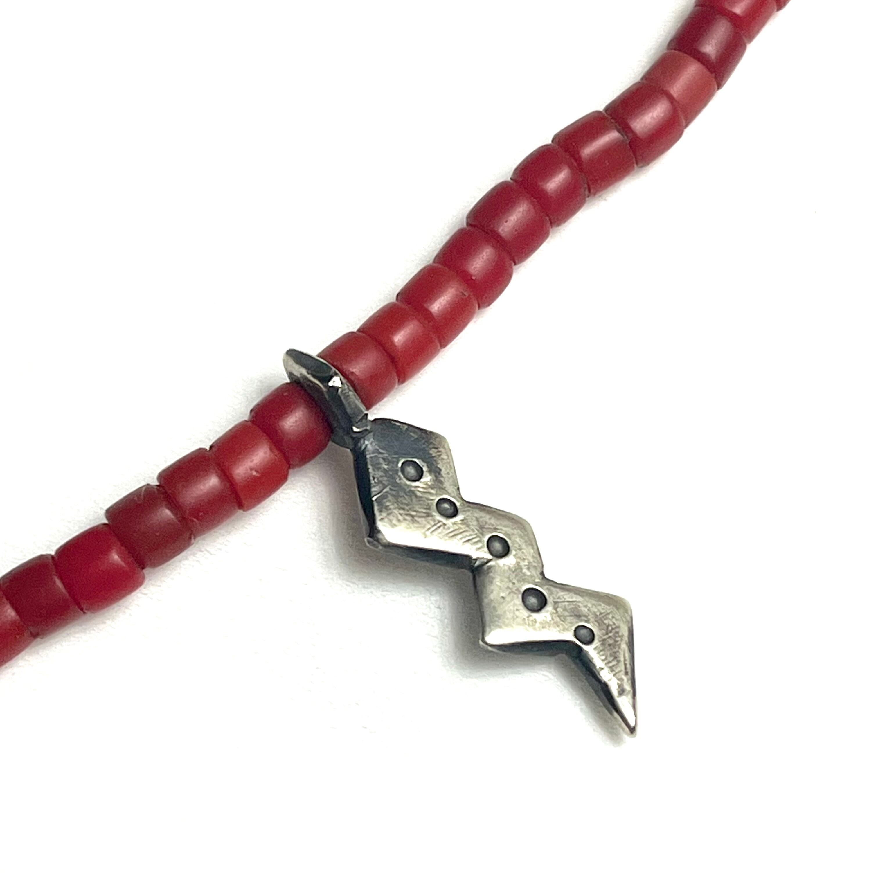 1800年代にネイティブアメリカンと取引されていた貿易用の北アフリカ産ビーズ(1840年頃から1900年頃)を使用し、トップにコイインシルバーを使用したナジャトップ、その上両サイドにはクロス、右クロス上にはヴィンテージのターコイズ、左クロス上にはライトニングと素晴らしいペンダントに仕上がっています。