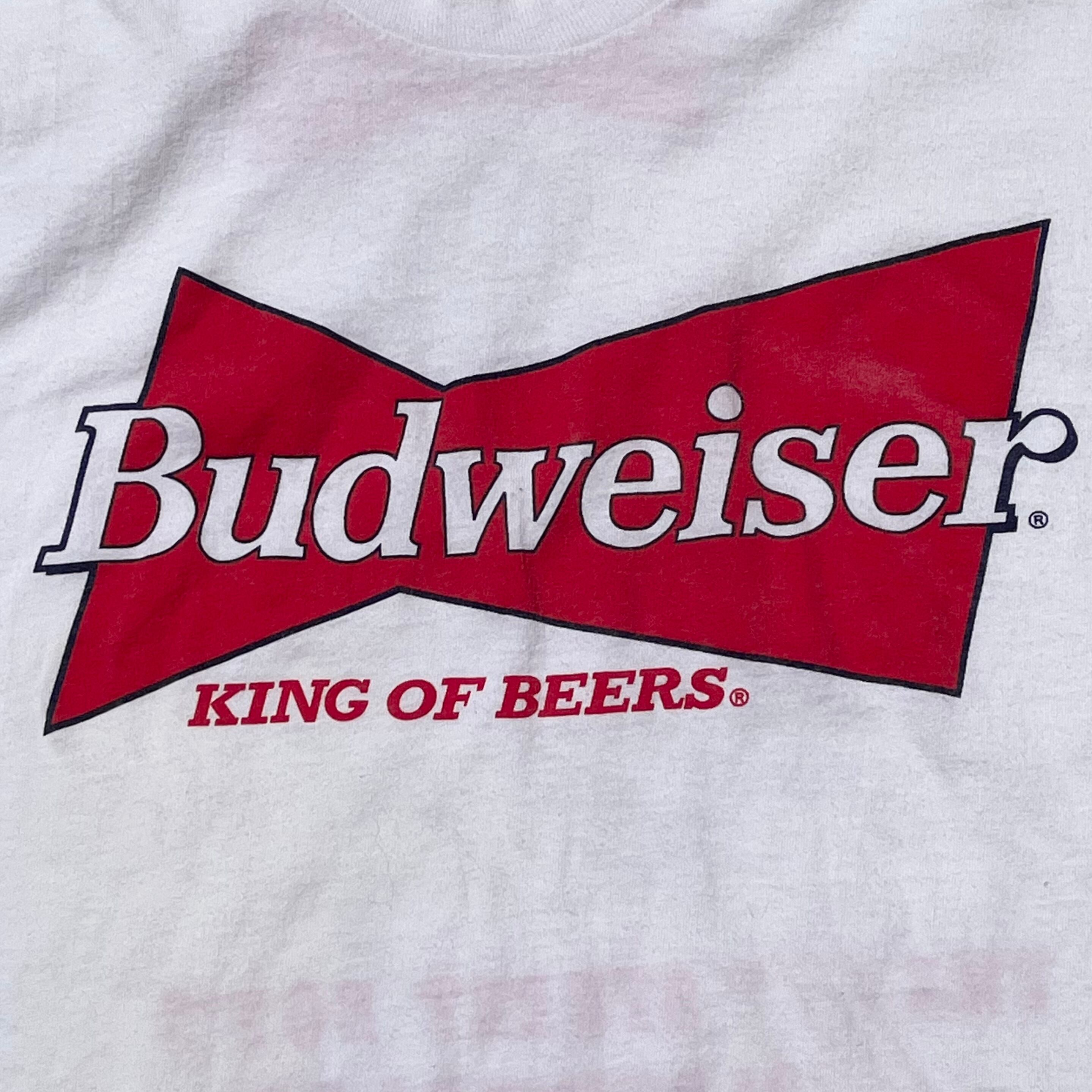 ホワイトにバドワイザーらしい赤のバドワイザーロゴのプリント、その下にはお馴染みの“KING OF BEERS”といかにもなプリントです。