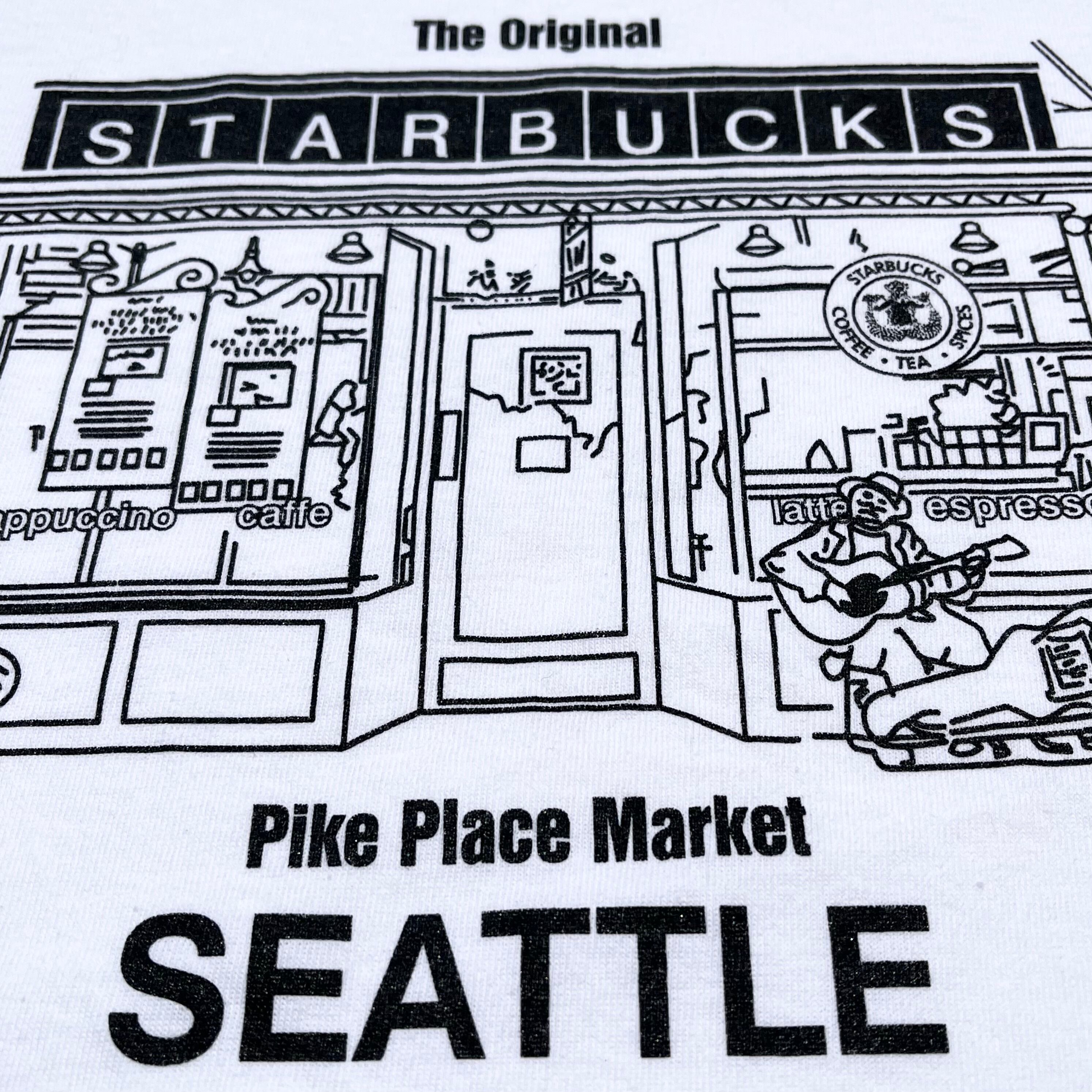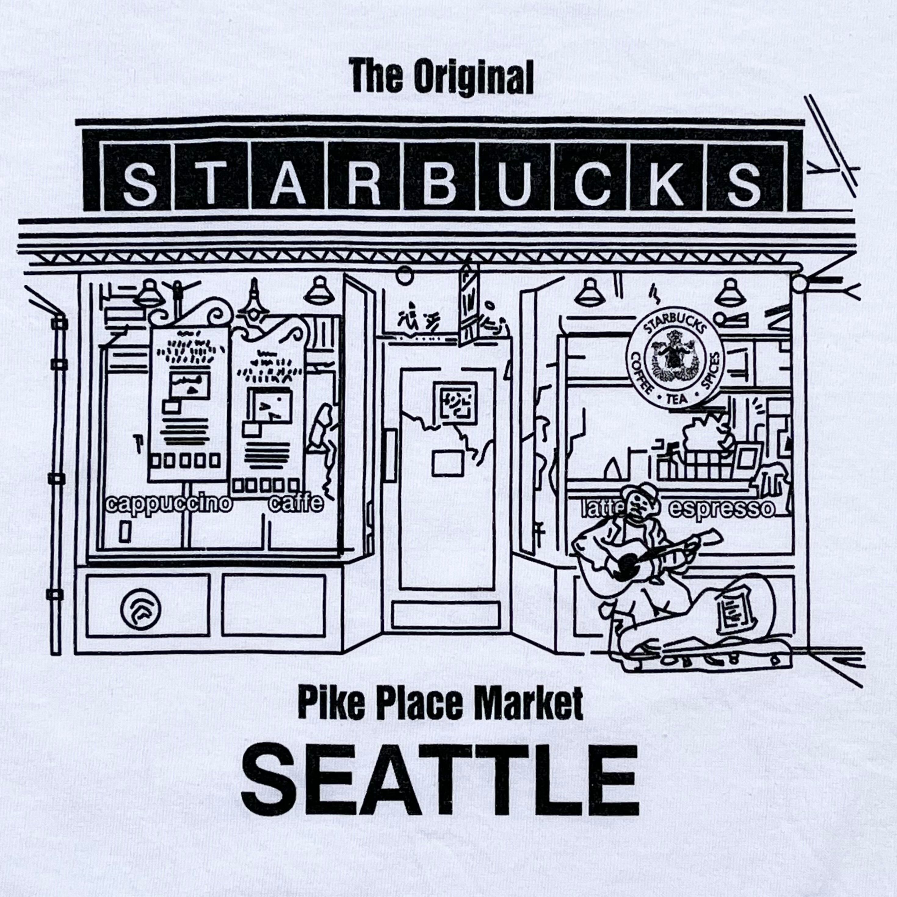スターバックス初のお店、シアトルのパイクプレイスマーケットにあるスターバックス1号店のスーベニアTシャツ。