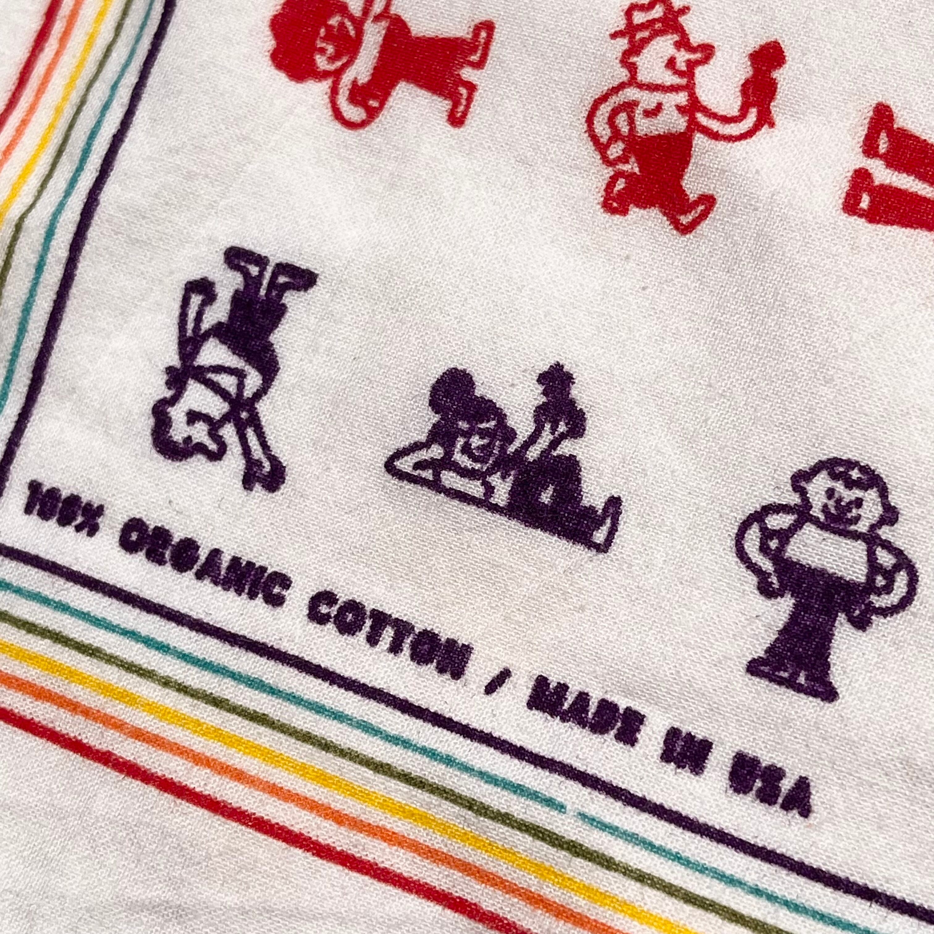 1990年代のREIの雰囲気が伝わってくるカラフル、そして“Outside with Pride”アウトドアカンパニーらしいキャッチフレーズ、素材はオーガニックコットンと最高のバンダナです。