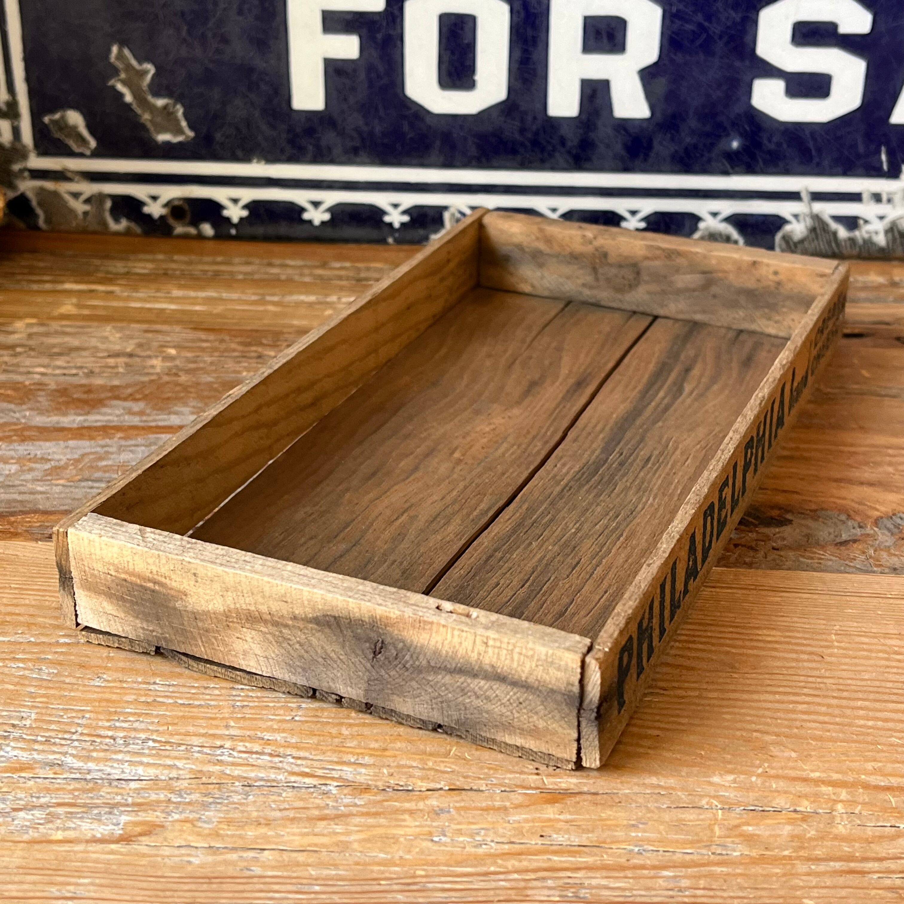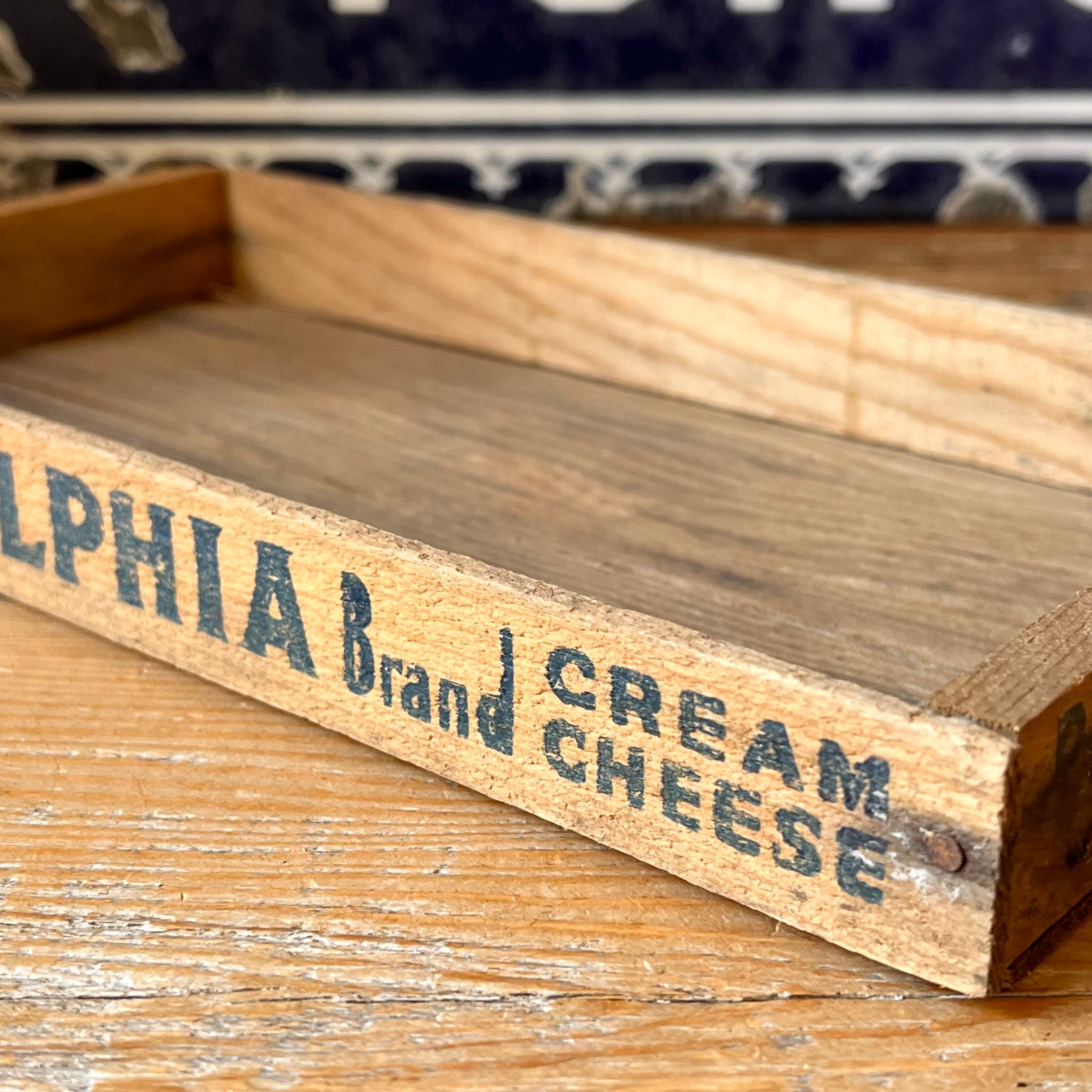 PHILADELPHIA Brand CREAM CHEESE の文字、使い込まれた木製ならではの味のある雰囲気がまた格別で、汚れ、クギの錆などのエイジングがより一層雰囲気を盛り上げてくれています。